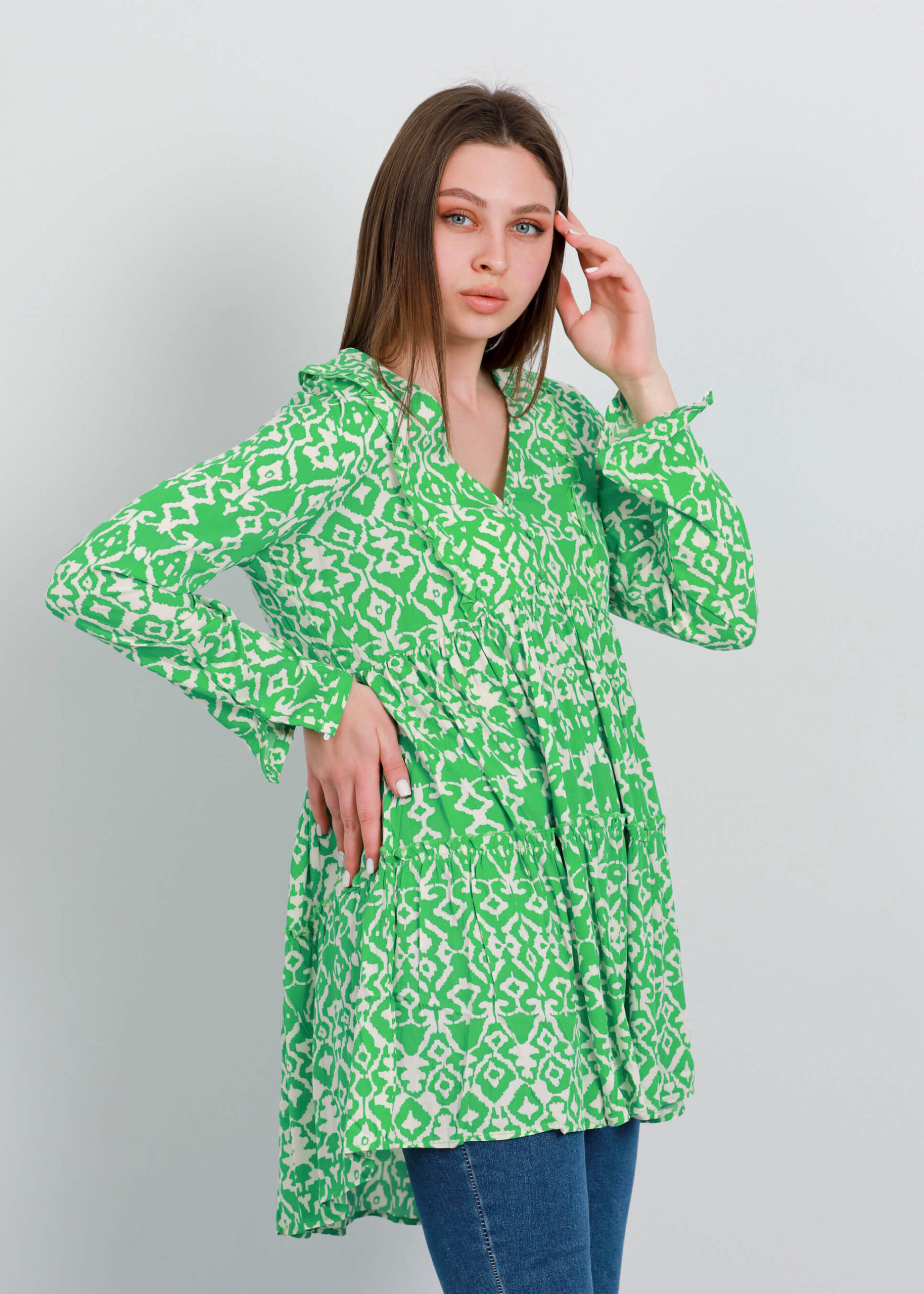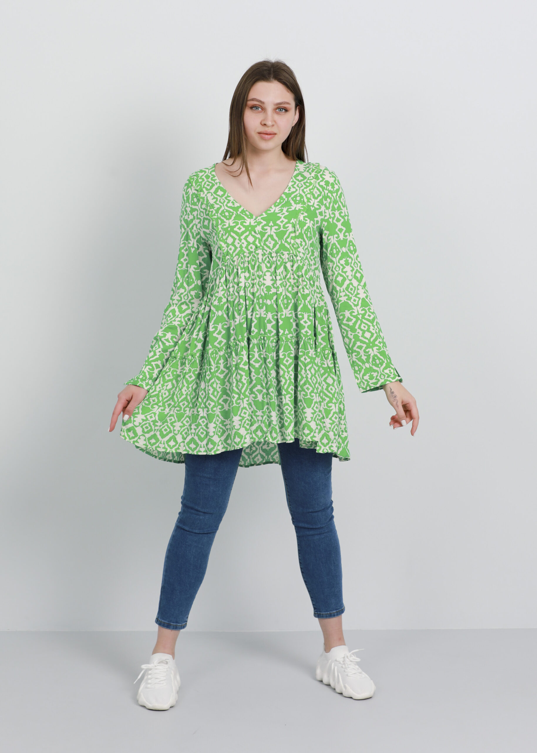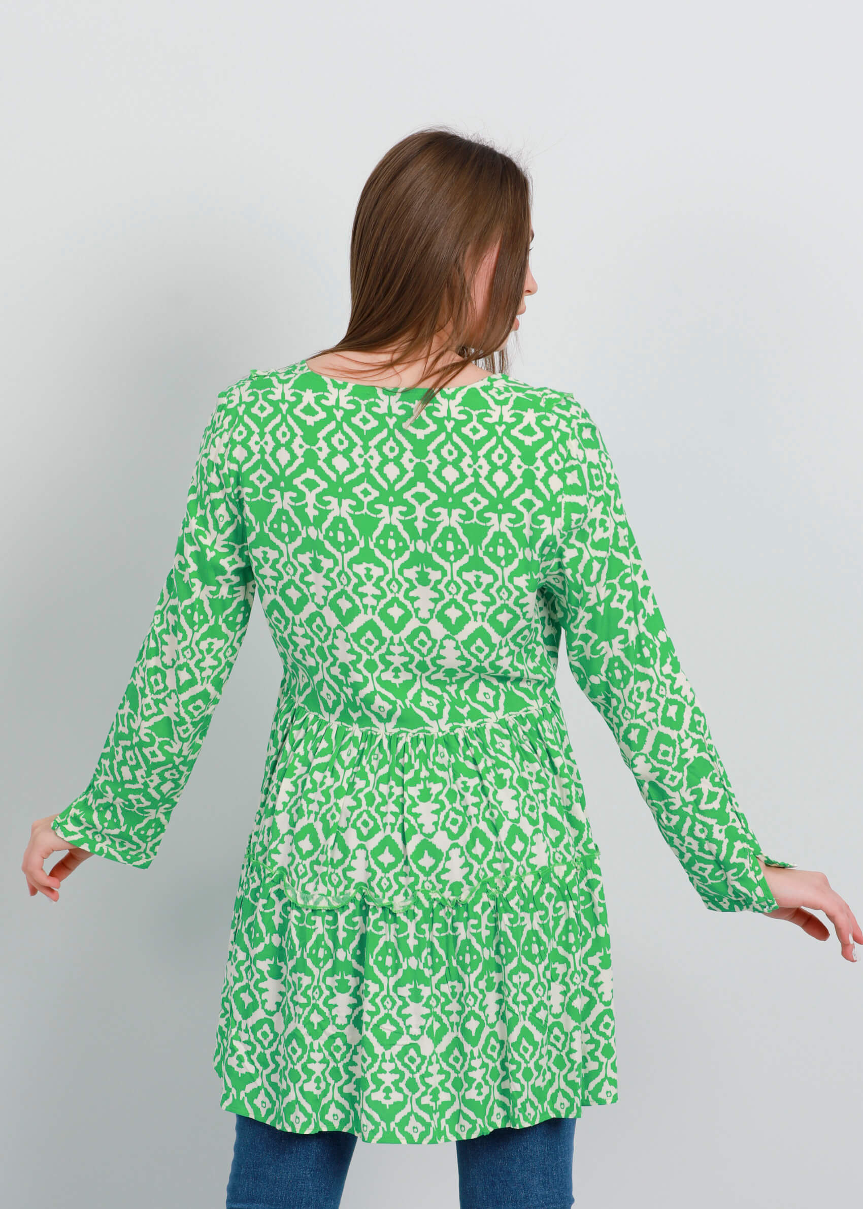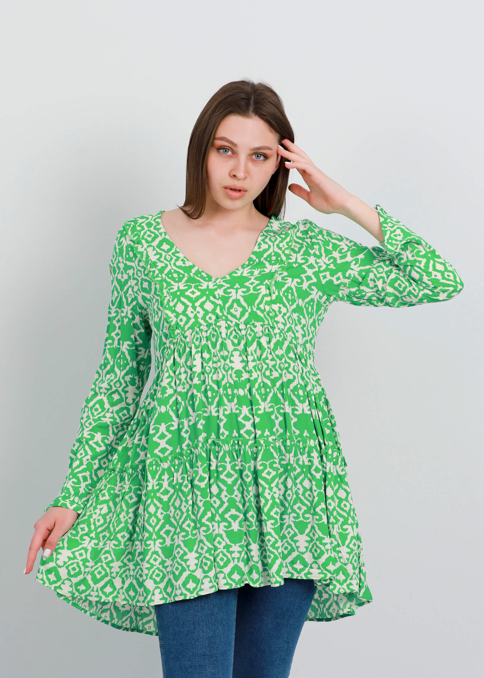بلوزة ستاتي, طويلة, تصميم معرق, طبقات كشكش, ياقة سبعة, اكمام طويلة مع زر للاغلاق, تصميم كشكش من الامام, 100% ريون