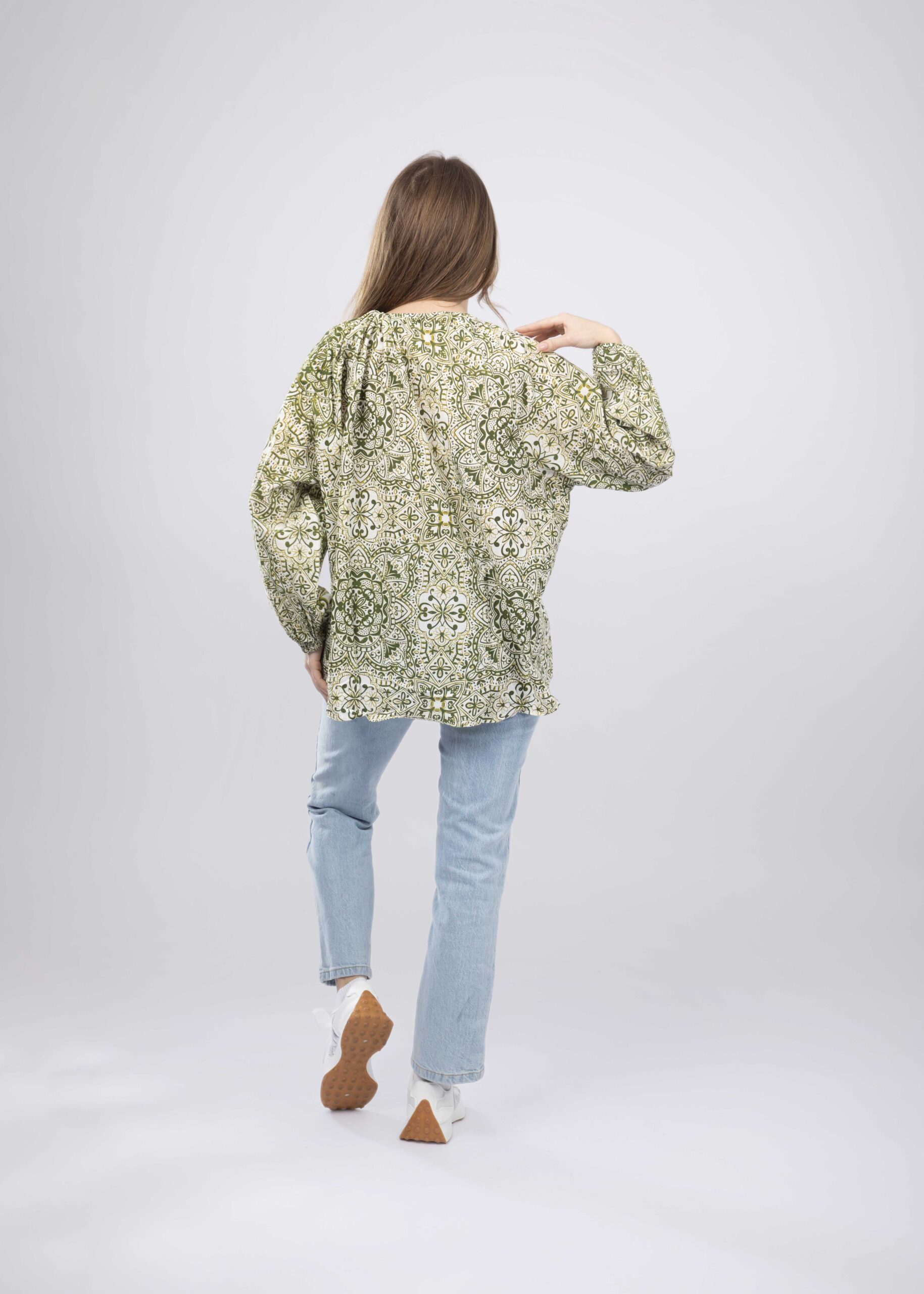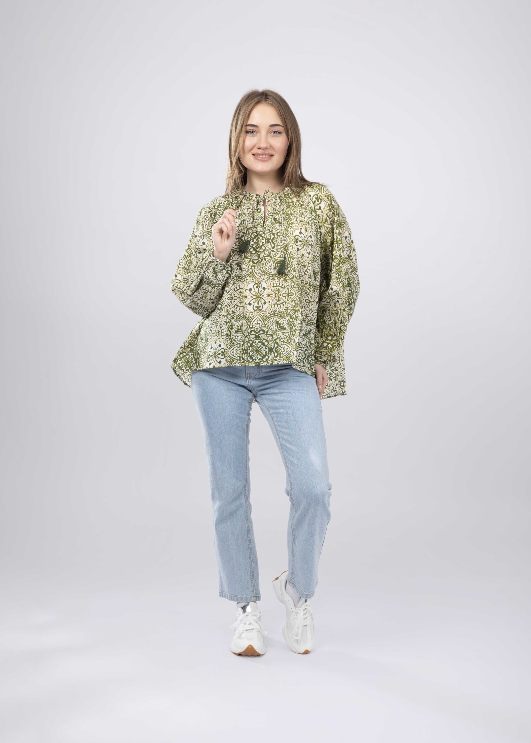 بلوزة نسائي, معرقة, اكمام طويلة مع معصم ضيق, ياقة مدورة مع حبل للربط من الامام, انيقة وعملية