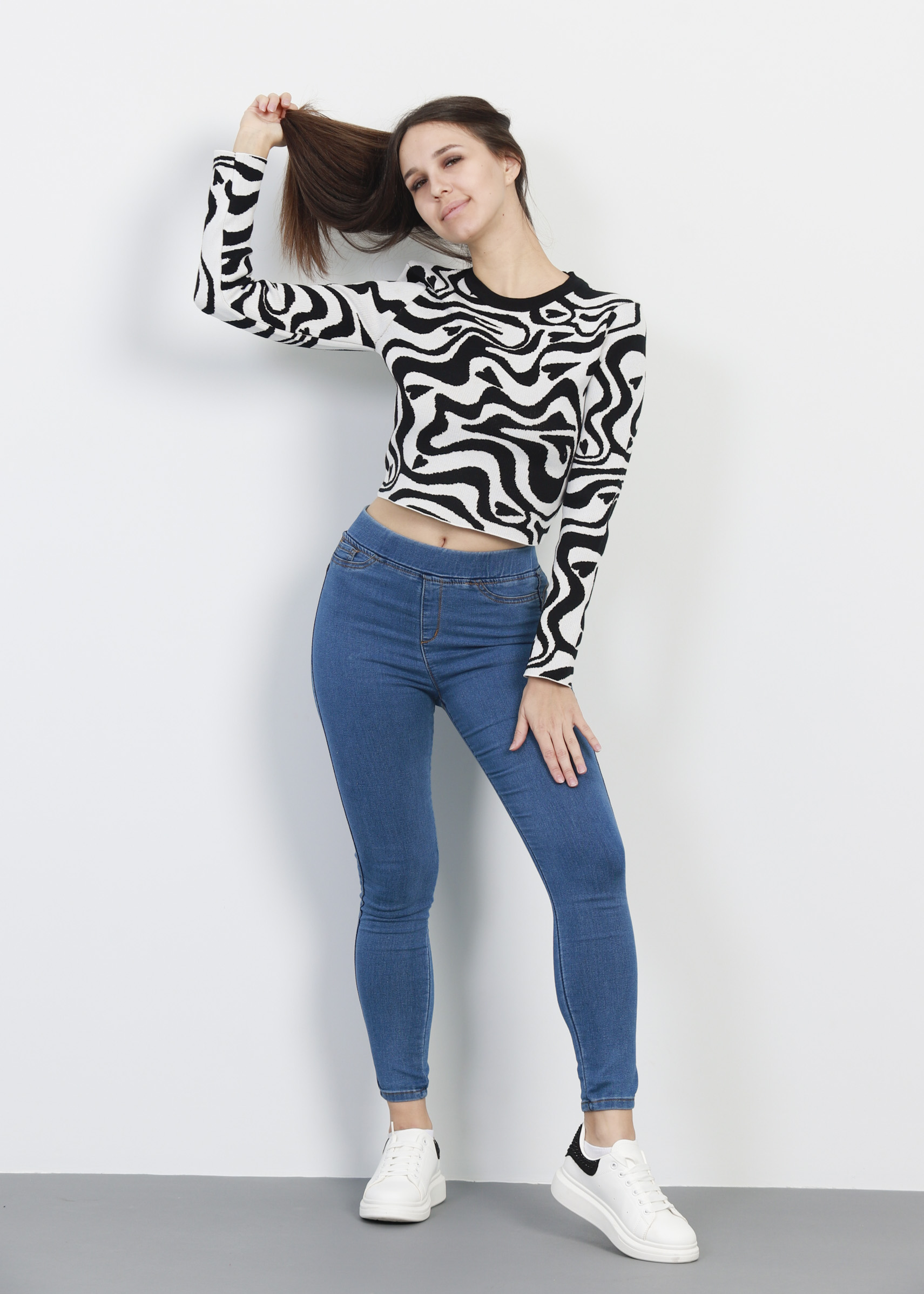 بلوزة نسائي, تصميم محبوك, معرق, لونين, قصيرة, اكمام طويلة, ياقة مدورة, انيقة وعصرية, 100% قطن