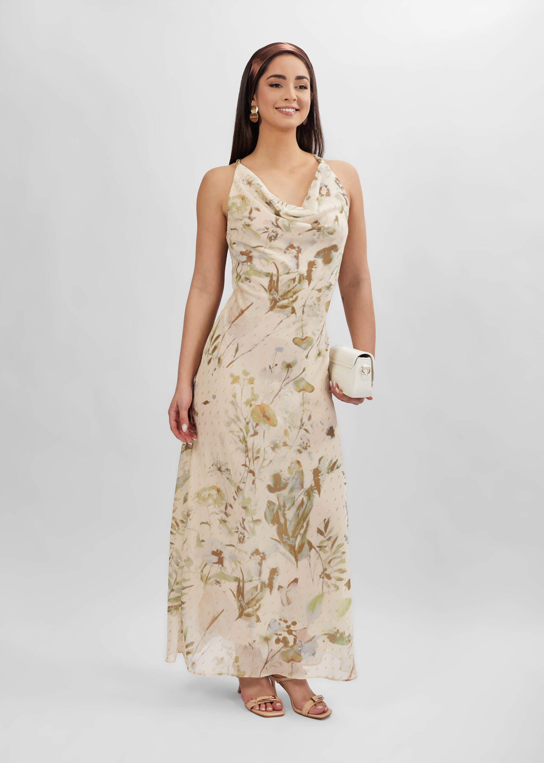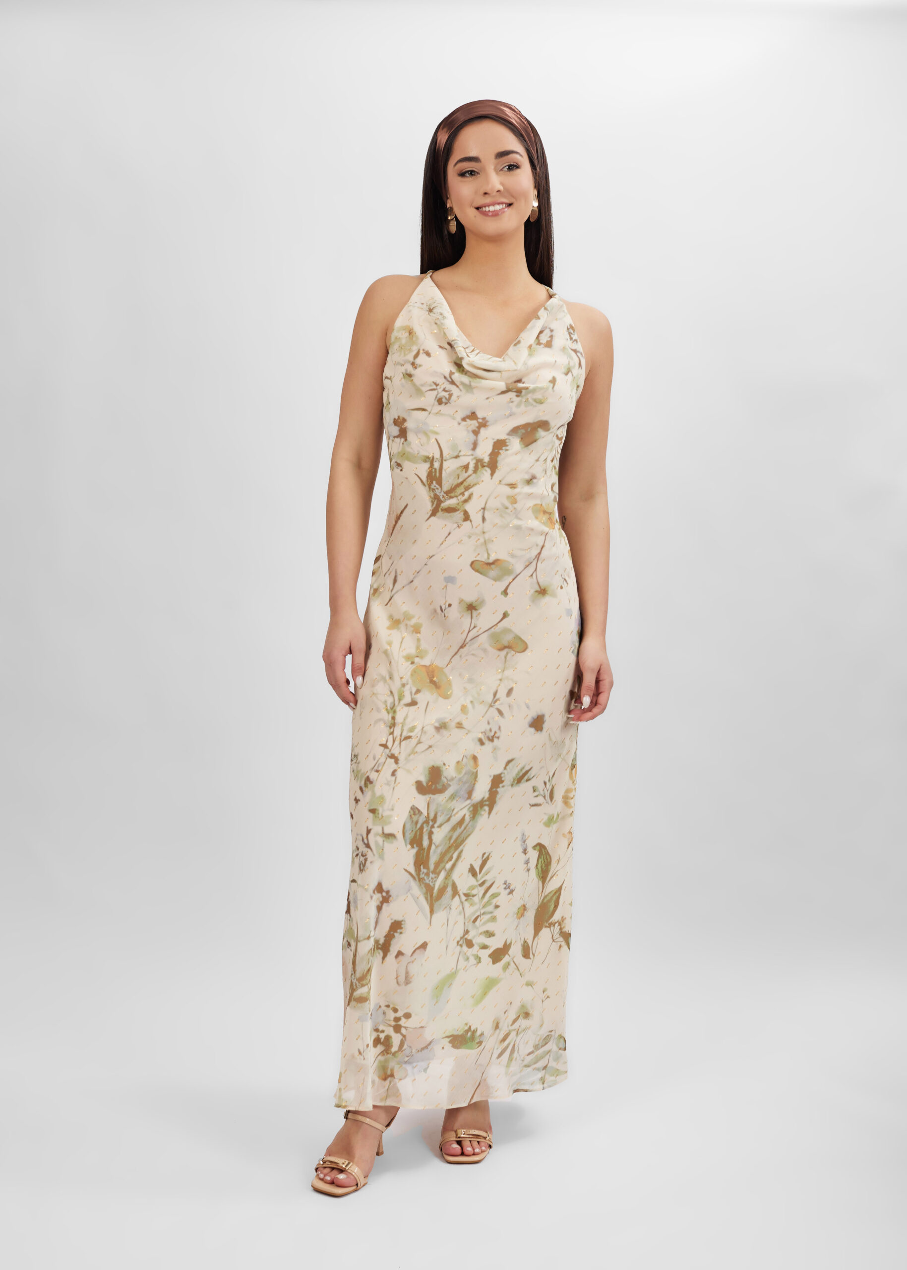 فستان نسائي, طويل, معرق, بدون اكمام, ياقة بثنيات, سحاب من الخلف للاغلاق, تصميم متقاطع من الخلف, انيق وعصري