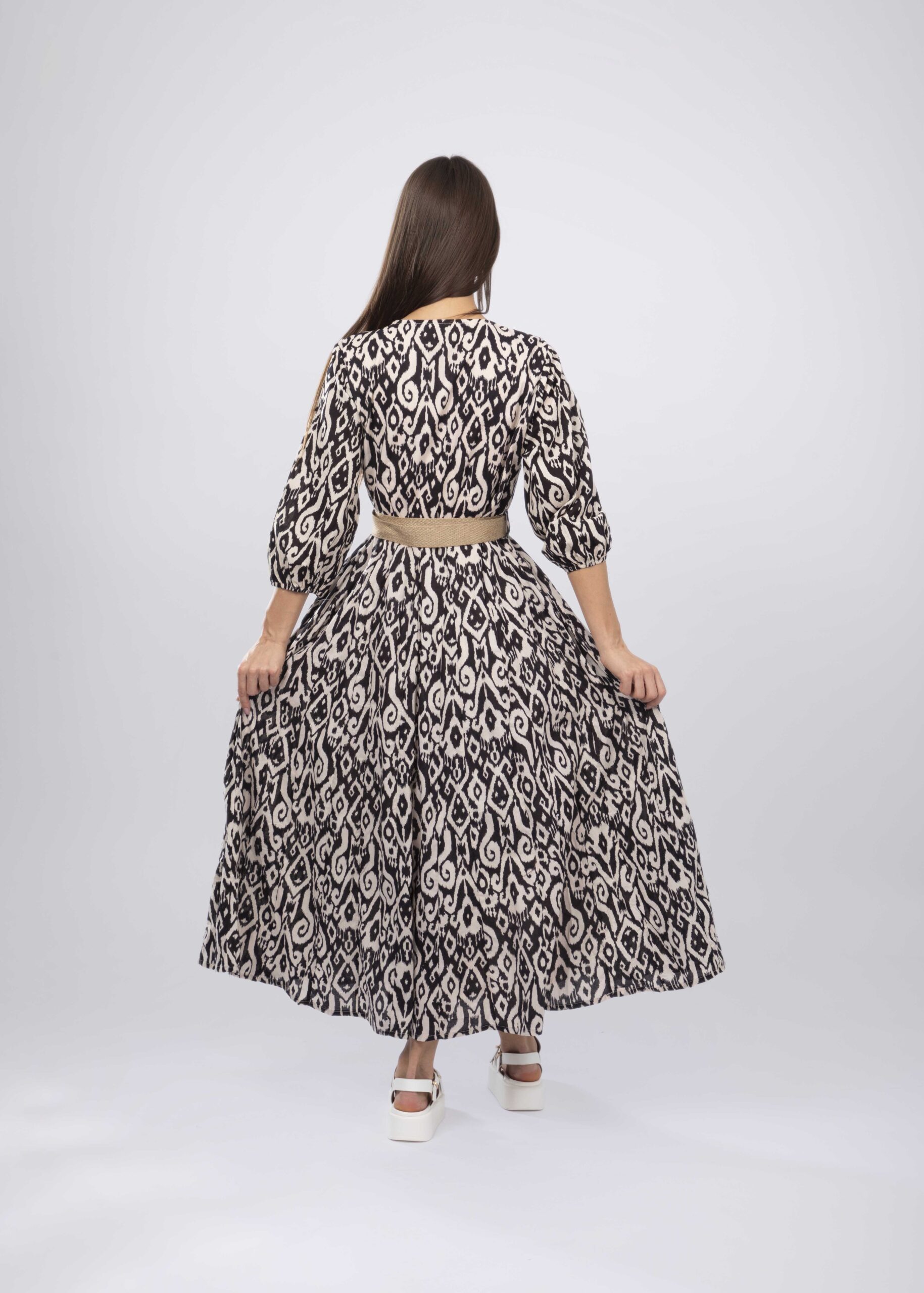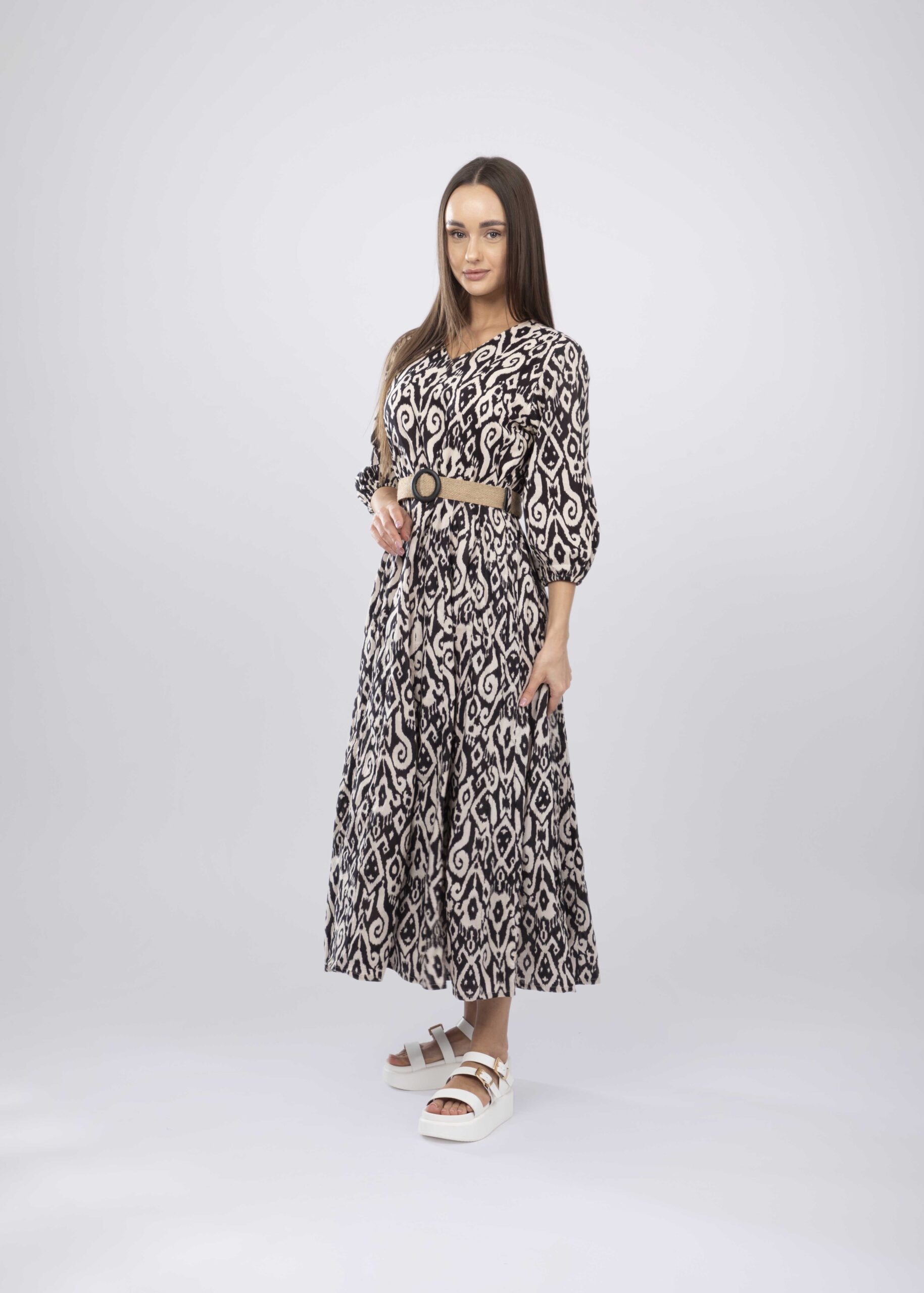 فستان نسائي, طويل, معرق, طبقات, ياقة سبعة, اكمام طويلة مع معصم ضيق, حزام خصر, انيق وعملي
