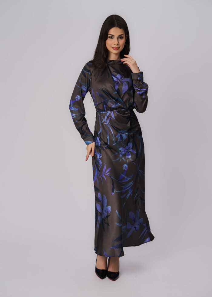 فستان نسائي, طويل, معرق, ياقة مرتفعة مع زر من الخلف, اكمام طويلة, تصميم ملتف مع ثنيات من الجانب, انيق وعصري