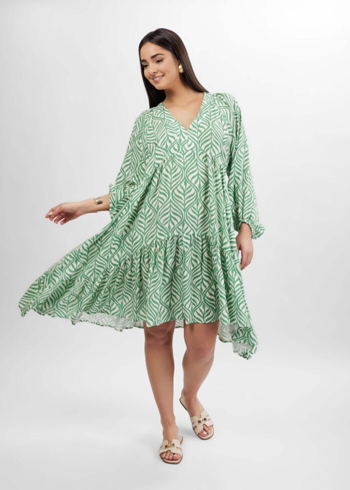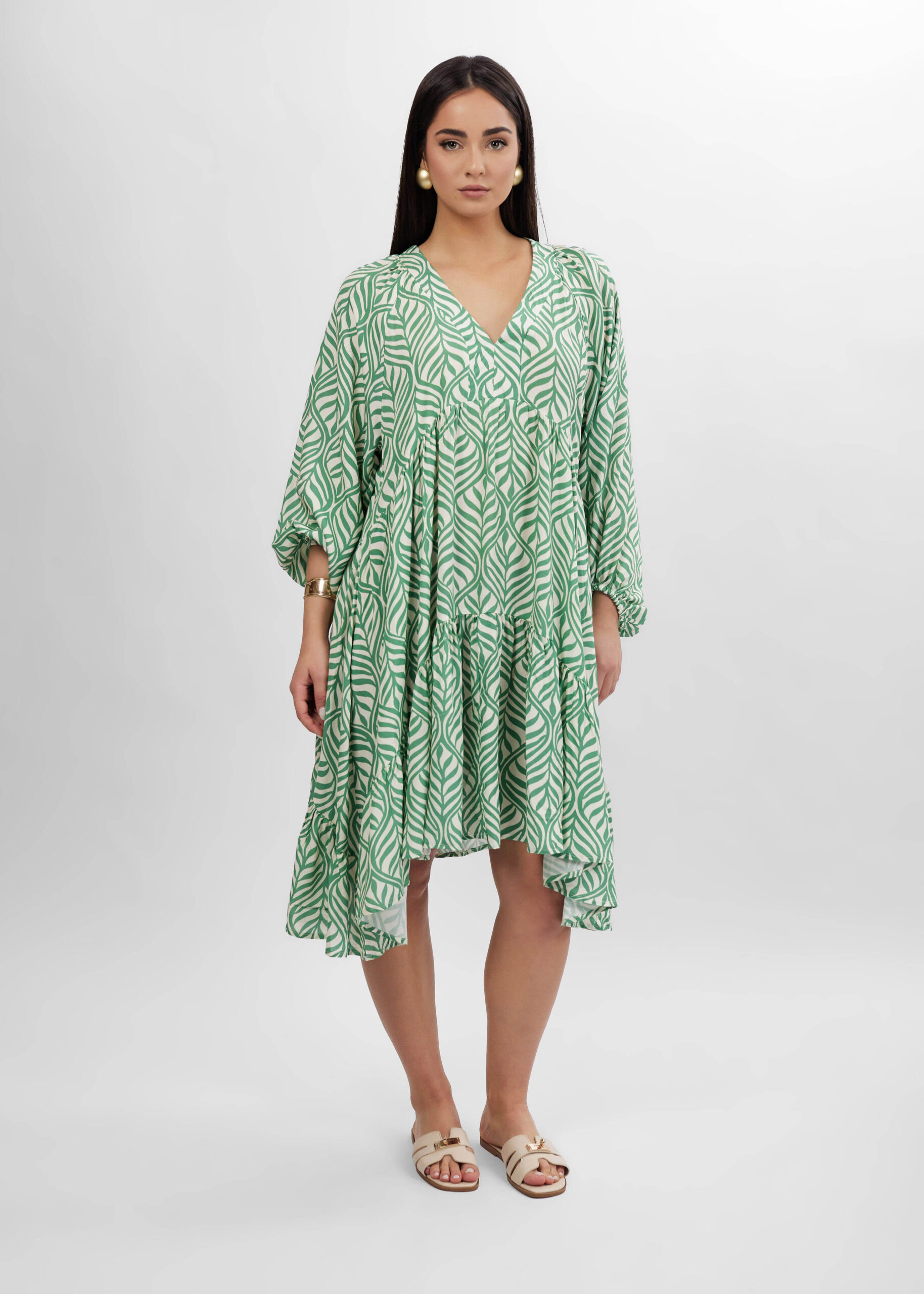 فستان نسائي, قصير, معرق, اكمام طويلة, ياقة سبعة, كشكش, طول متفاوت, انيق وعصري