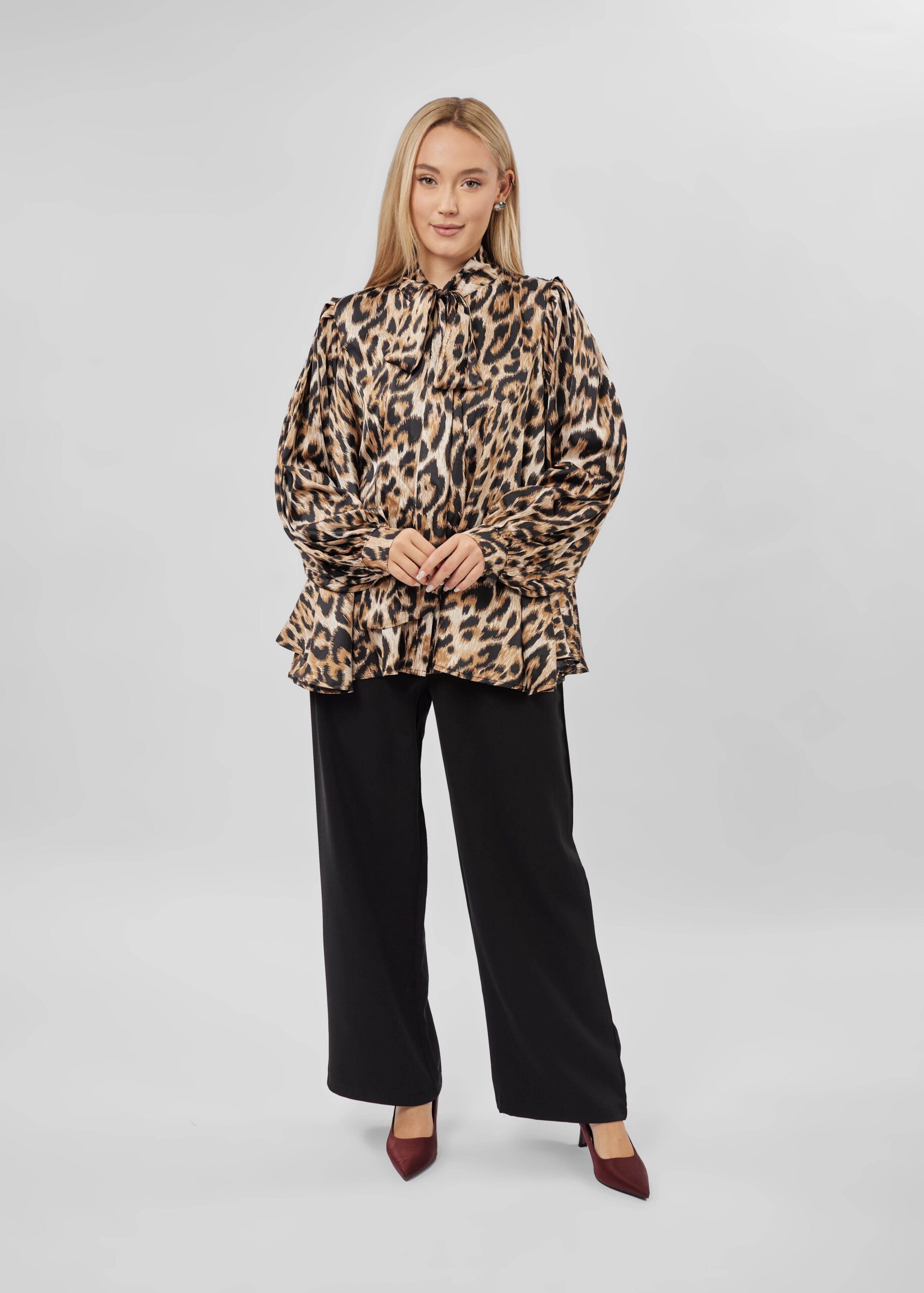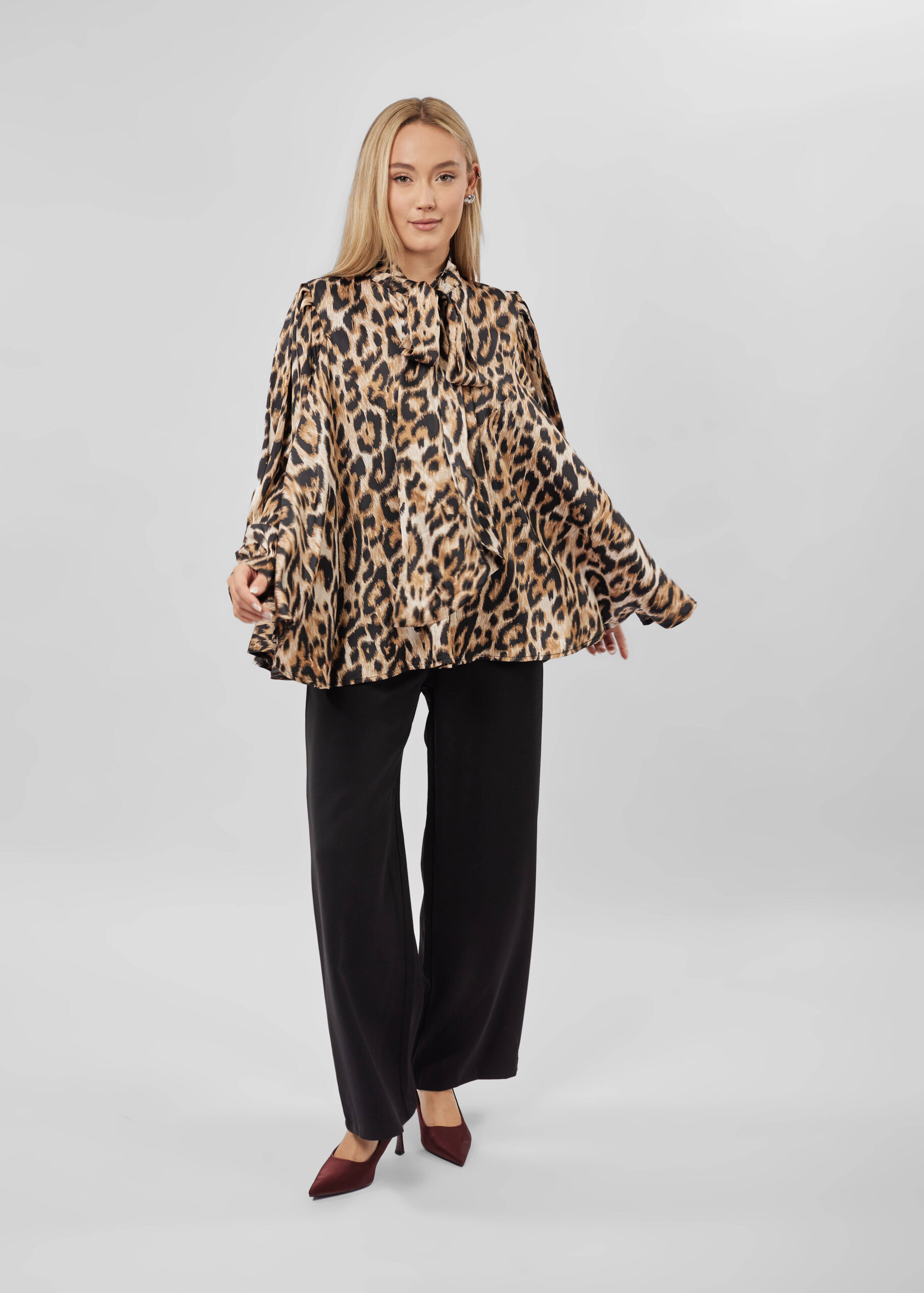 Women shirt, wide, printed, round neck with front tie, front buttons to close, long wide sleeves with tight cuff, unique and modern