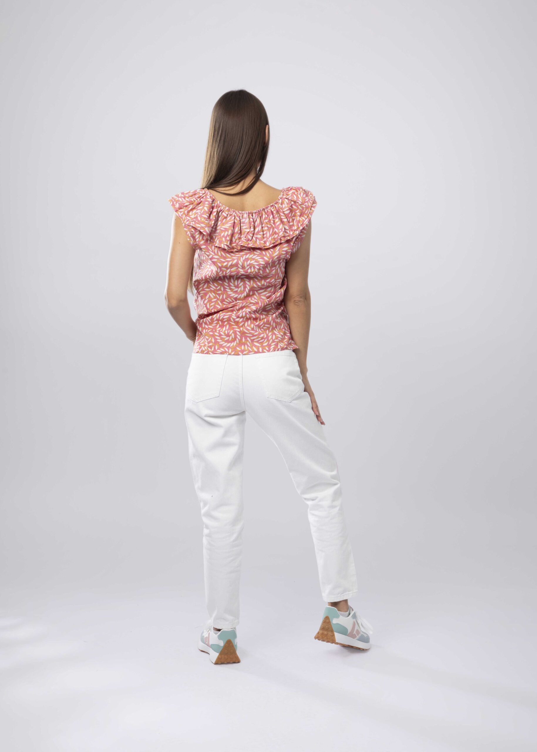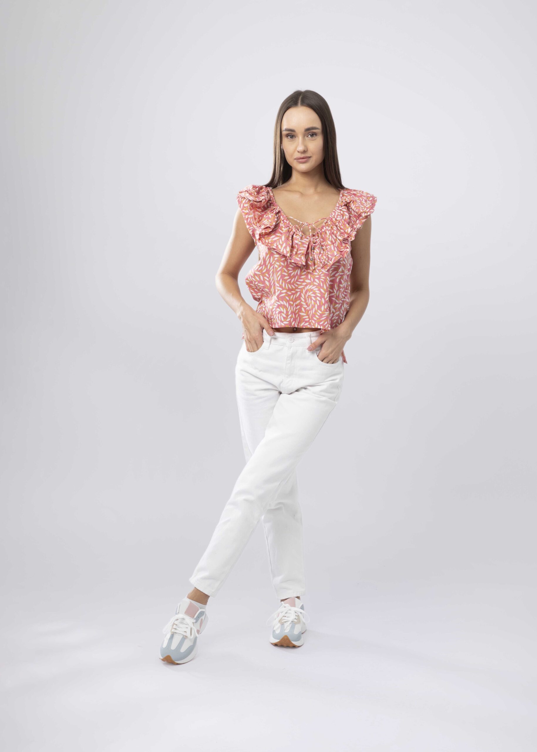 بلوزة نسائي, مزينة بكشكش, بدون اكمام, ياقة سبعة مع حبال للربط من الامام, انيقة ومناسبة مع عدة تنسيقات
