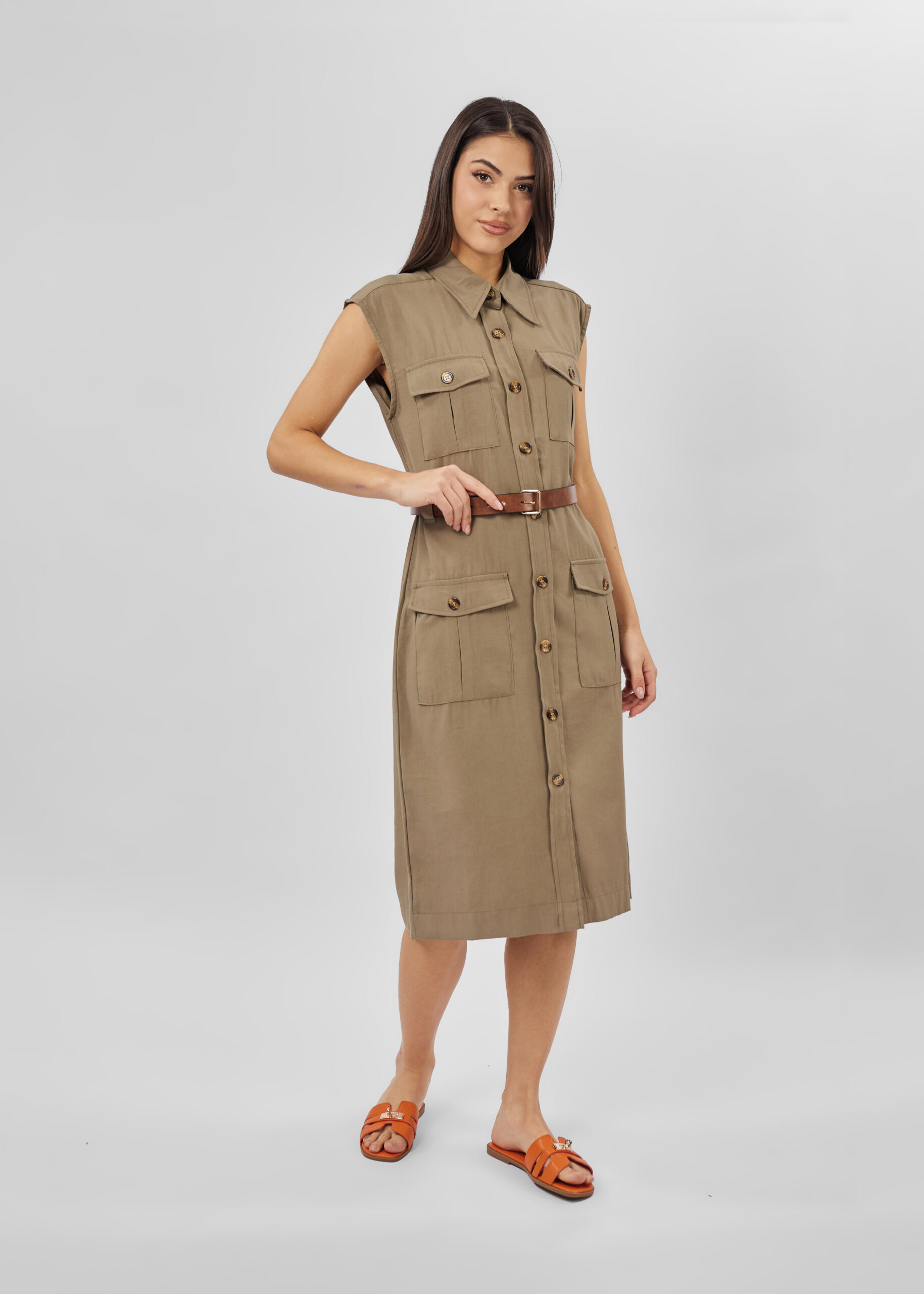 فستان نسائي, قصير, بدون اكمام, ياقة مثنية, ازرار من الامام للاغلاق, جيوب امامية, حزام خصر, انيق وعصري