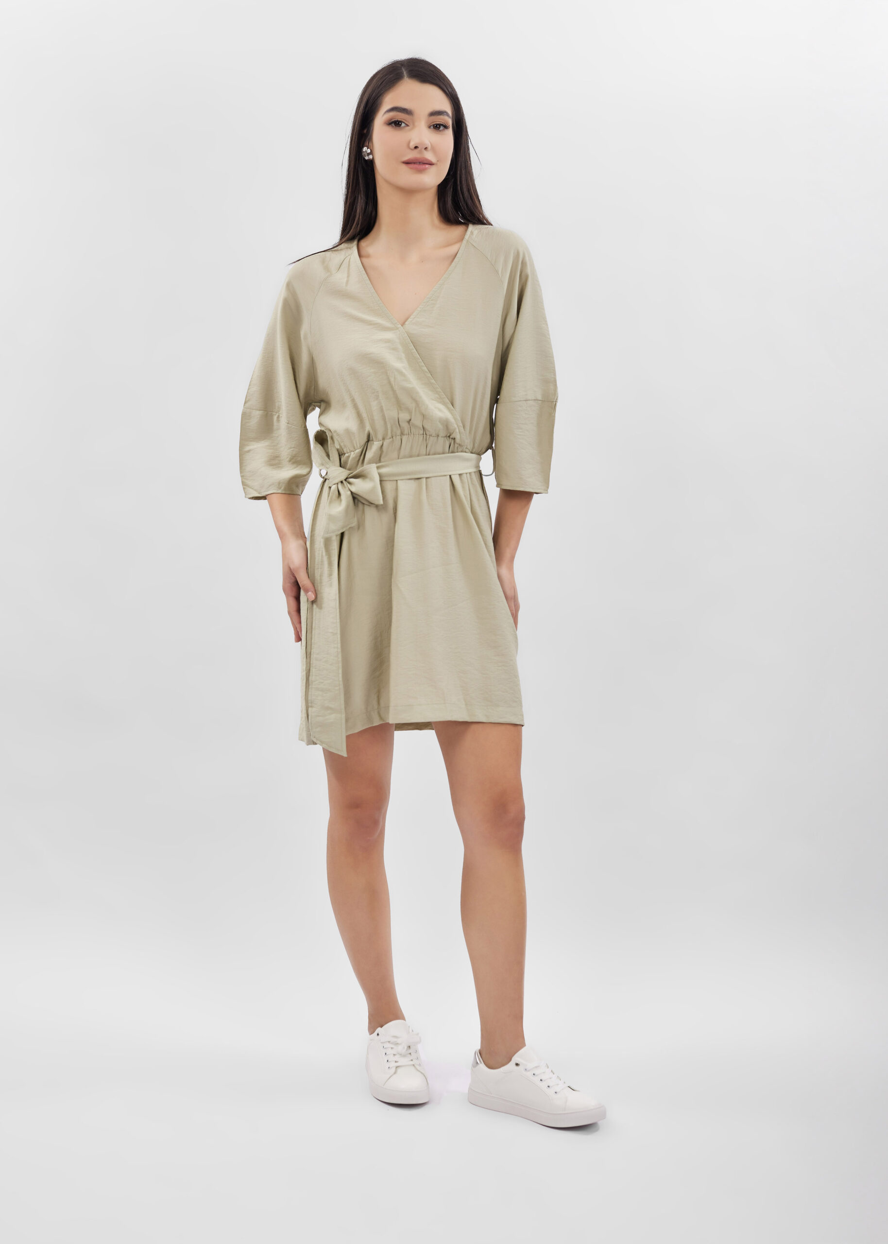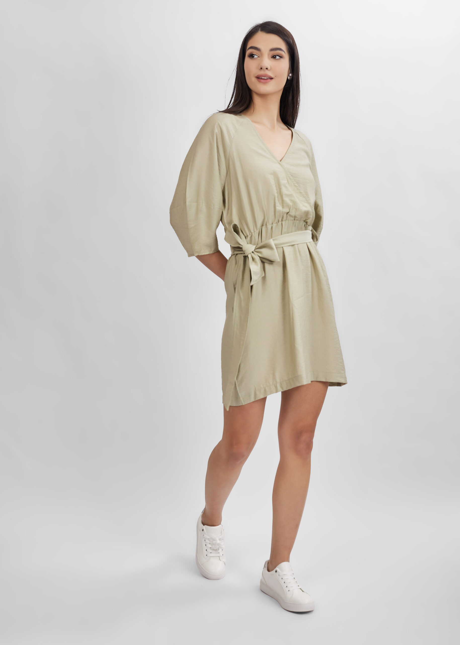 فستان نسائي, قصير, خصر مطاطي مع حزام للربط, اكمام قصيرة, ياقة سبعة, انيق وعصري