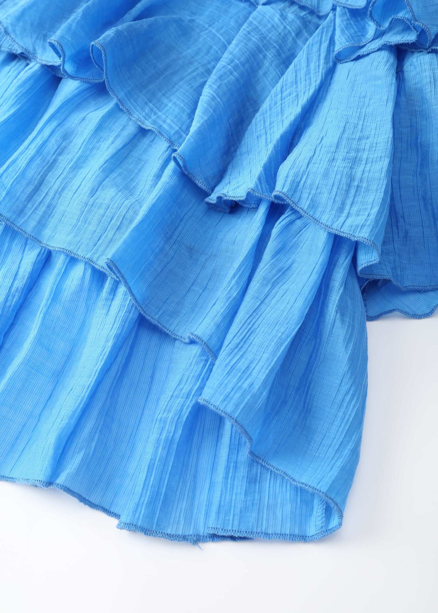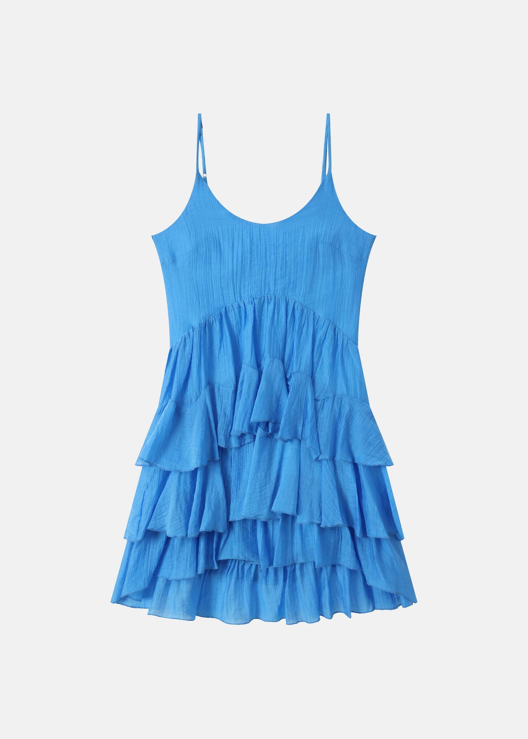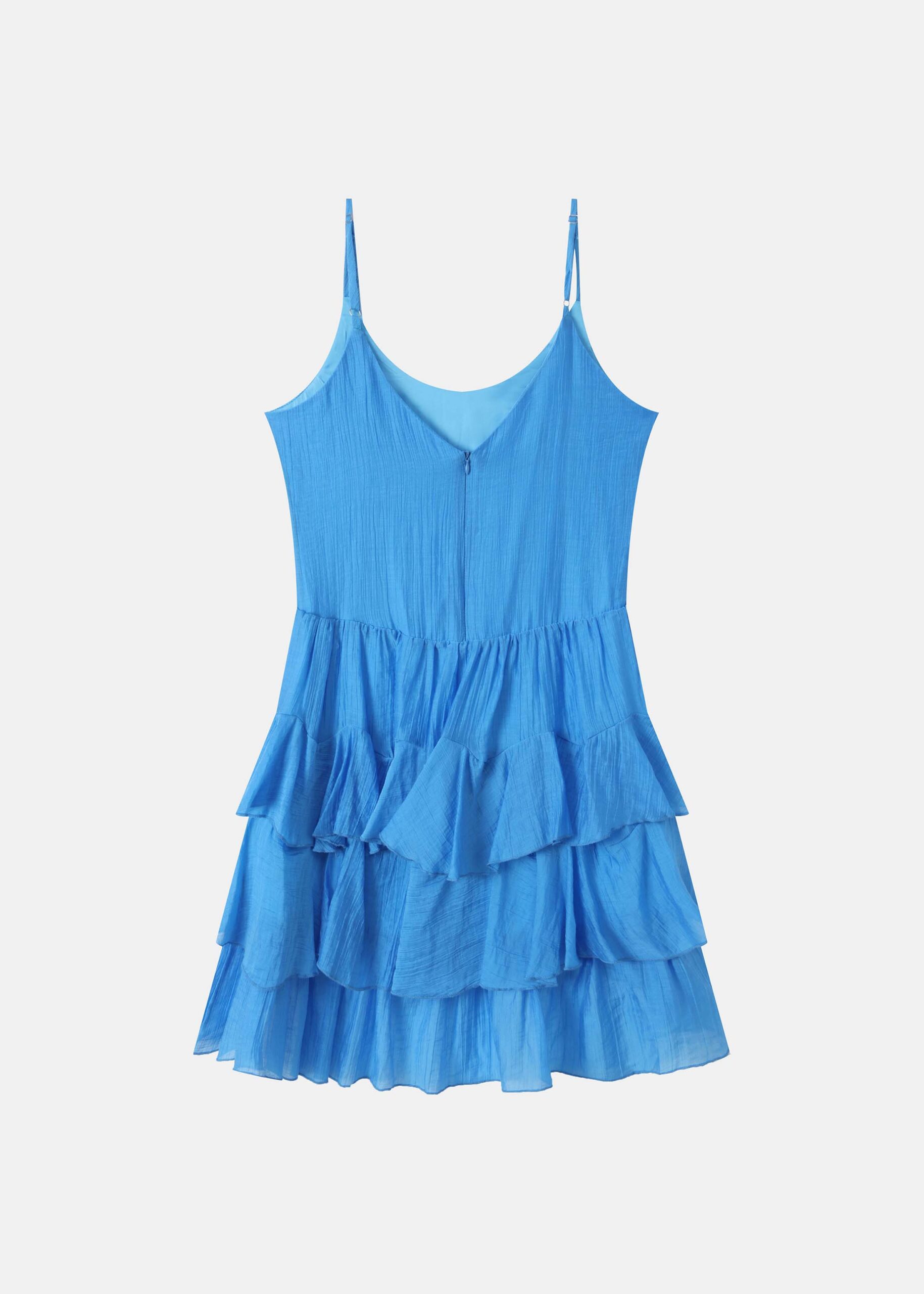 فستان نسائي, قصير, طبقات كشكش, ياقة مدورة, بدون اكمام, اشرطة كتف قابلة للتعديل, سحاب من الخلف للاغلاق, انيق وعصري