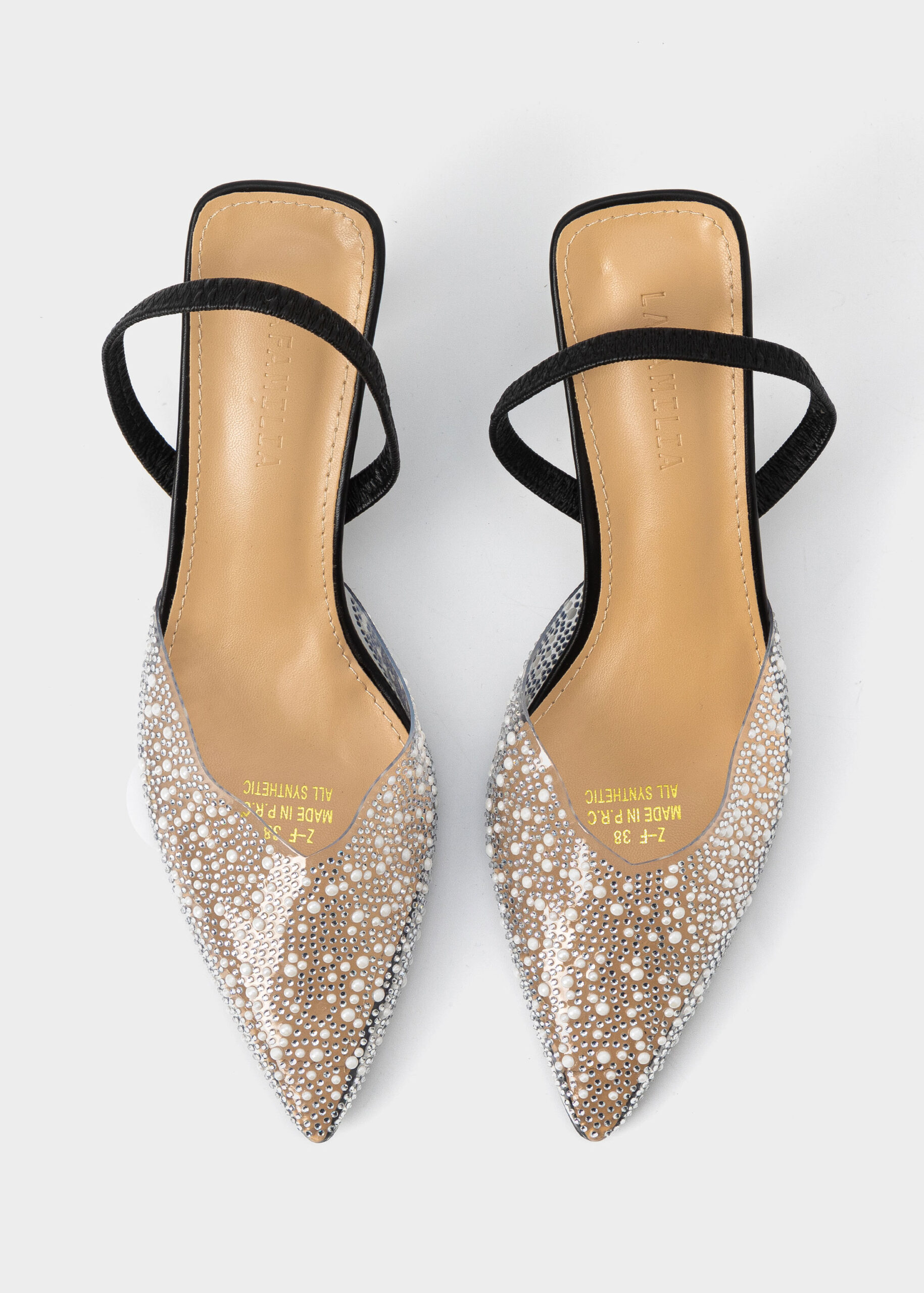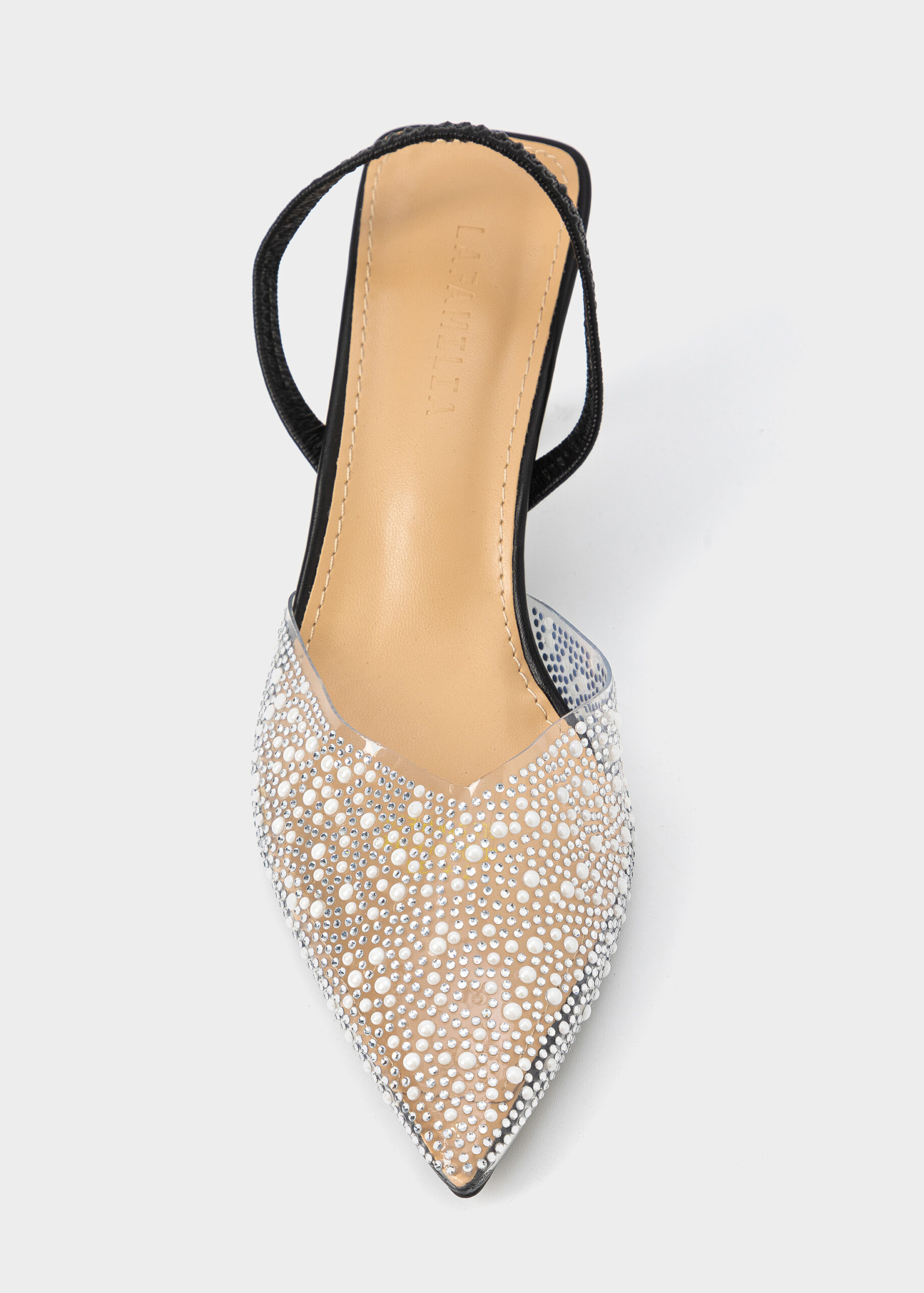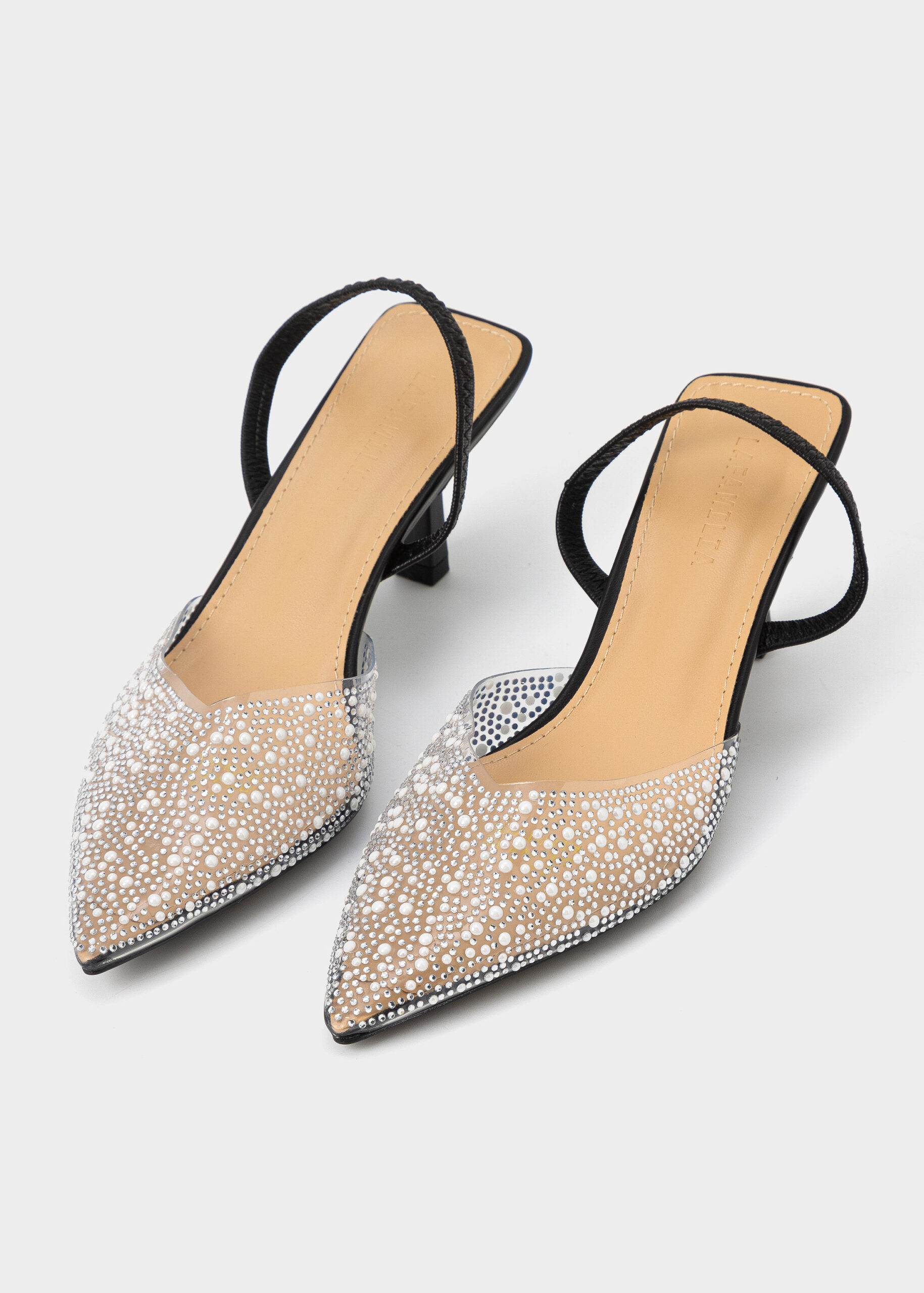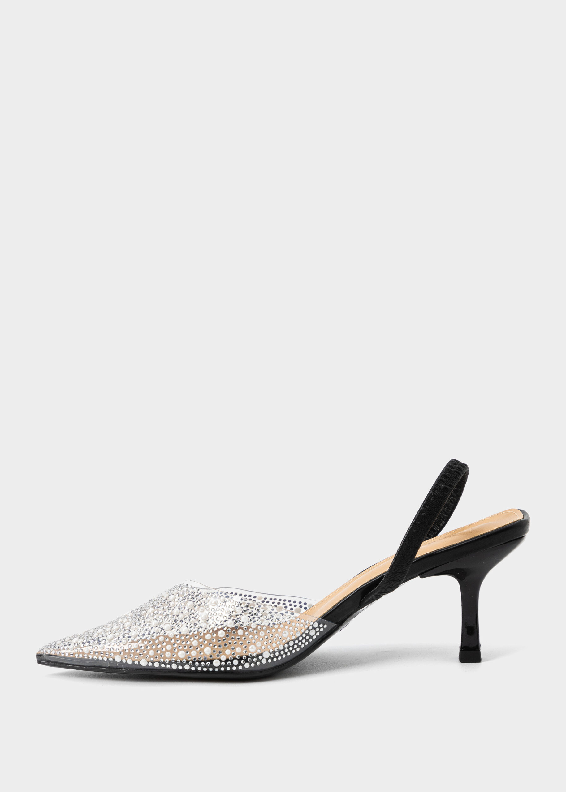 صندل نسائي, كعب, شفاف مزين بالستراس واللؤلؤ, مقدمة مدببة, شريط كاحل مطاطي, انيق وعصري