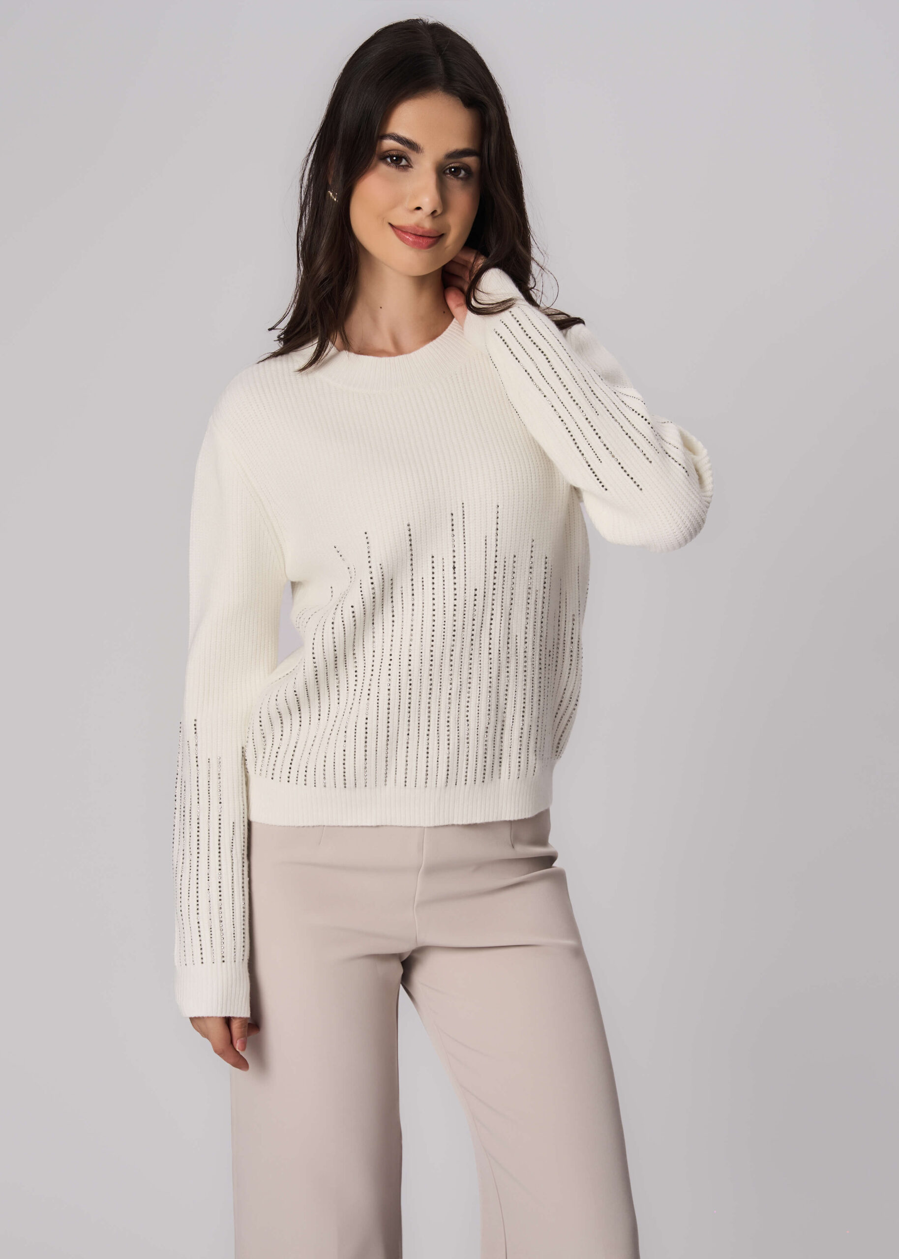 بلوزة نسائي, نسيج محبوك مخطط, مزينة بالستراس, ياقة مدورة, اكمام طويلة, انيقة وعصرية