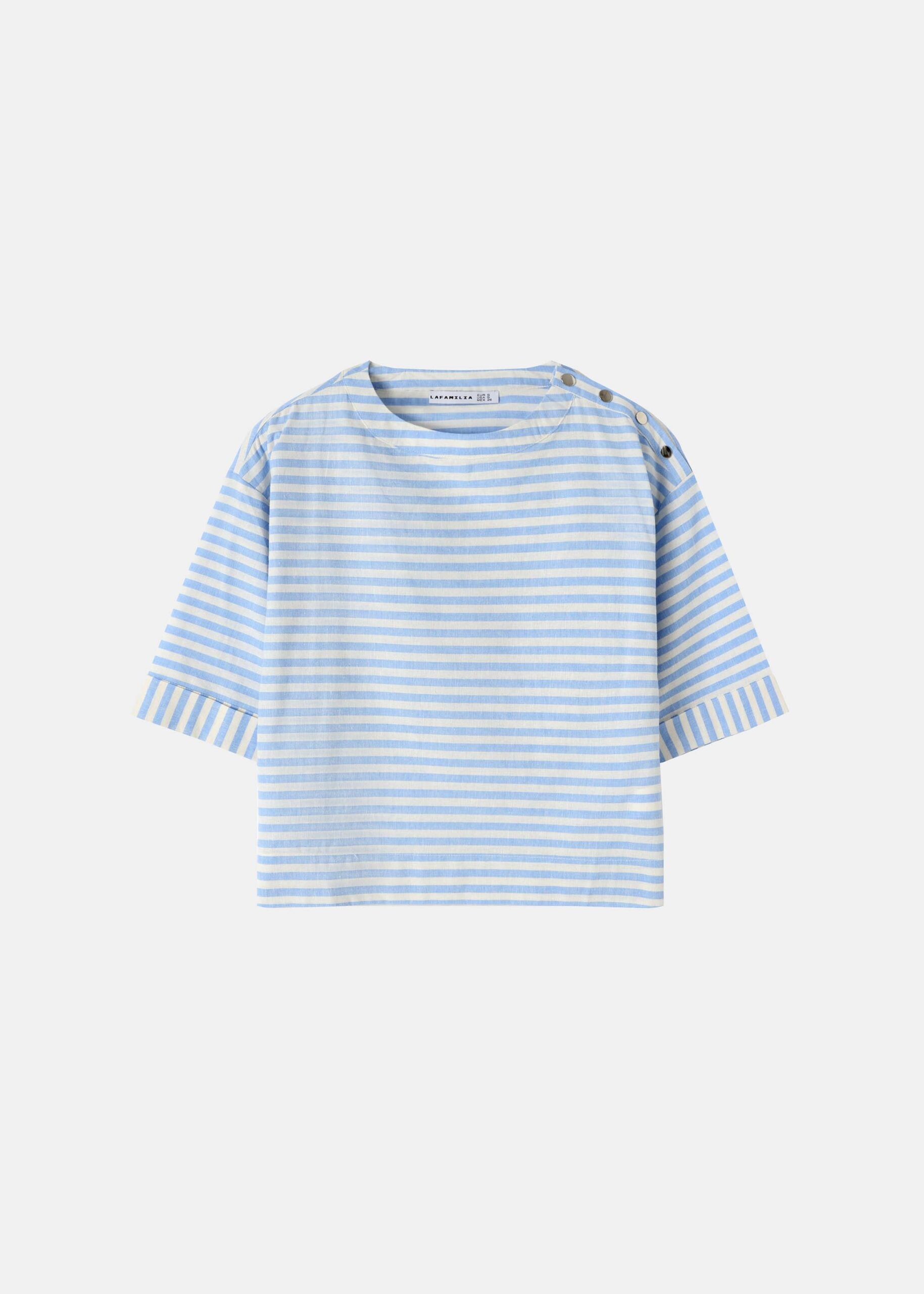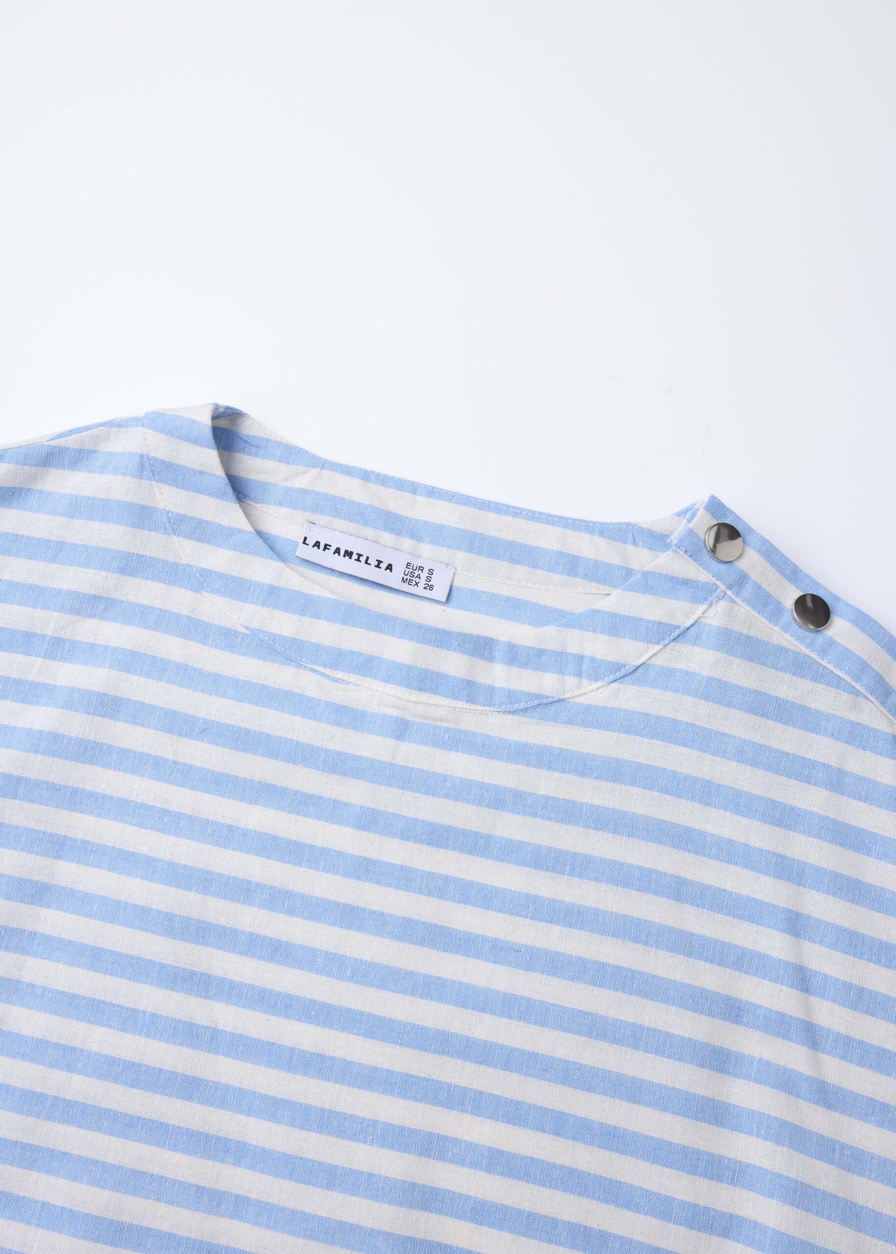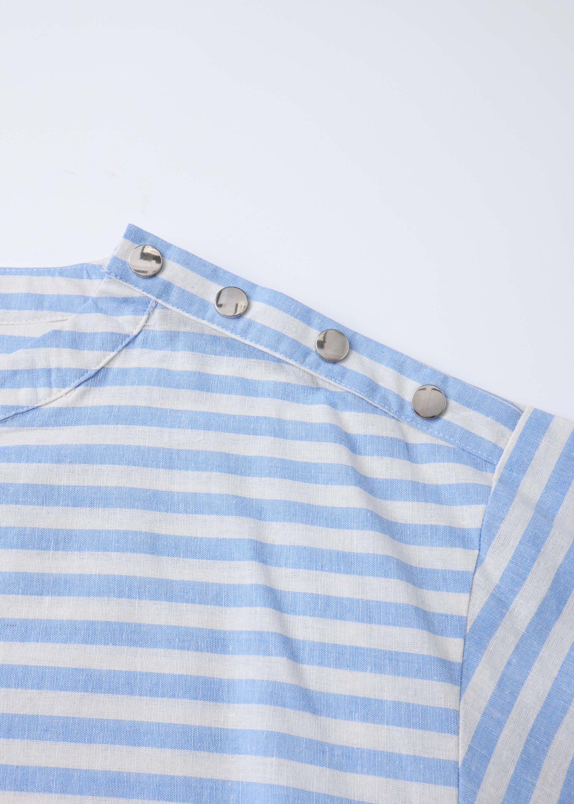 بلوزة نسائي, مخططة, ياقة مدورة, اكمام قصيرة, مزينة بازرار على الكتف, انيقة وعملية