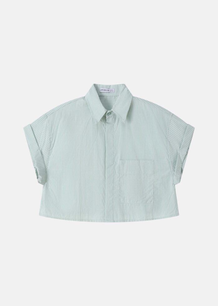 قميص نسائي, قصير, مخطط, ياقة مثنية, ازرار من الامام, اكمام قصيرة مثنية, جيب من الامام, انيق وعصري
