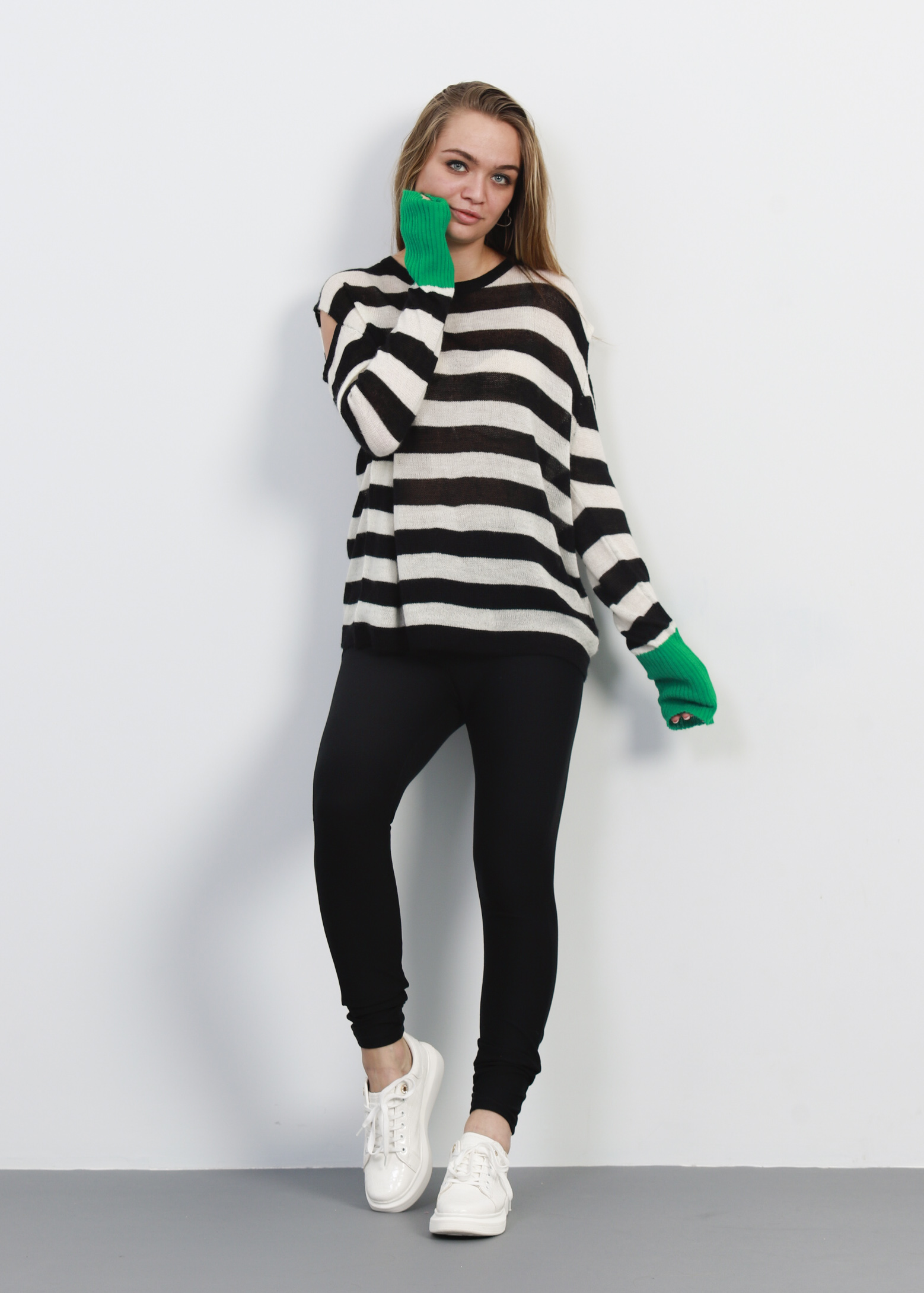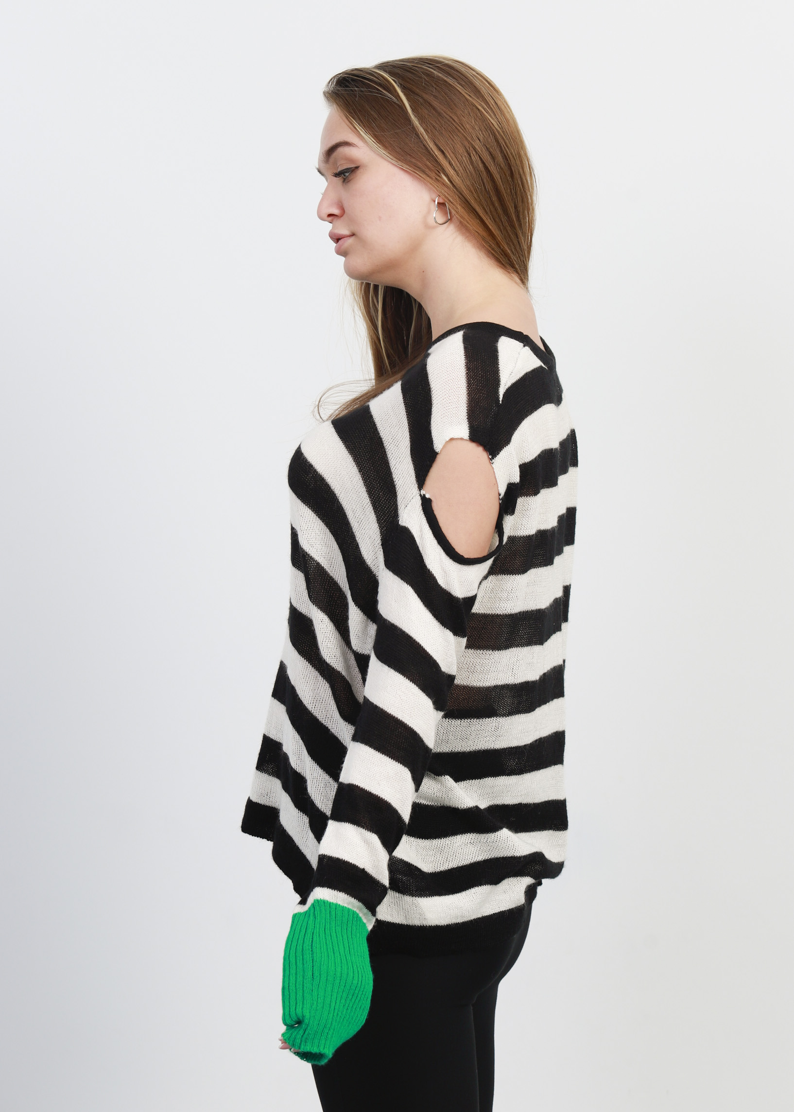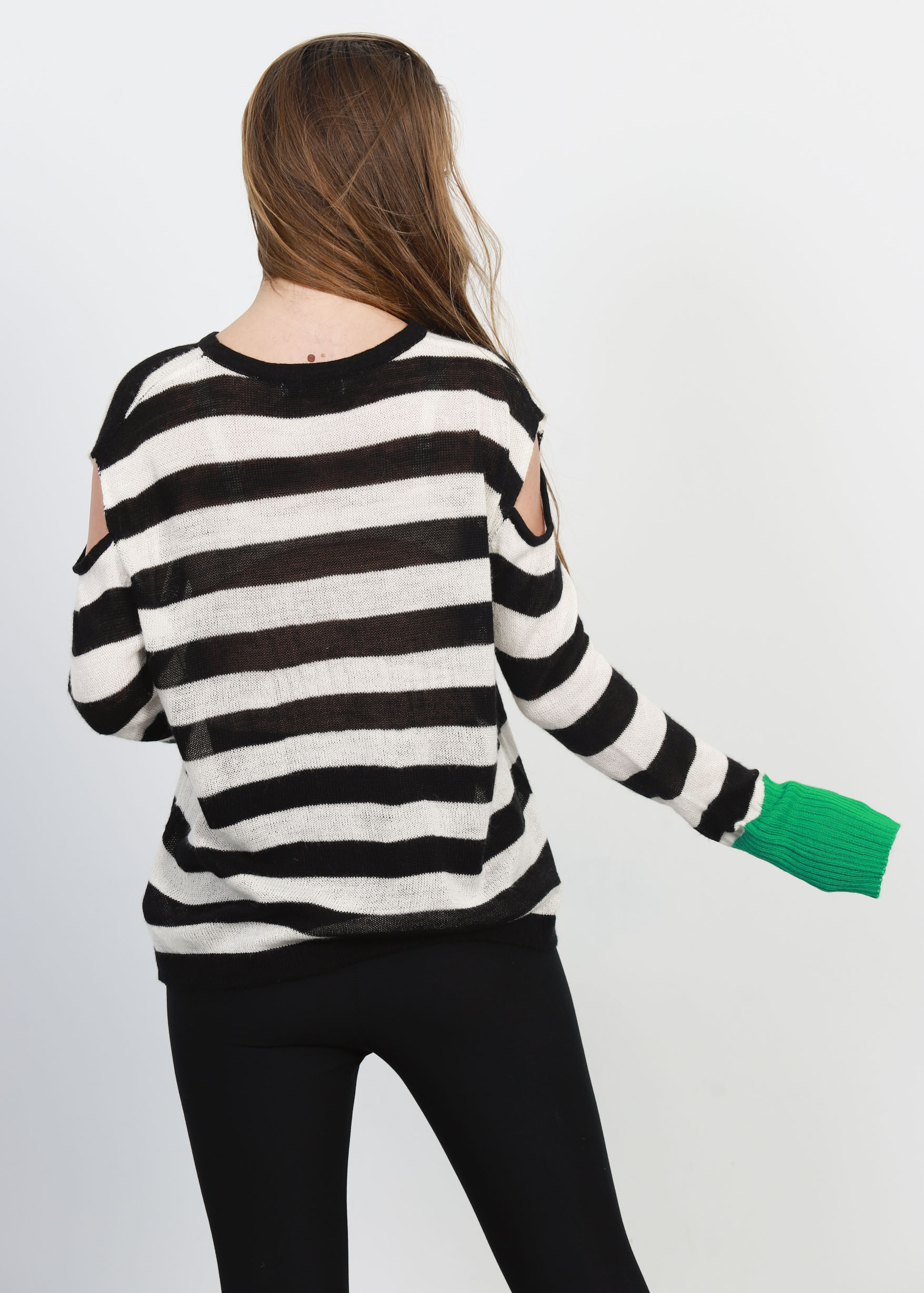 بلوزة نسائي, مخططة, تصميم محبوك, ياقة مدورة, اكمام طويلة مع معصم ضيق في لون مختلف, اكتاف مكشوفة, انيقة ومريحة, 70% اكريليك 30% صوف