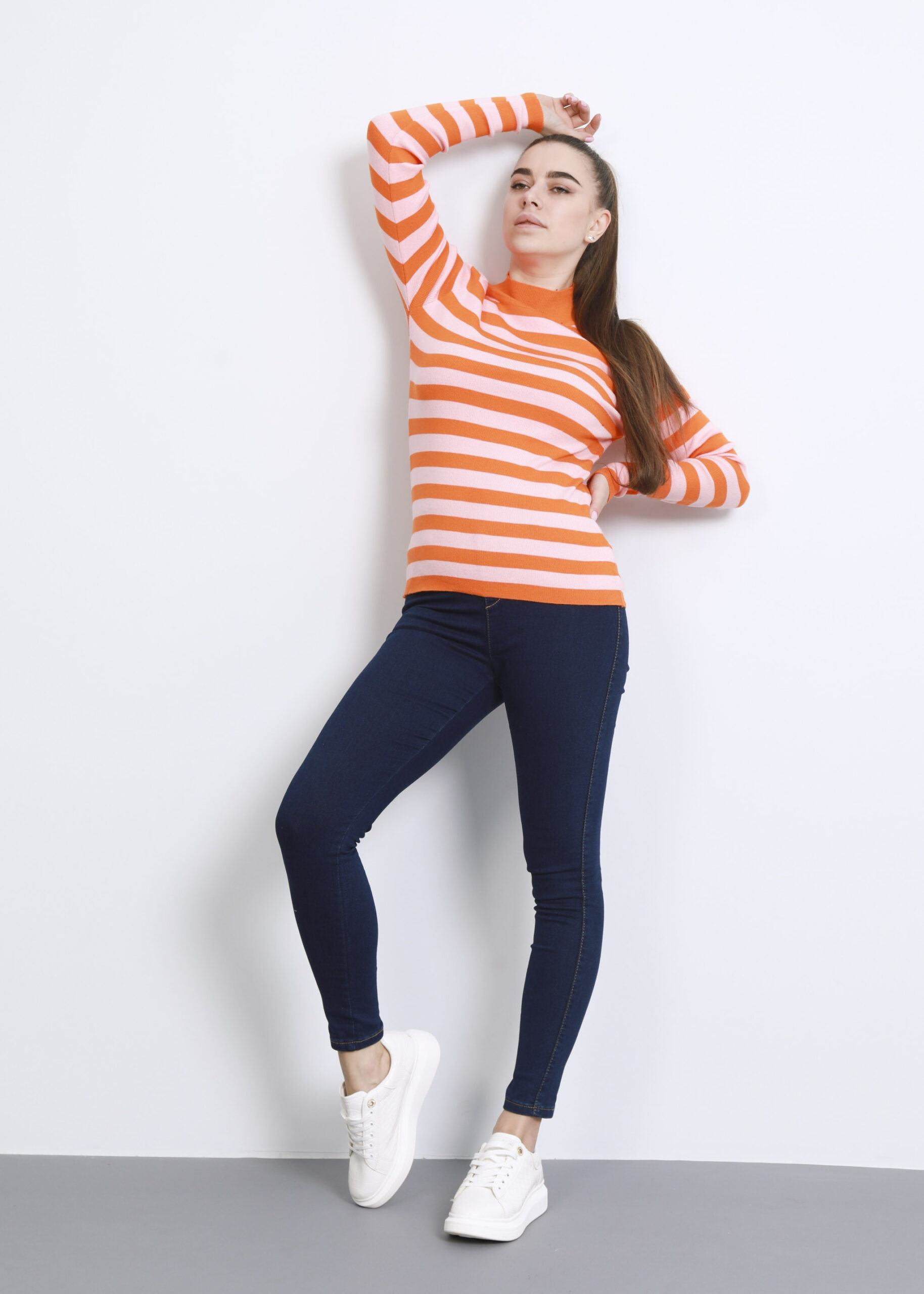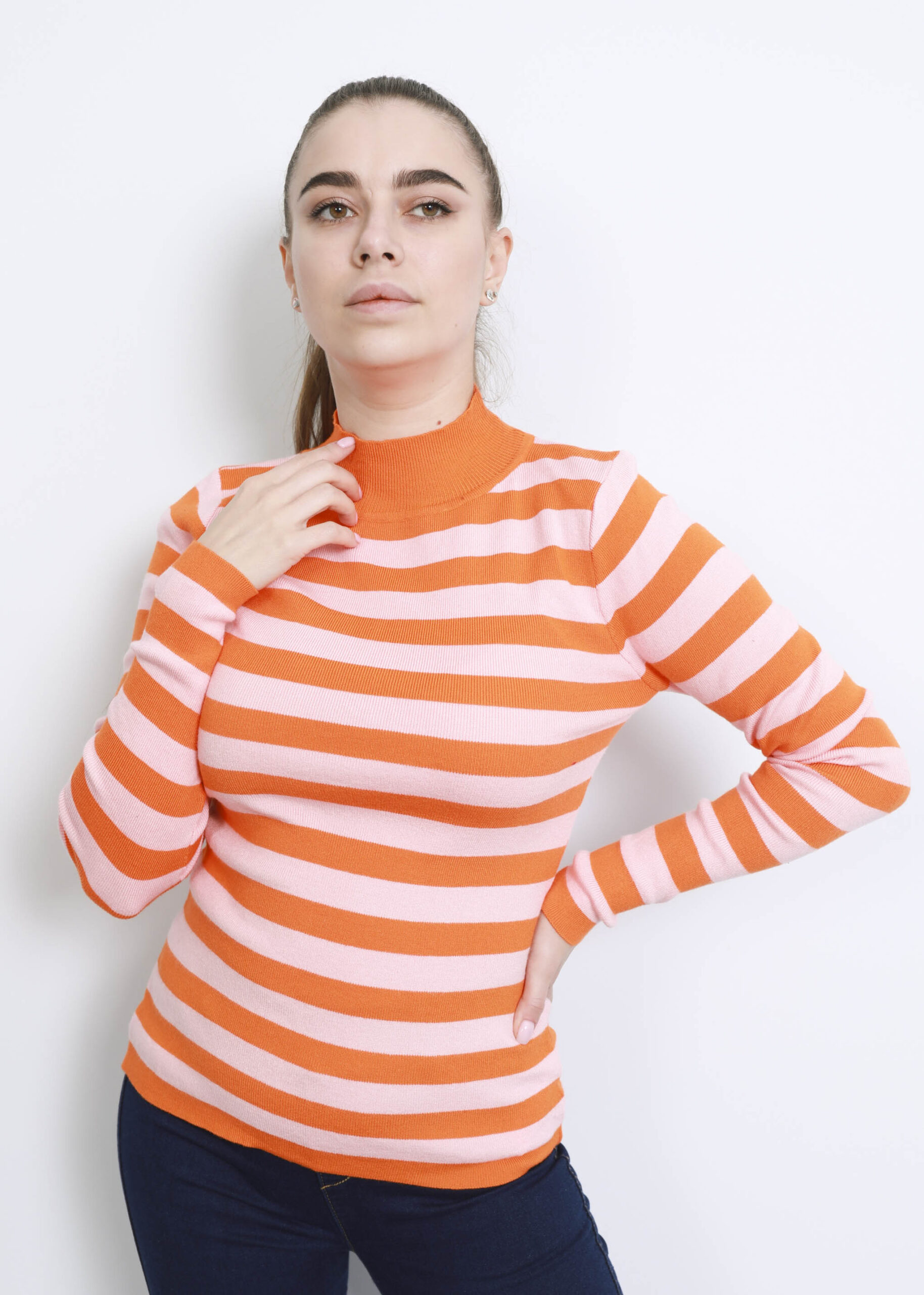 بلوزة نسائي, تصميم محبوك مخطط لونين, اكمام طويلة, ياقة مرتفعة, انيقة, 60% فيسكوز 40% نايلون
