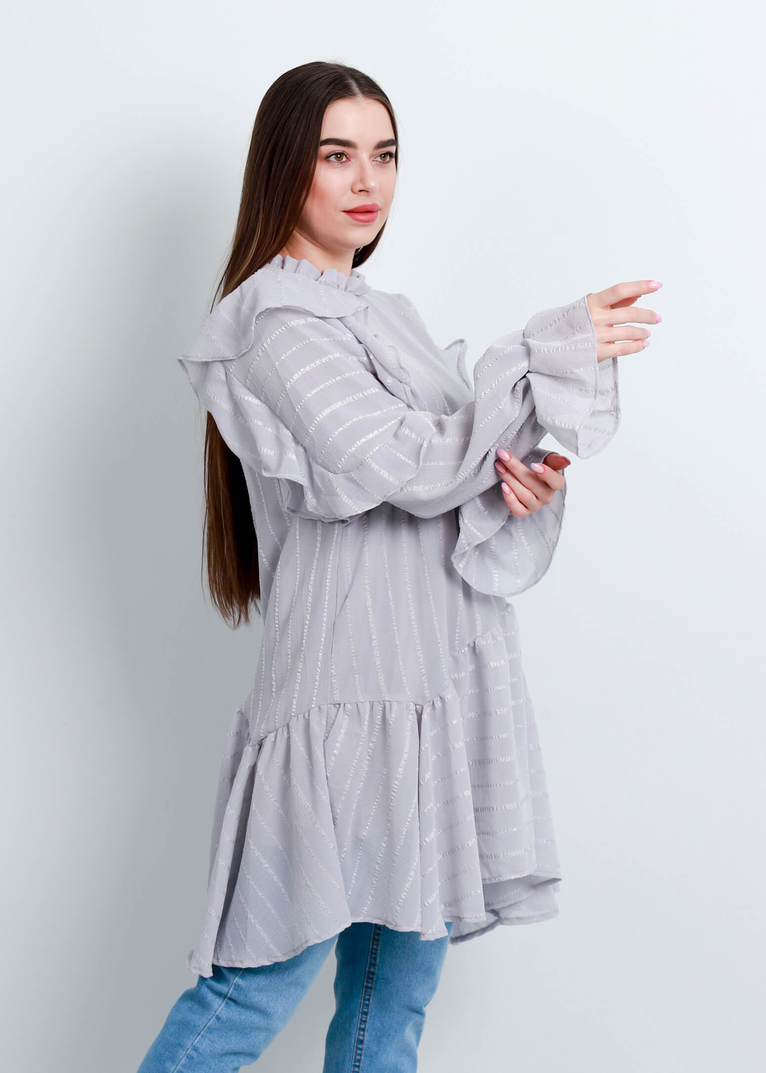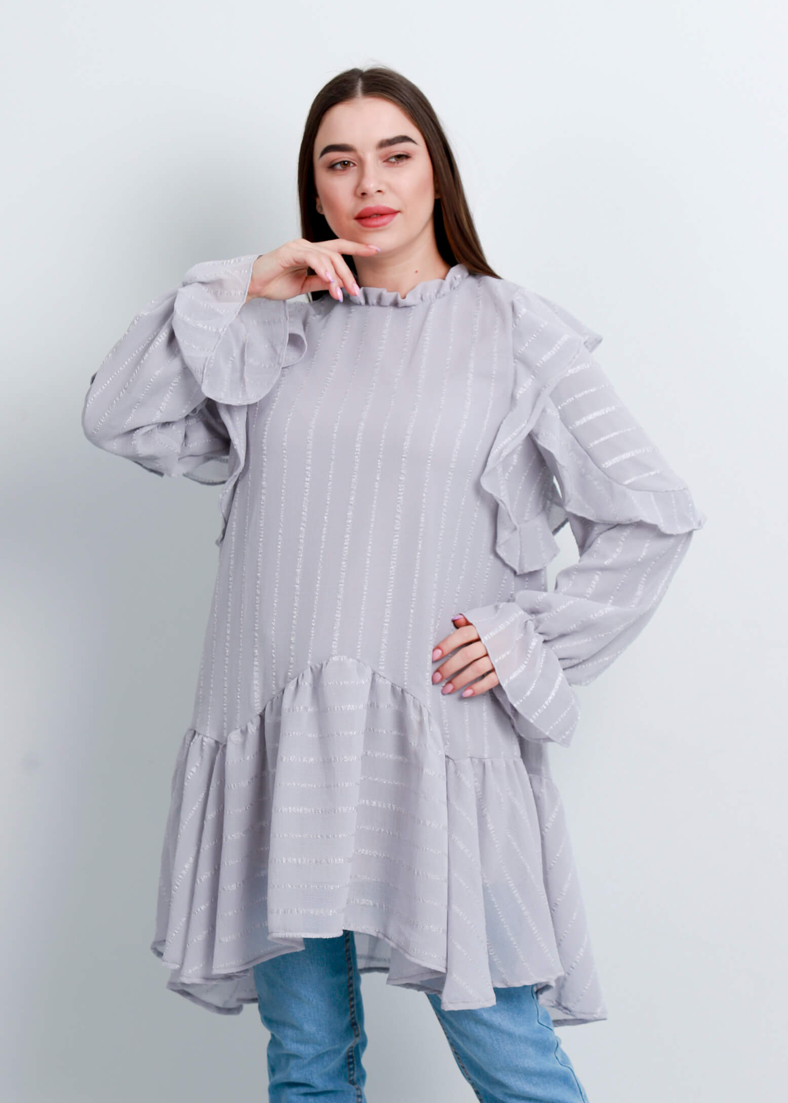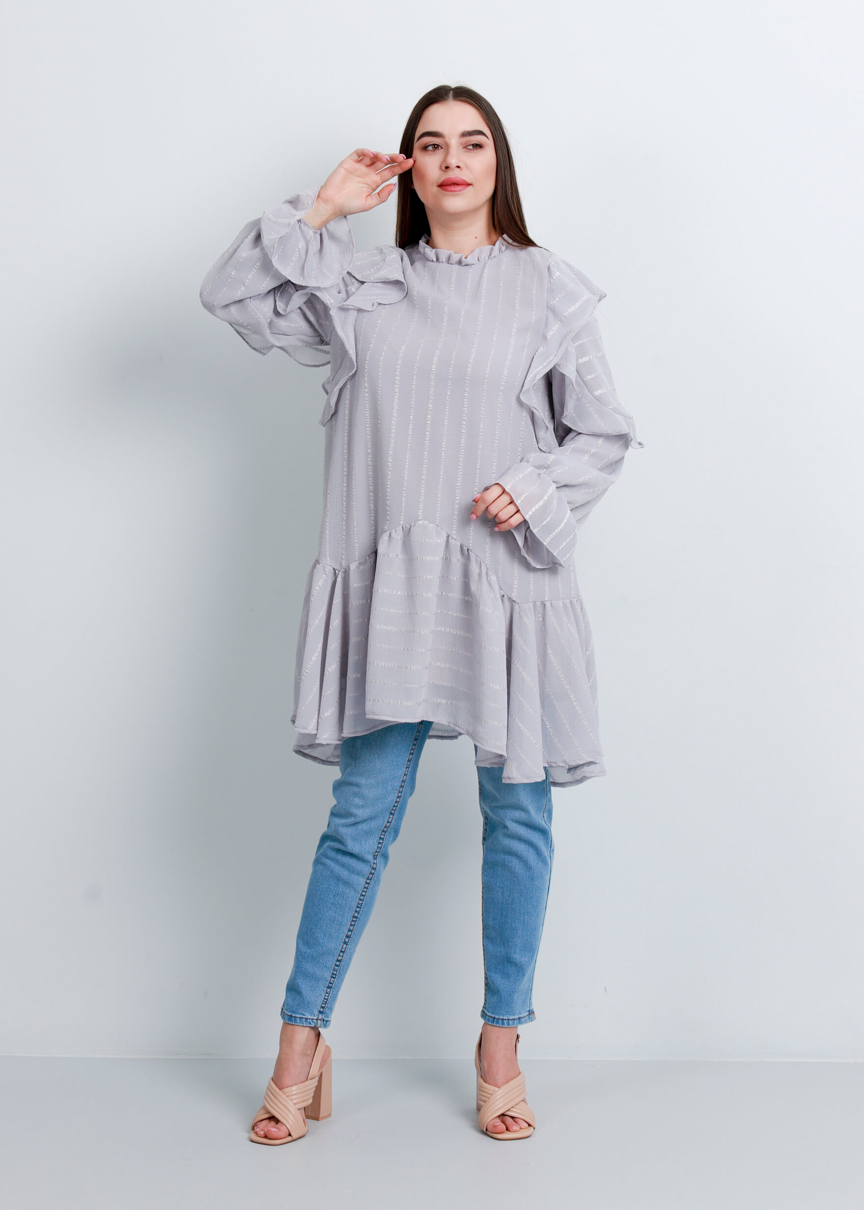 بلوزة ستاتي, طويلة, مخططة, تصميم كشكش, اكمام طويلة مع معصم واكتاف كشكش, ياقة كشكش مرتفعة مع زر من الخلف للاغلاق, انيقة ومميزة, 100% بوليستر
