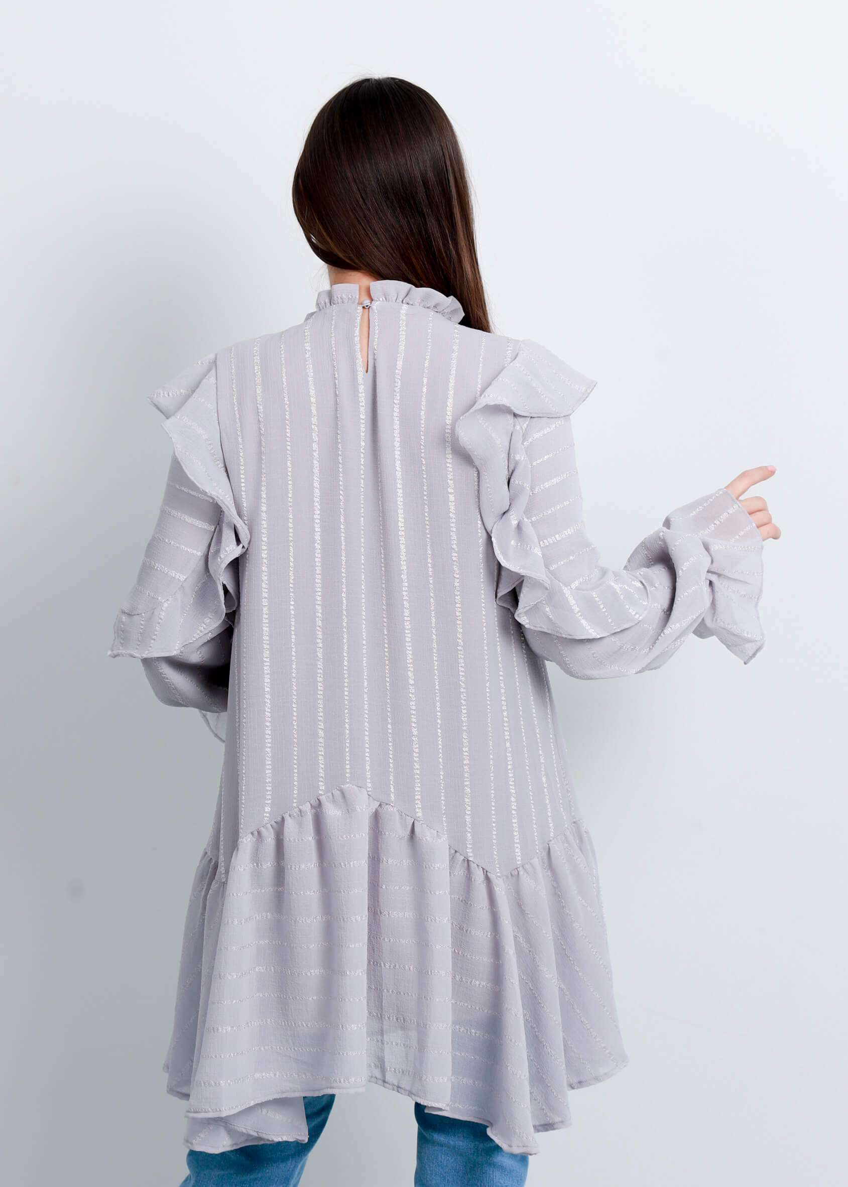 *ياقة كشكش مرتفعة مع زر من الخلف للاغلاق