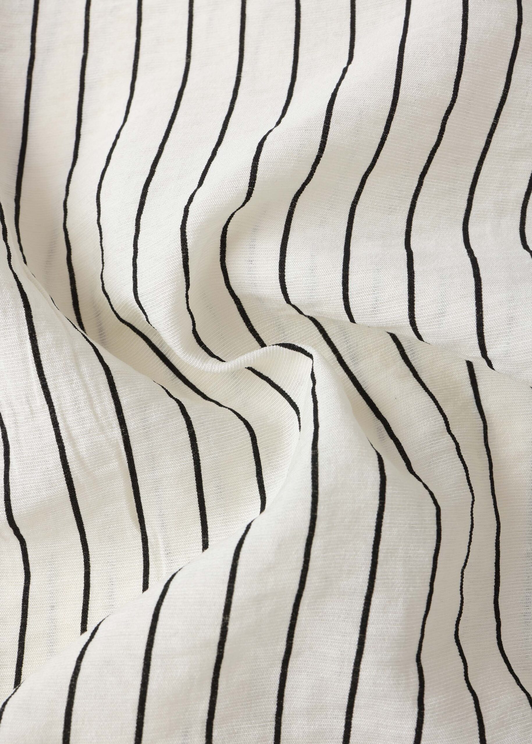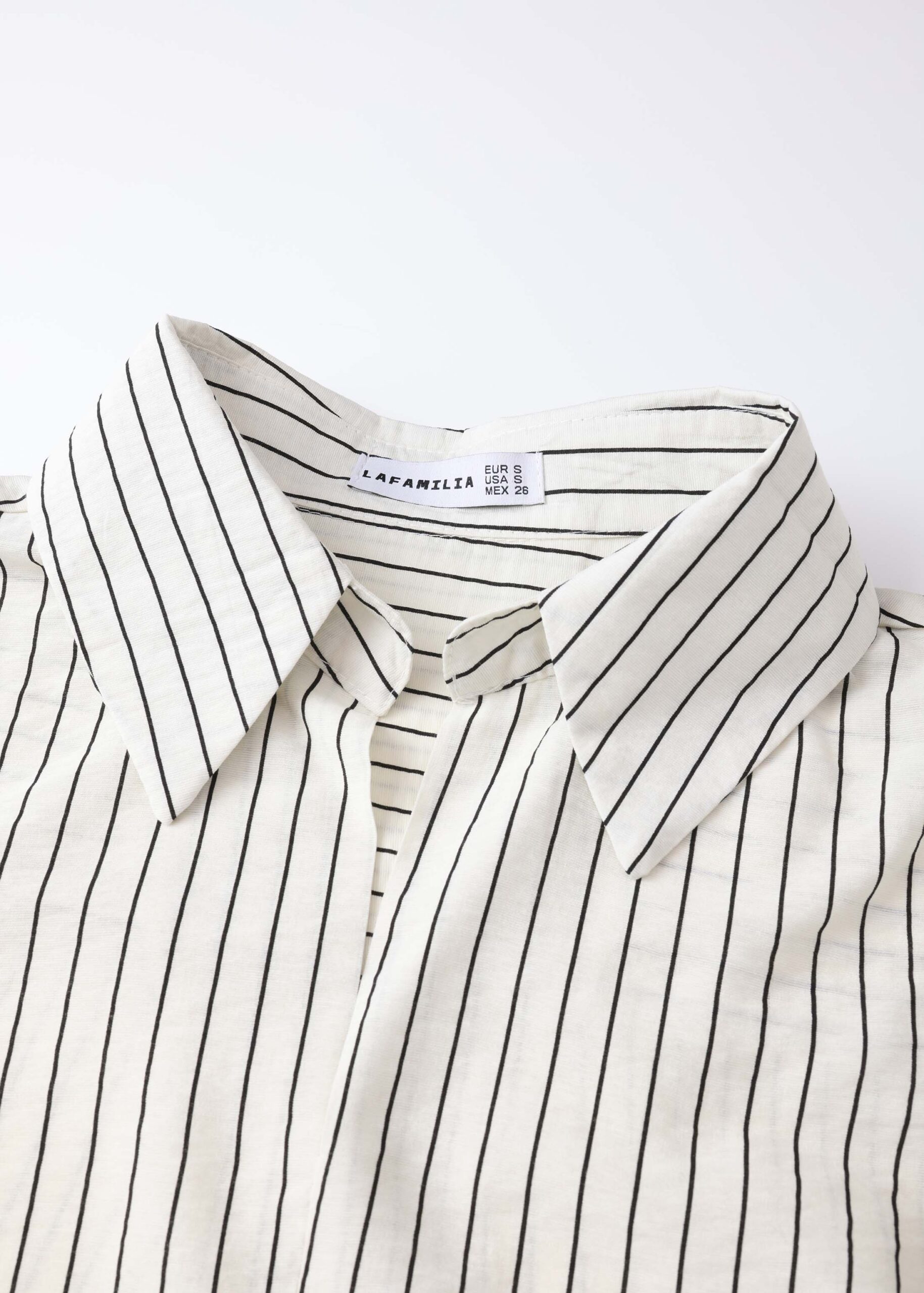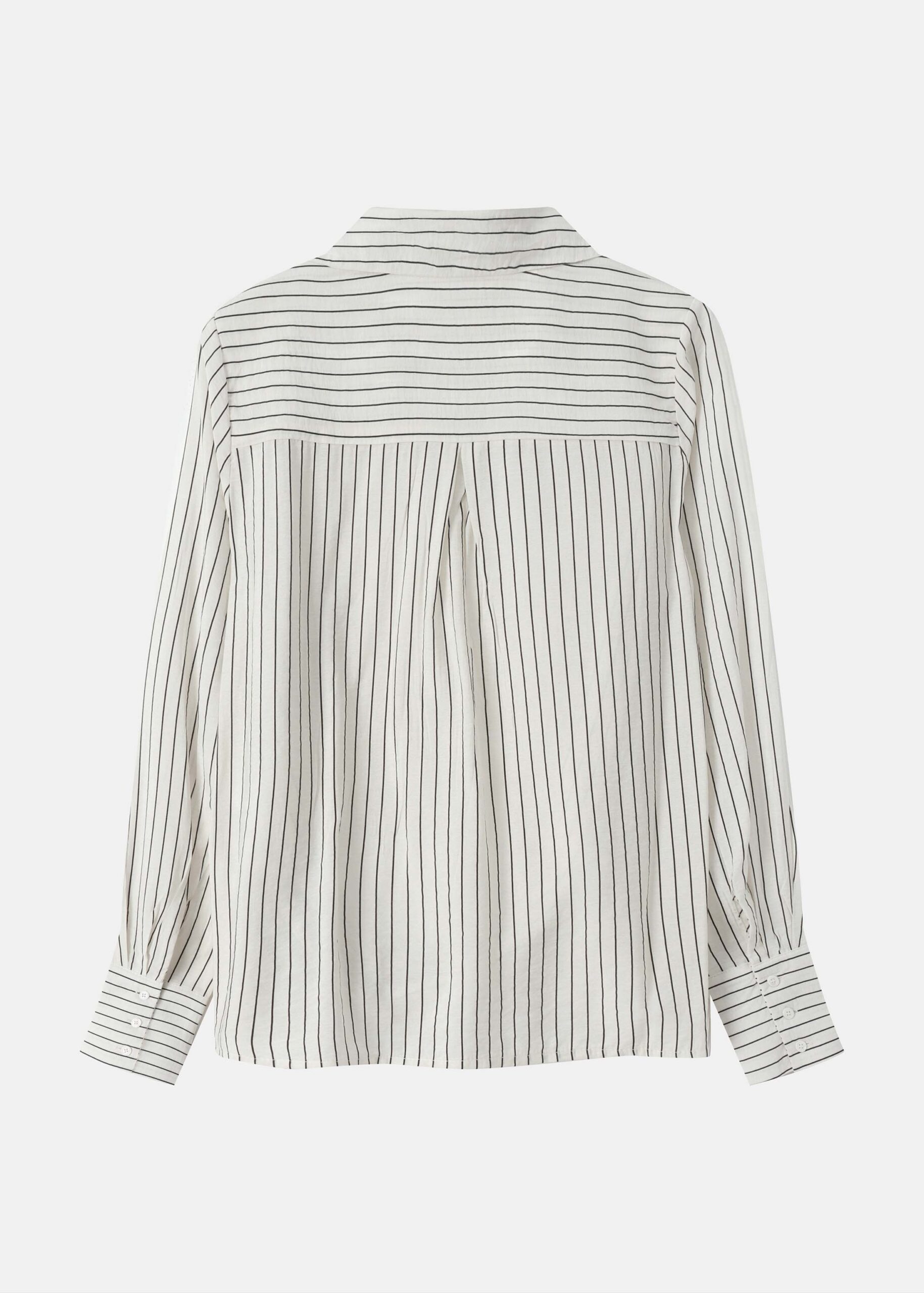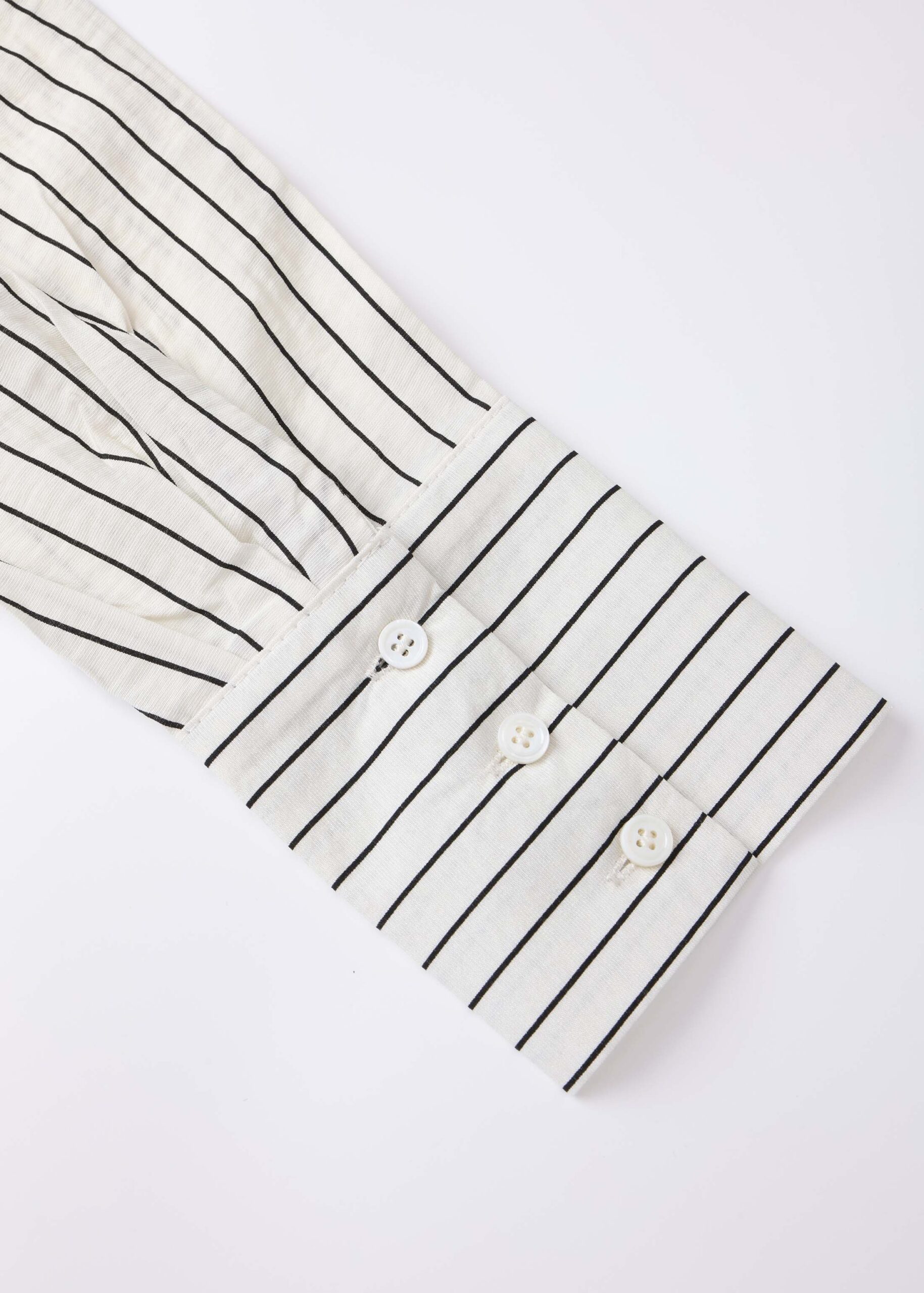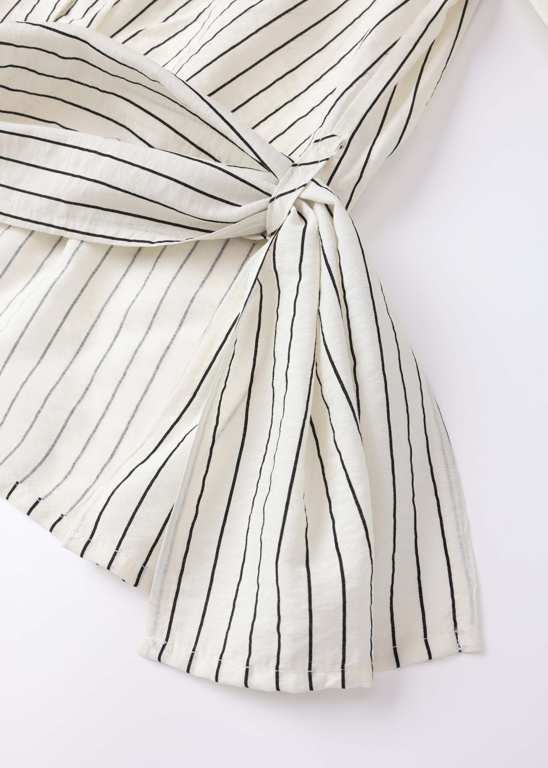 Women blouse, striped, rolled collar with V neckline, long sleeves with tight cuff, wrap waist design with side tie, unique and modern