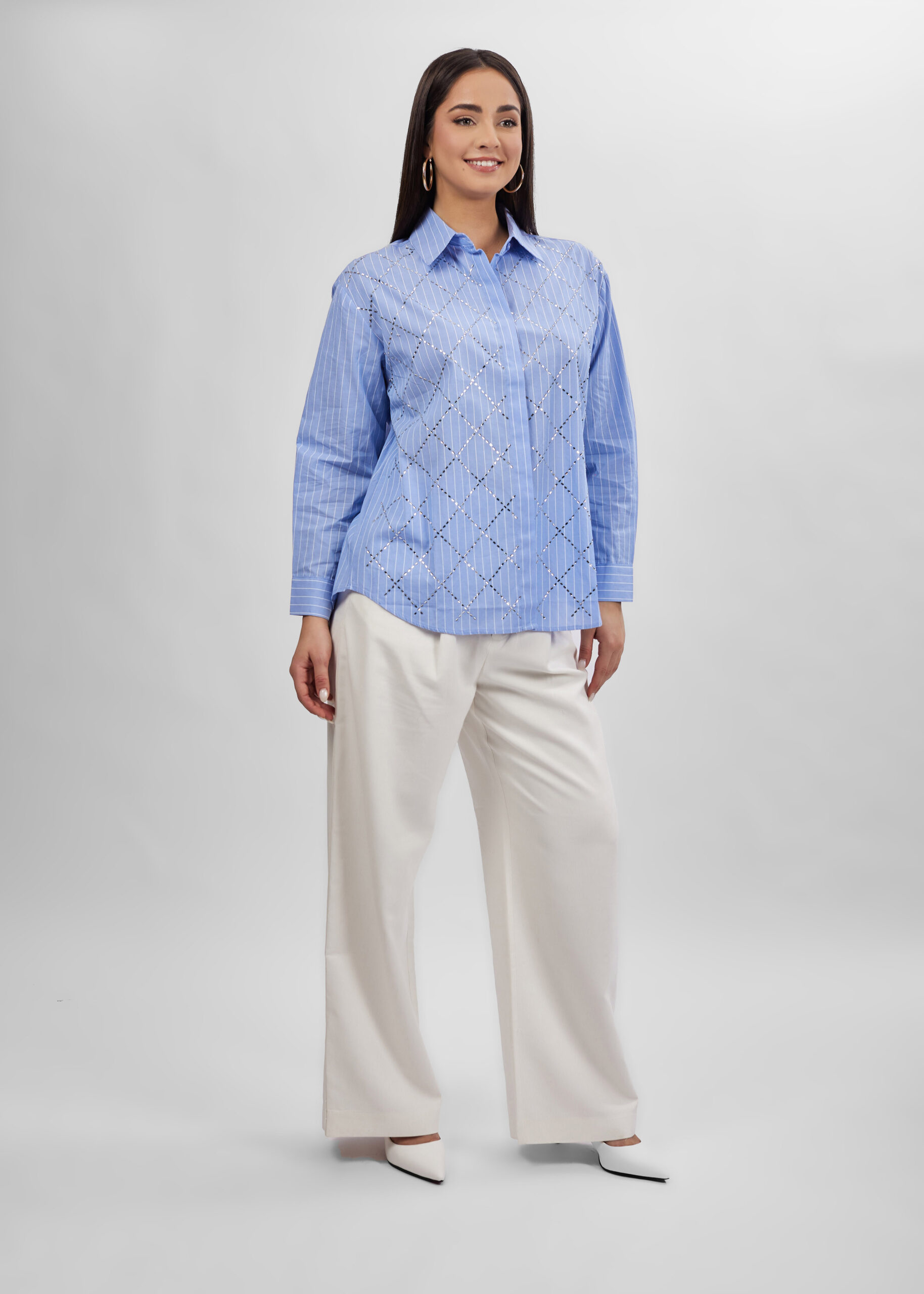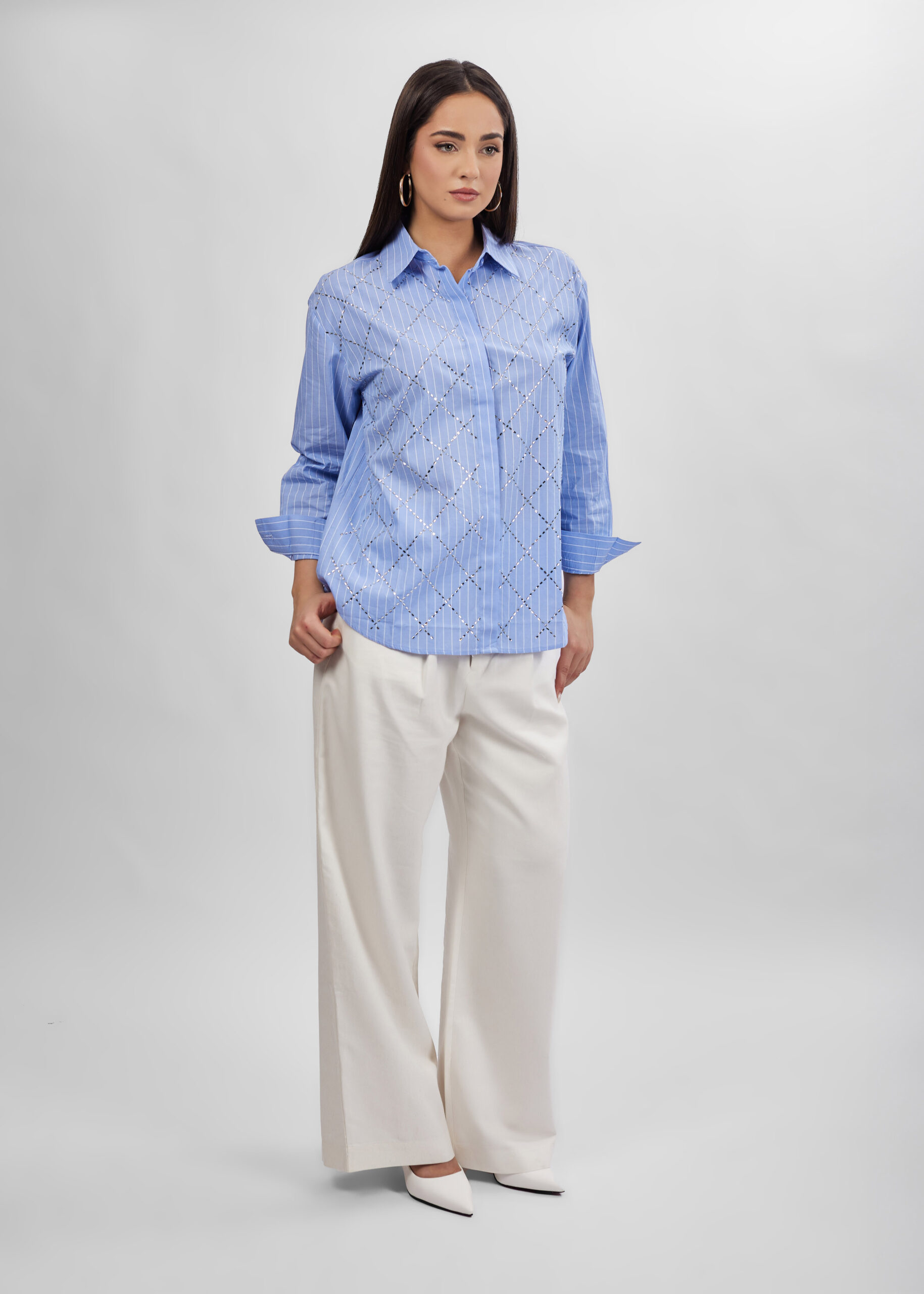 قميص نسائي, مخطط, مزين بالستراس, ازرار من الامام للاغلاق, اكمام طويلة مع معصم ضيق, ياقة مثنية مع زر من الامام, انيق وعصري