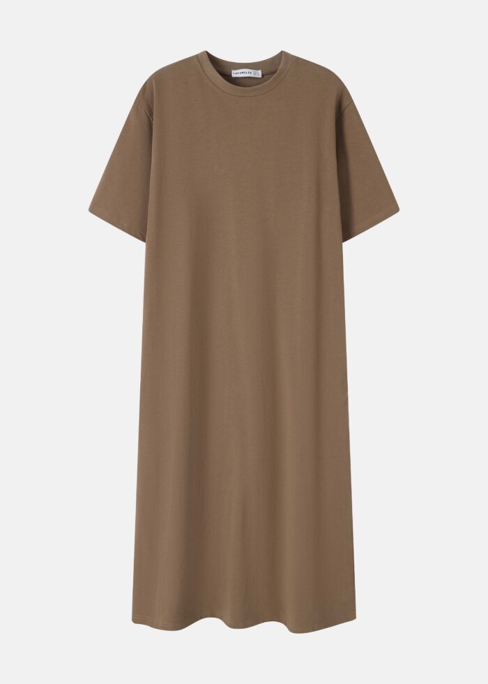 فستان نسائي, طويل, سادة, بيسك, ياقة مدورة, اكمام قصير, فتحة من الجانب, عملي ومريح