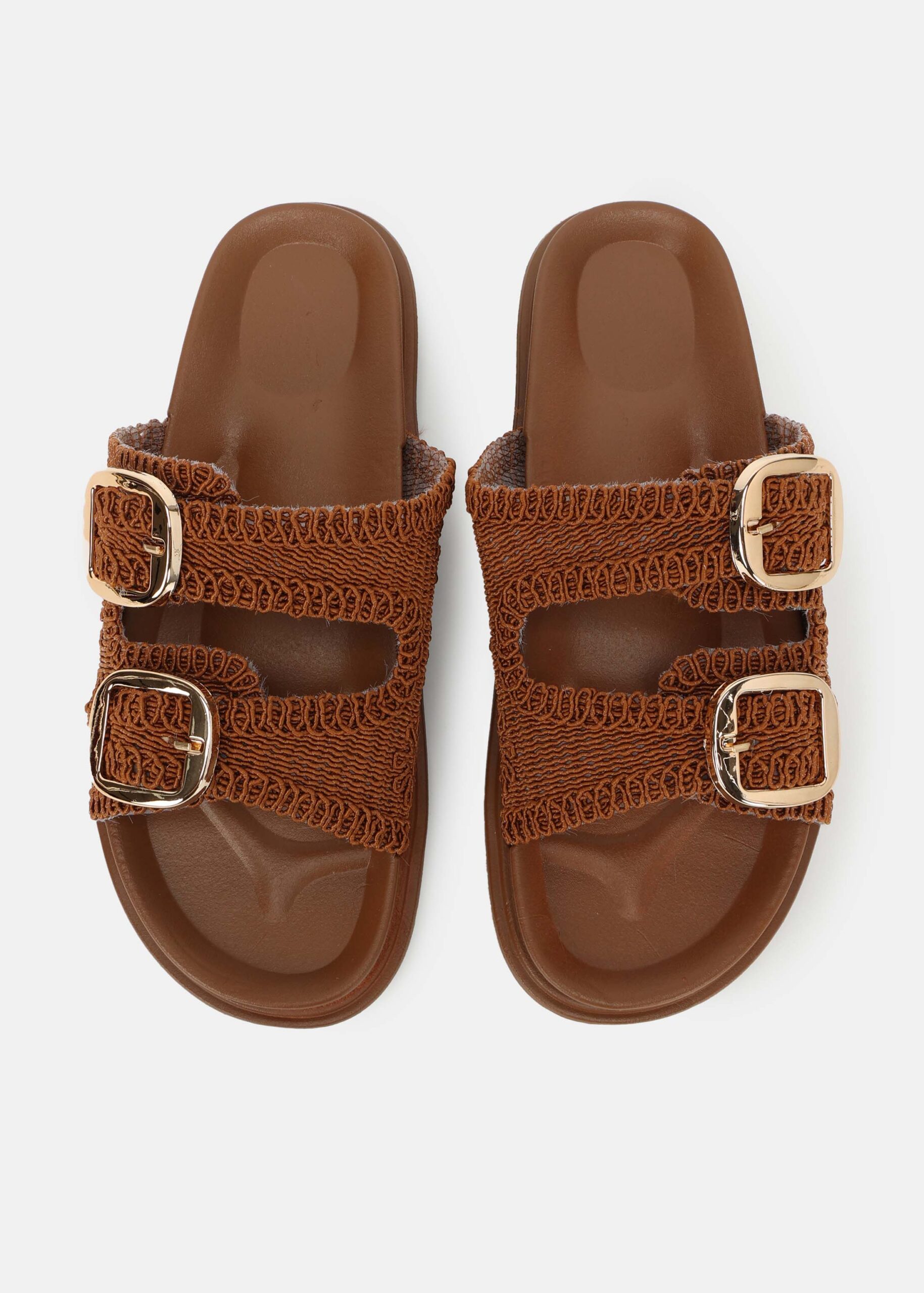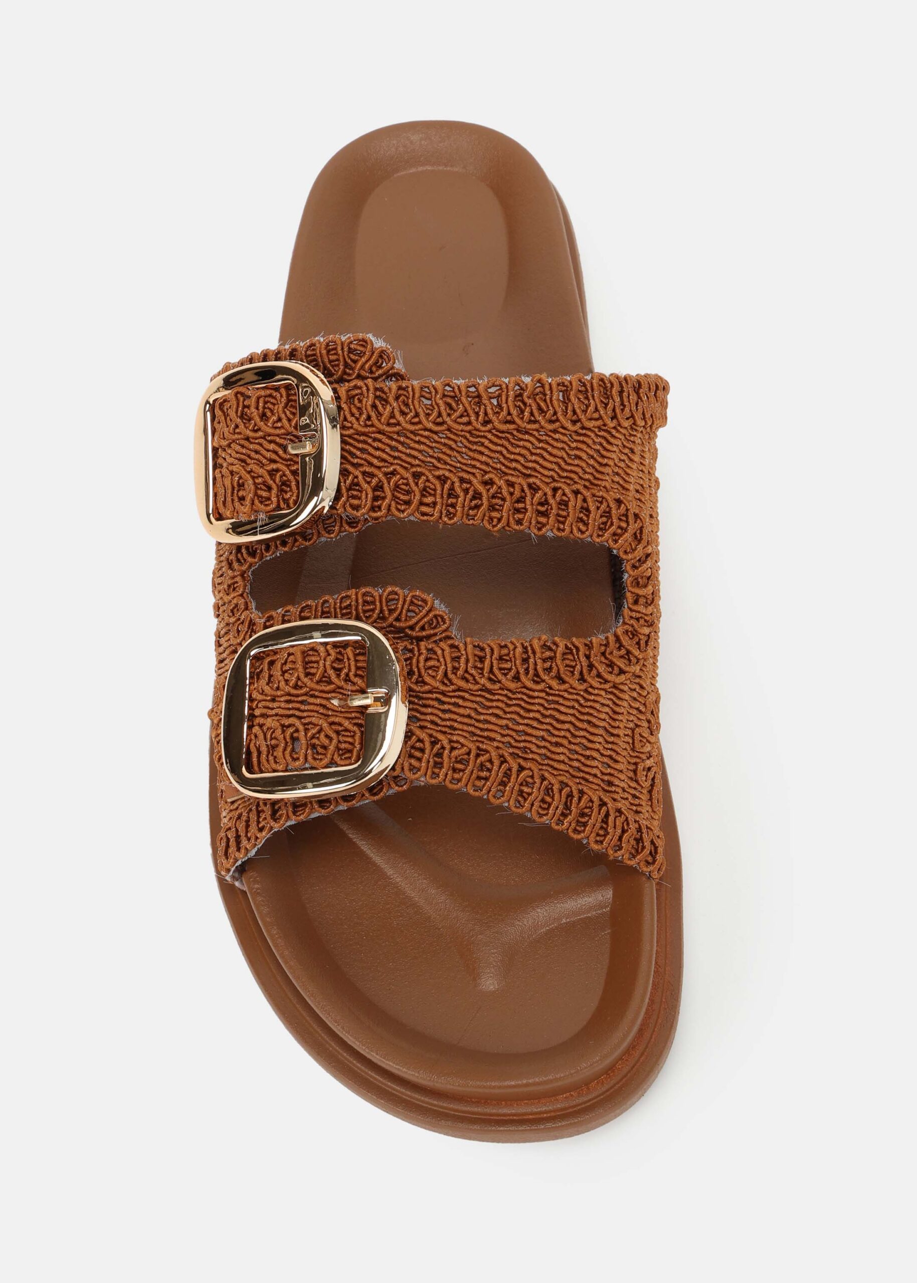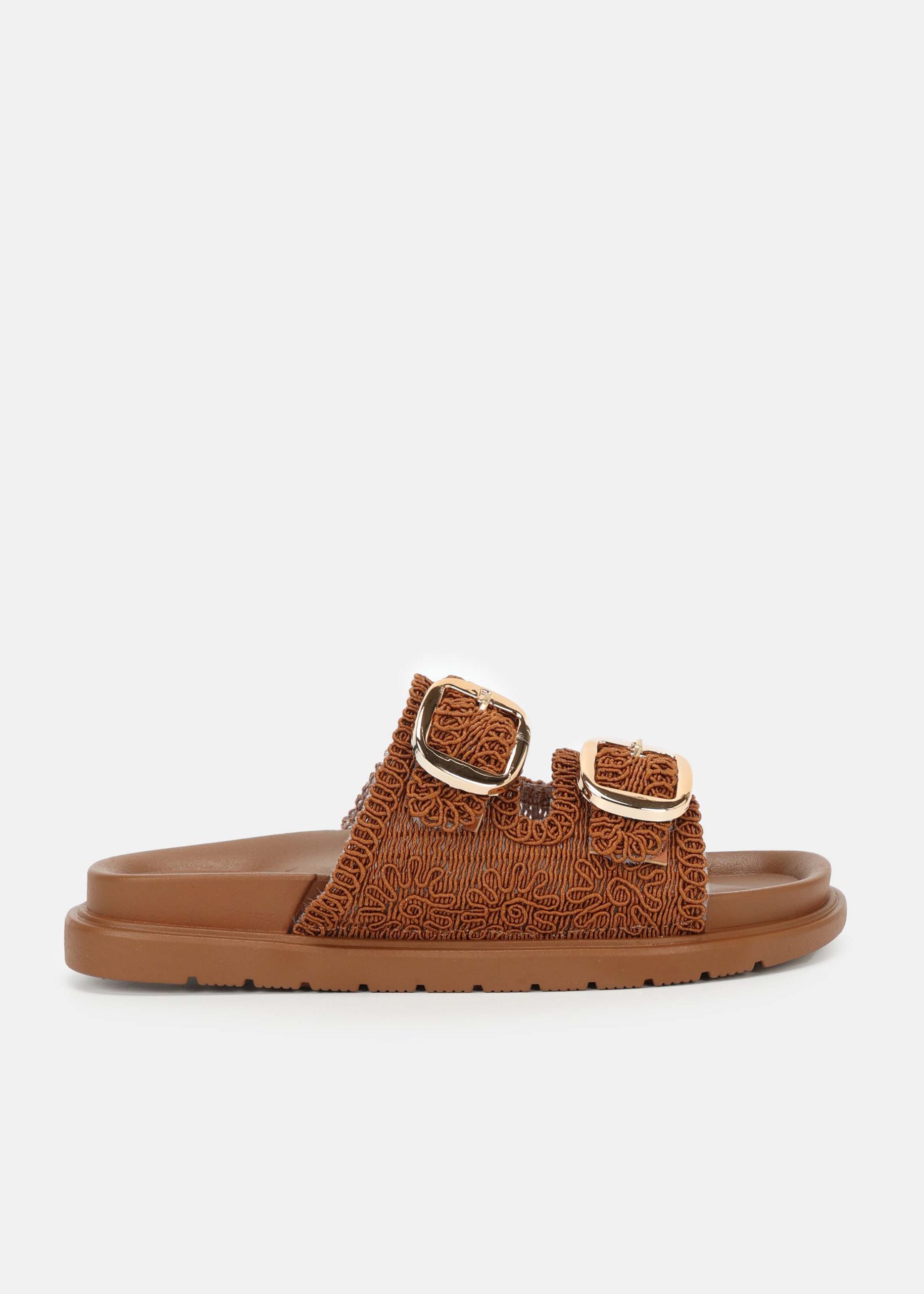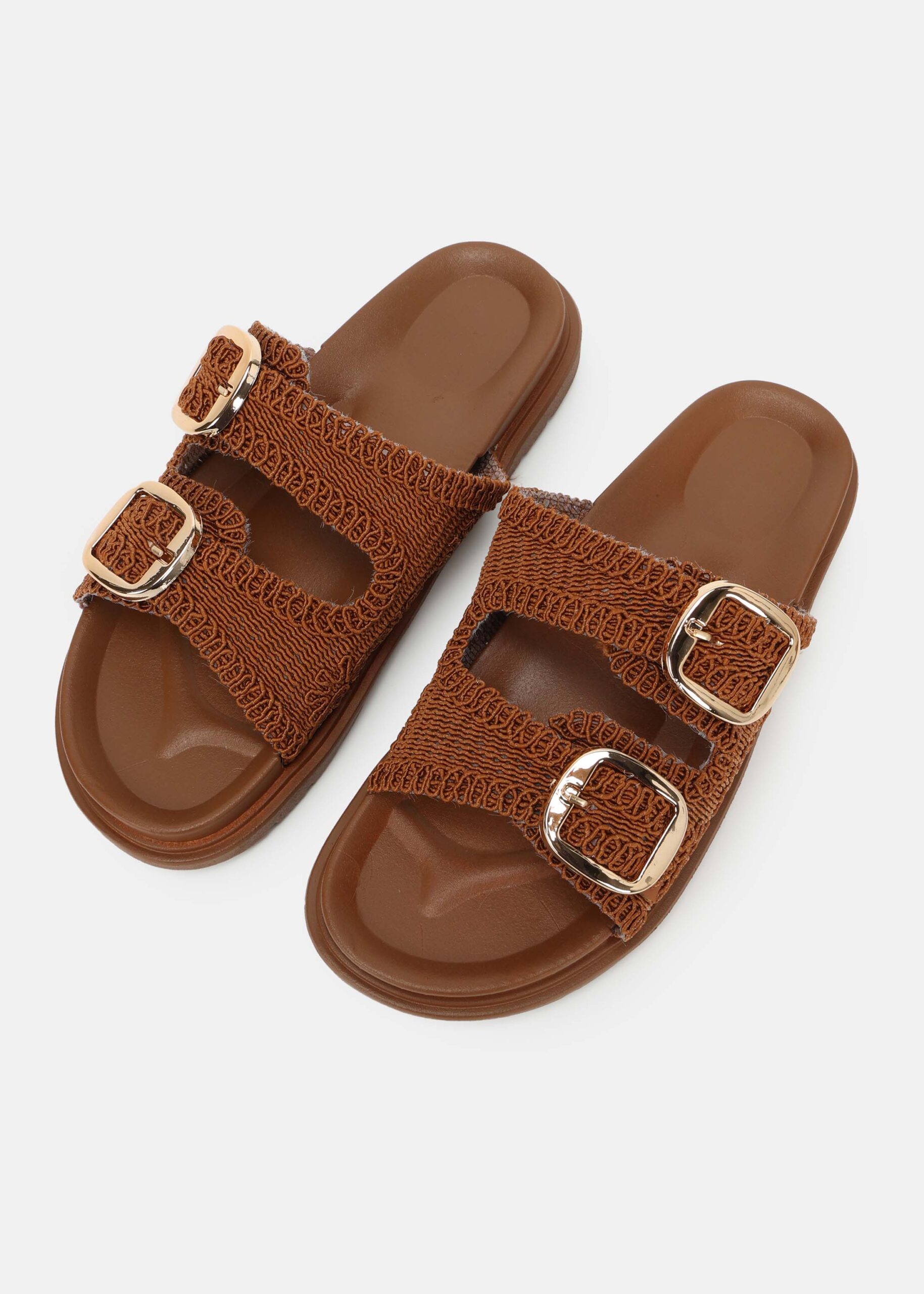 سليبر نسائي, نسيج محبوك, نعل مسطح, مقدمة مدورة مفتوحة, حزامين عريضين من الاعلى مع مشابك معدنية من الجانب, عملي ومريح