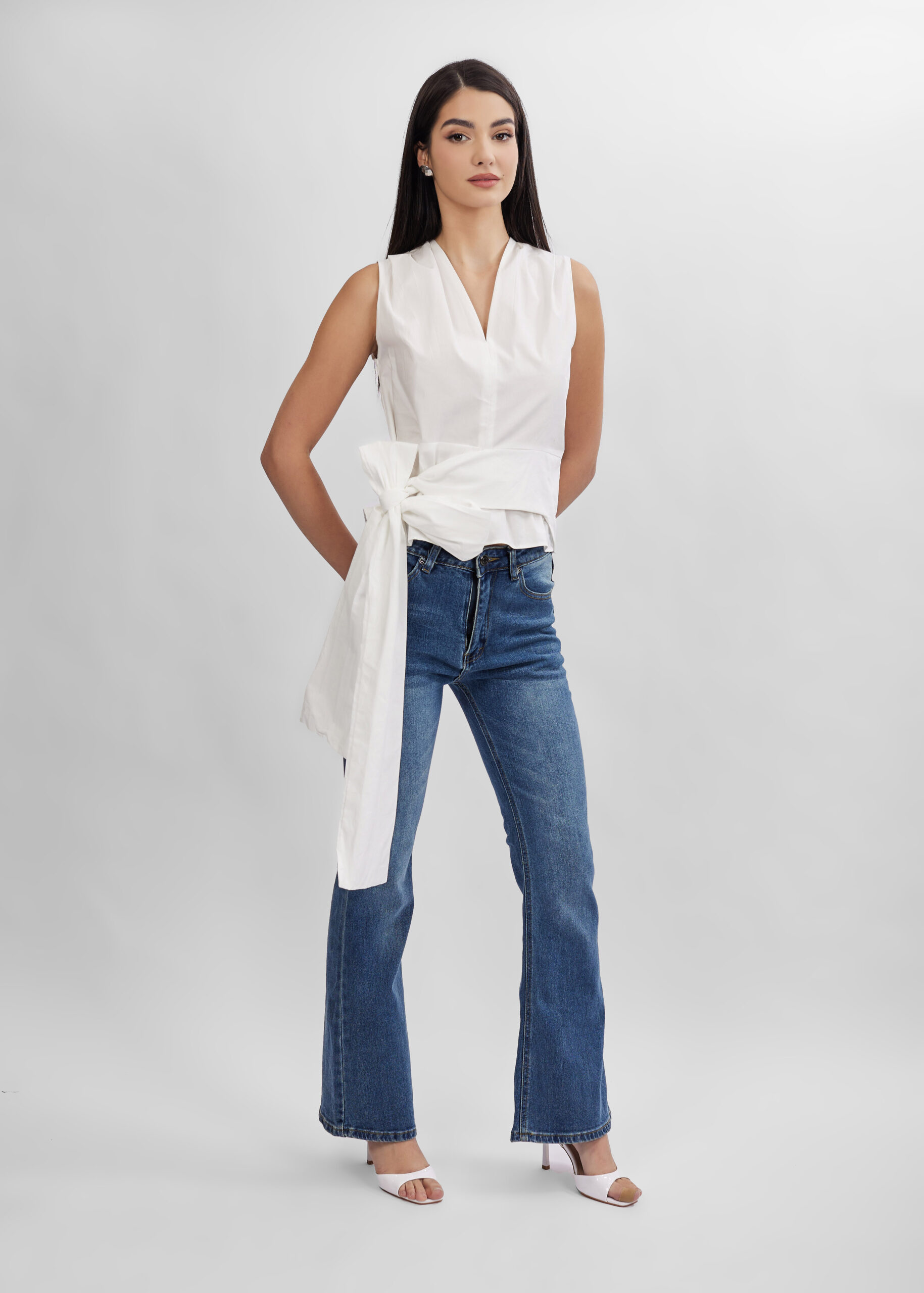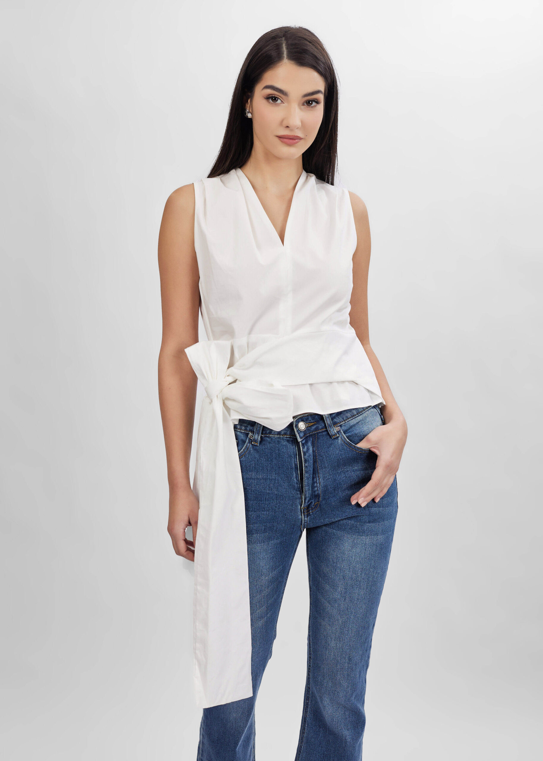 بلوزة نسائي, سادة, ياقة سبعة, بدون اكمام, تصميم ربطة من الامام, انيقة وعصرية