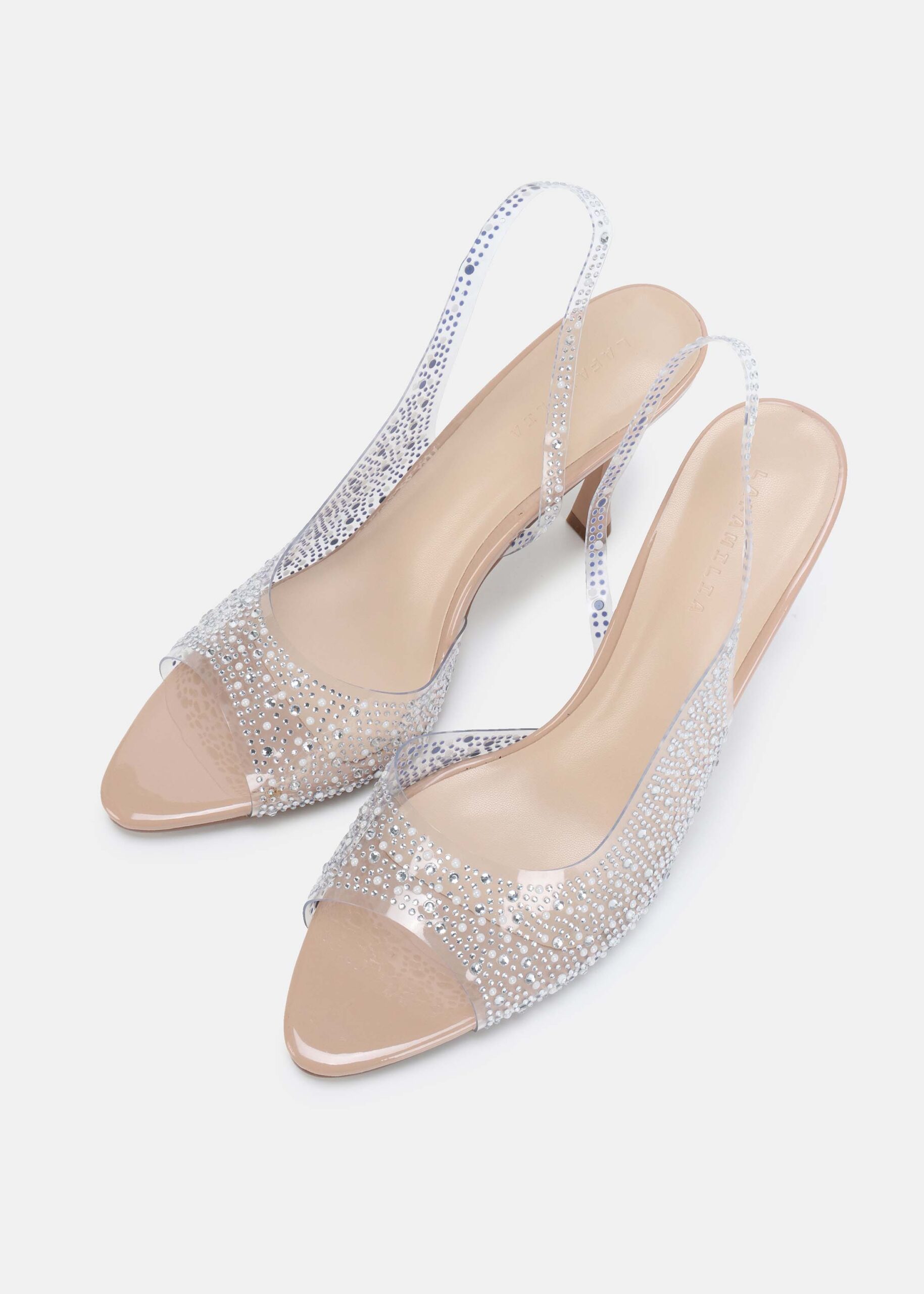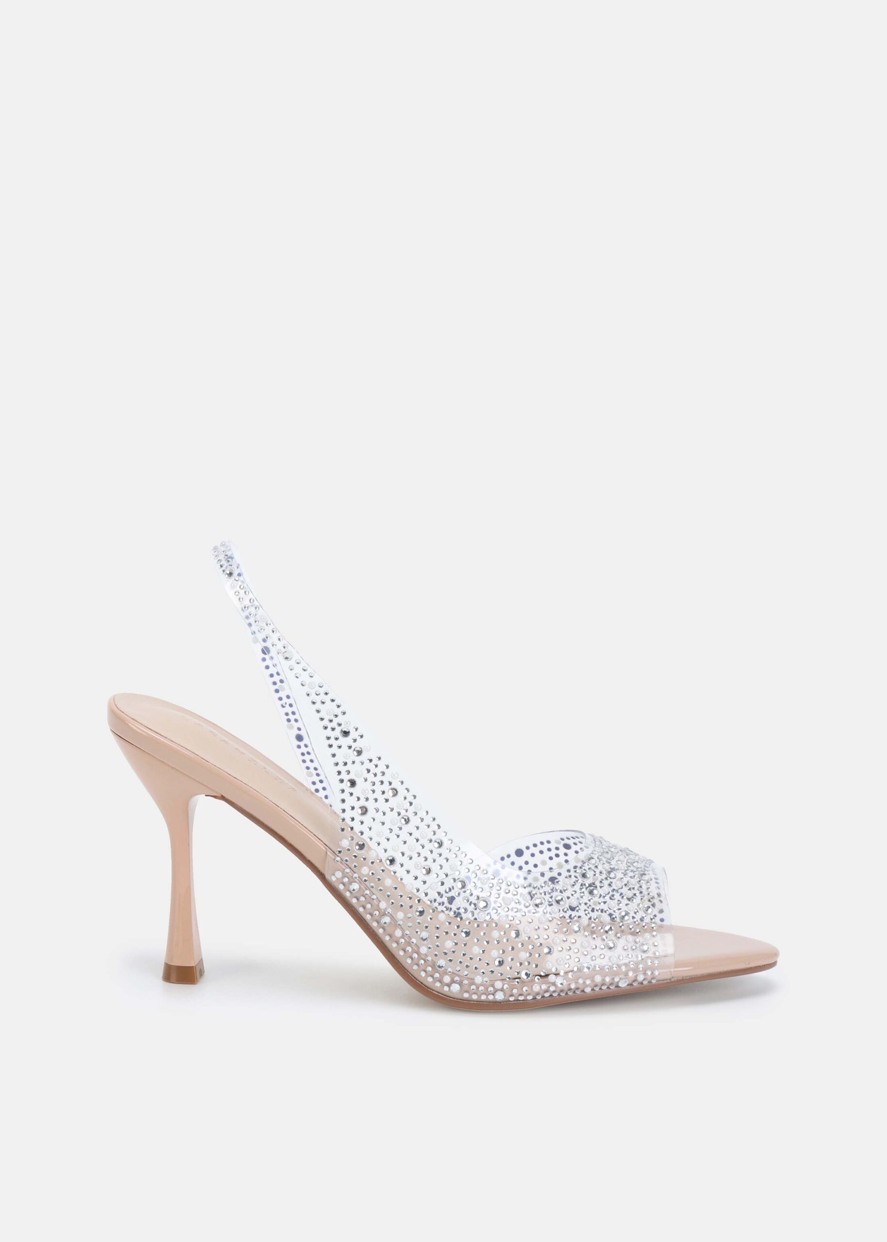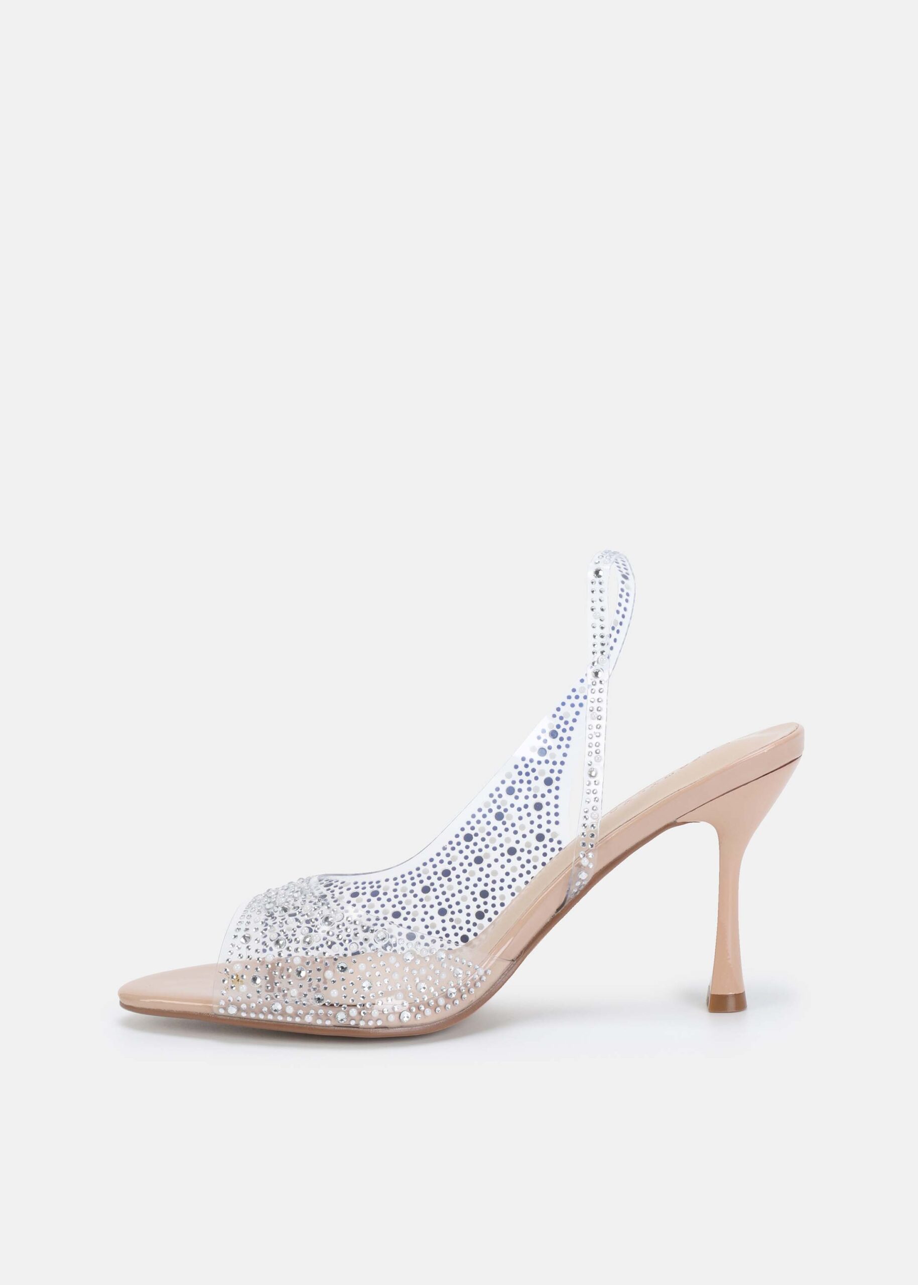 صندل نسائي, شفاف مزين بالستراس, مقدمة مدورة مفتوحة, كعب, شريط كاحل, انيق وعصري