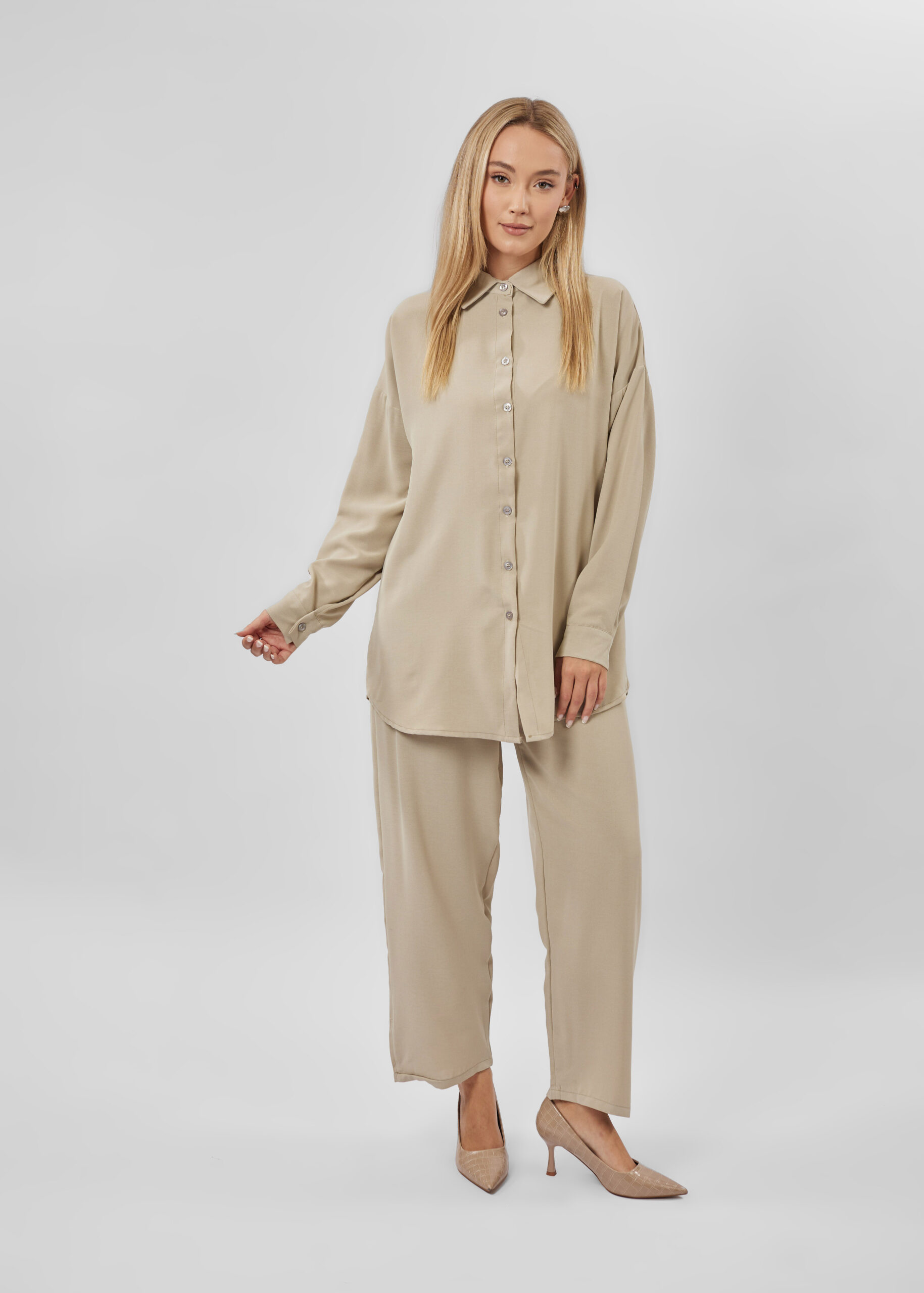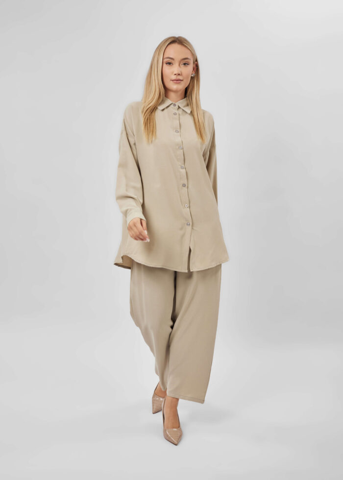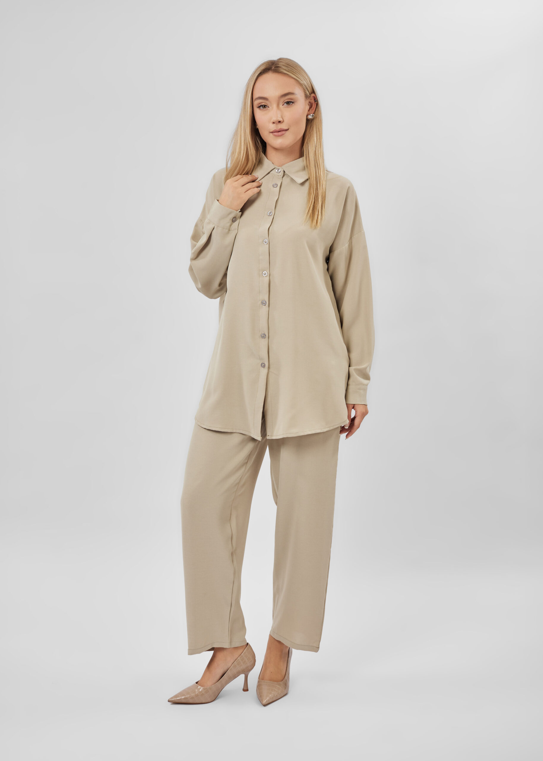 طقم نسائي, قطعتين, سادة, قميص, ازرار من الامام للاغلاق, اكمام طويلة مع معصم ضيق, ياقة مثنية مع زر من الامام, بنطلون, واسع, خصر مطاطي, عملي وانيق