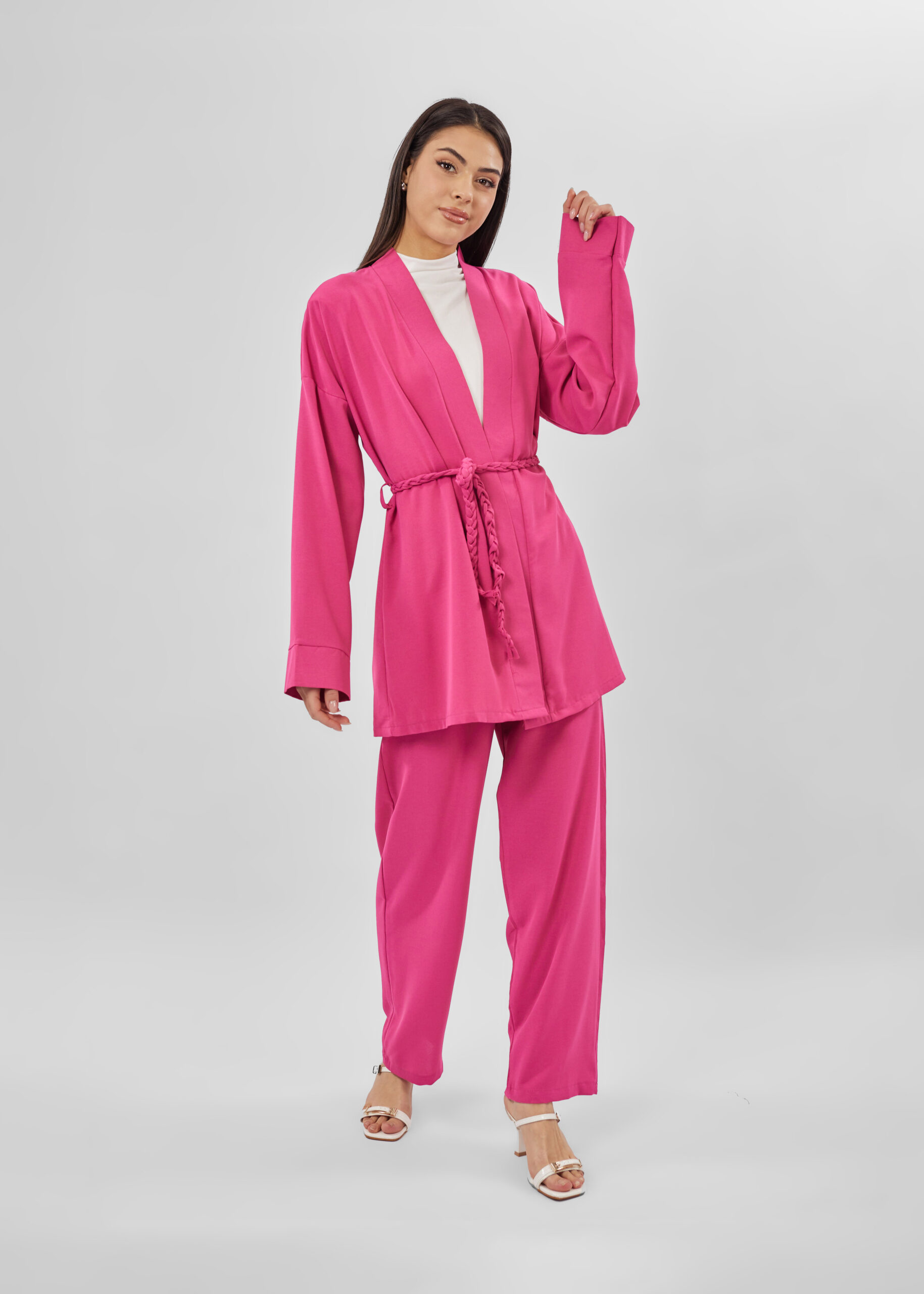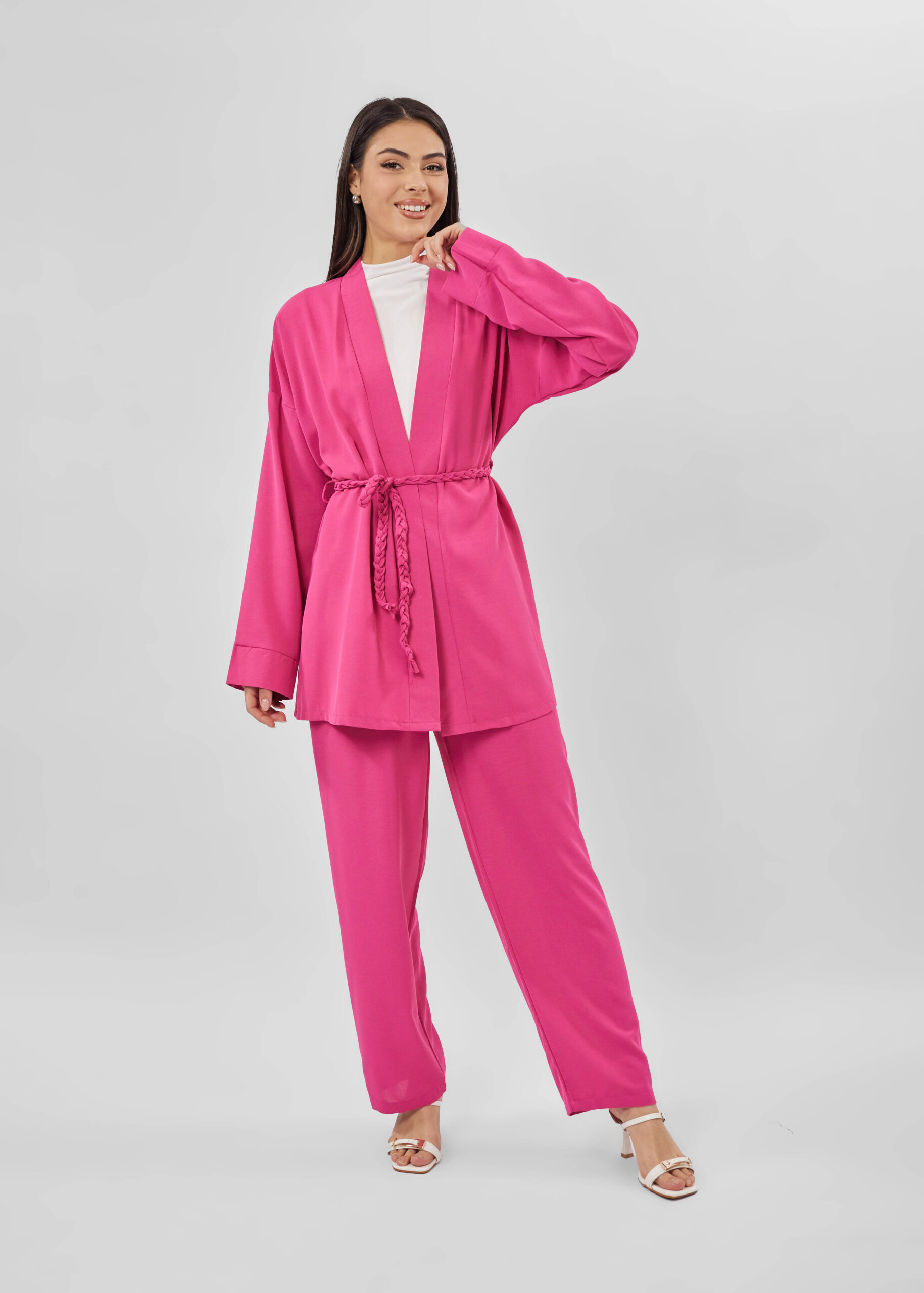 طقم نسائي, قطعتين, سادة, كارديجان, مفتوح, اكمام طويلة, حزام خصر مجدل للربط, بنطلون, واسع, خصر مطاطي, انيق وعصري
