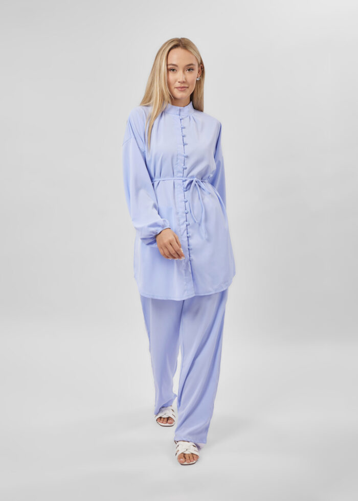 طقم نسائي, قطعتين, سادة, قميص, ياقة مدورة, ازرار من الامام للاغلاق, اكمام طويلة مع معصم ضيق, بنطلون, واسع, خصر مطاطي, انيق وعصري
