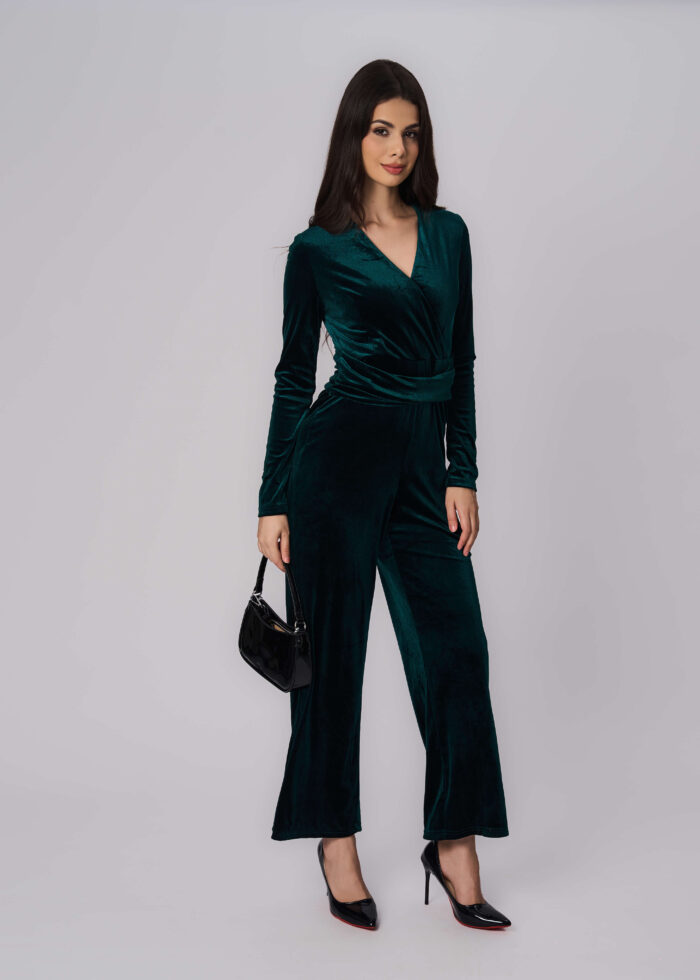 جمبسوت نسائي, مخمل, ياقة سبعة مع سحاب من الخلف للاغلاق, اكمام طويلة, ساق واسعة, مزين بتصميم قطعة ملتفة من الامام, انيق وعصري