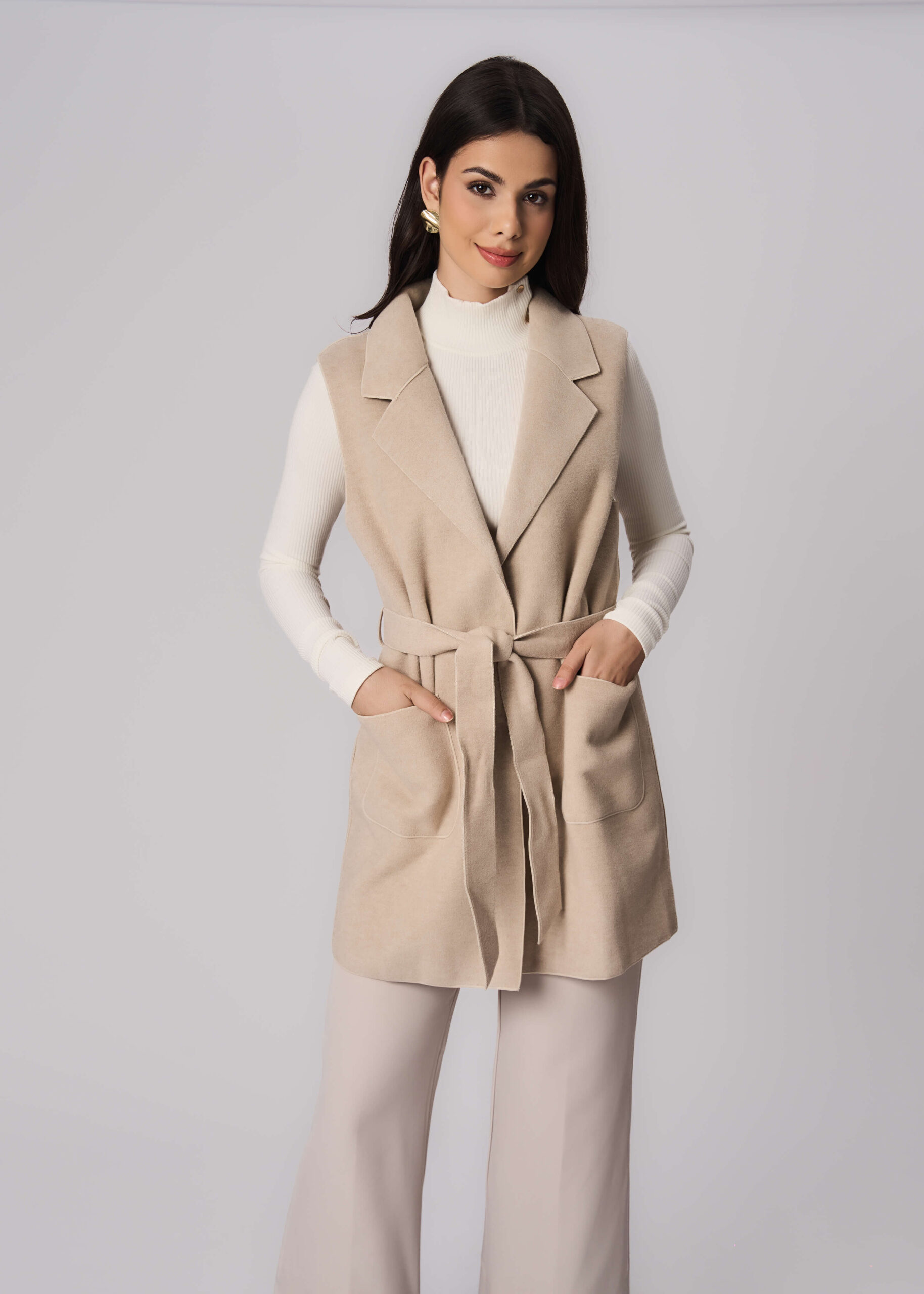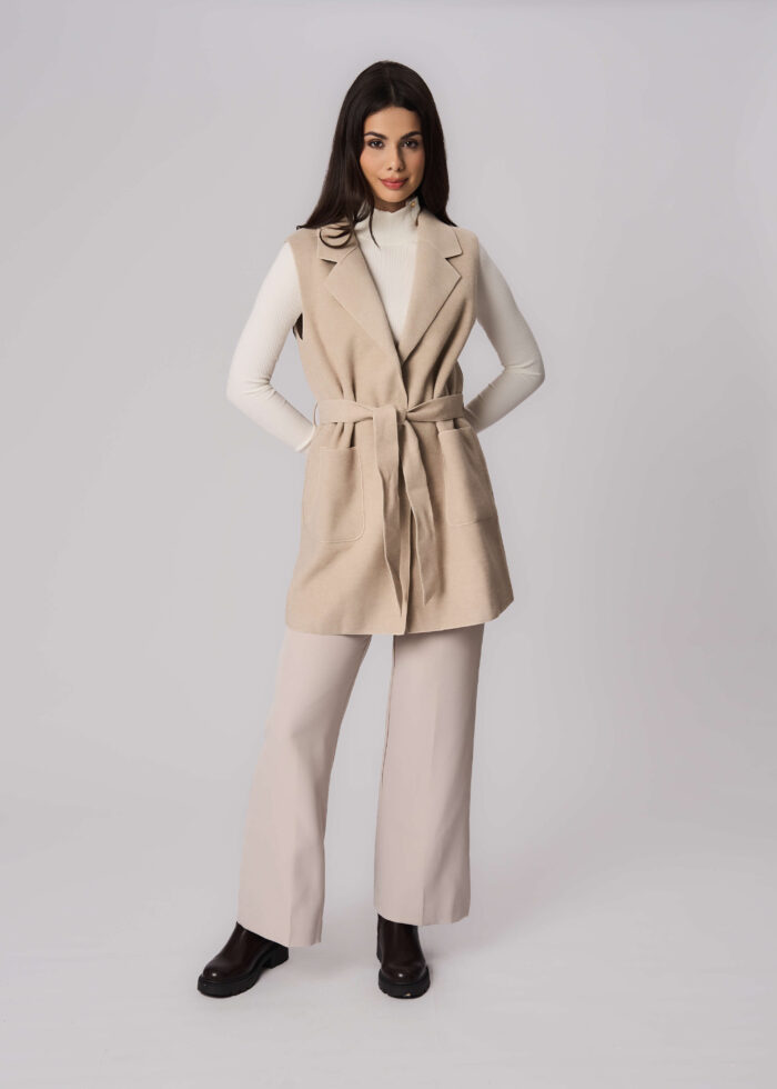 فيست نسائي, جوخ صوفي, سادة, ياقة سبعة مثنية, بدون اكمام, زر من الامام, حزام للربط على الخصر, جيوب من الامام, انيق وعملي