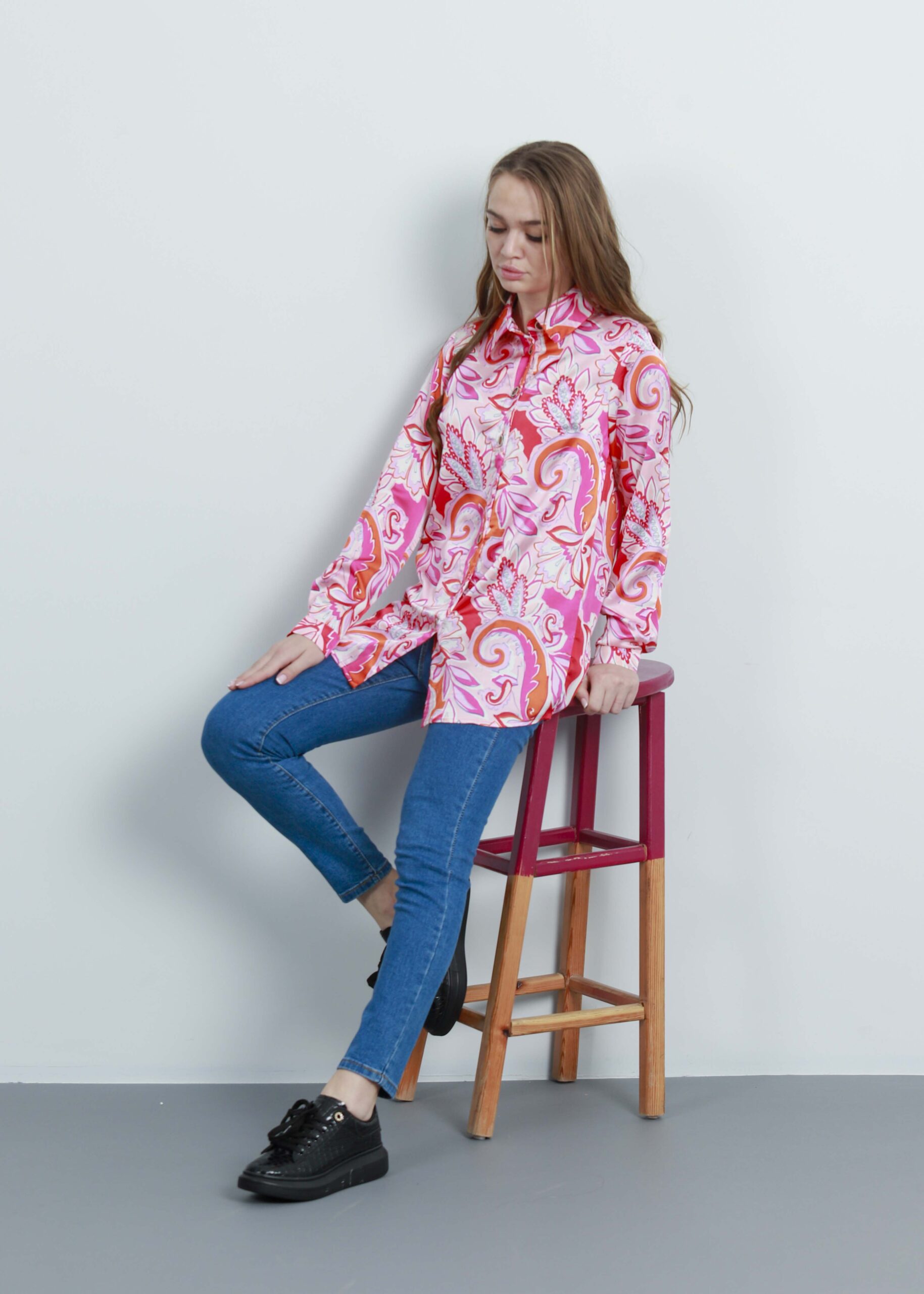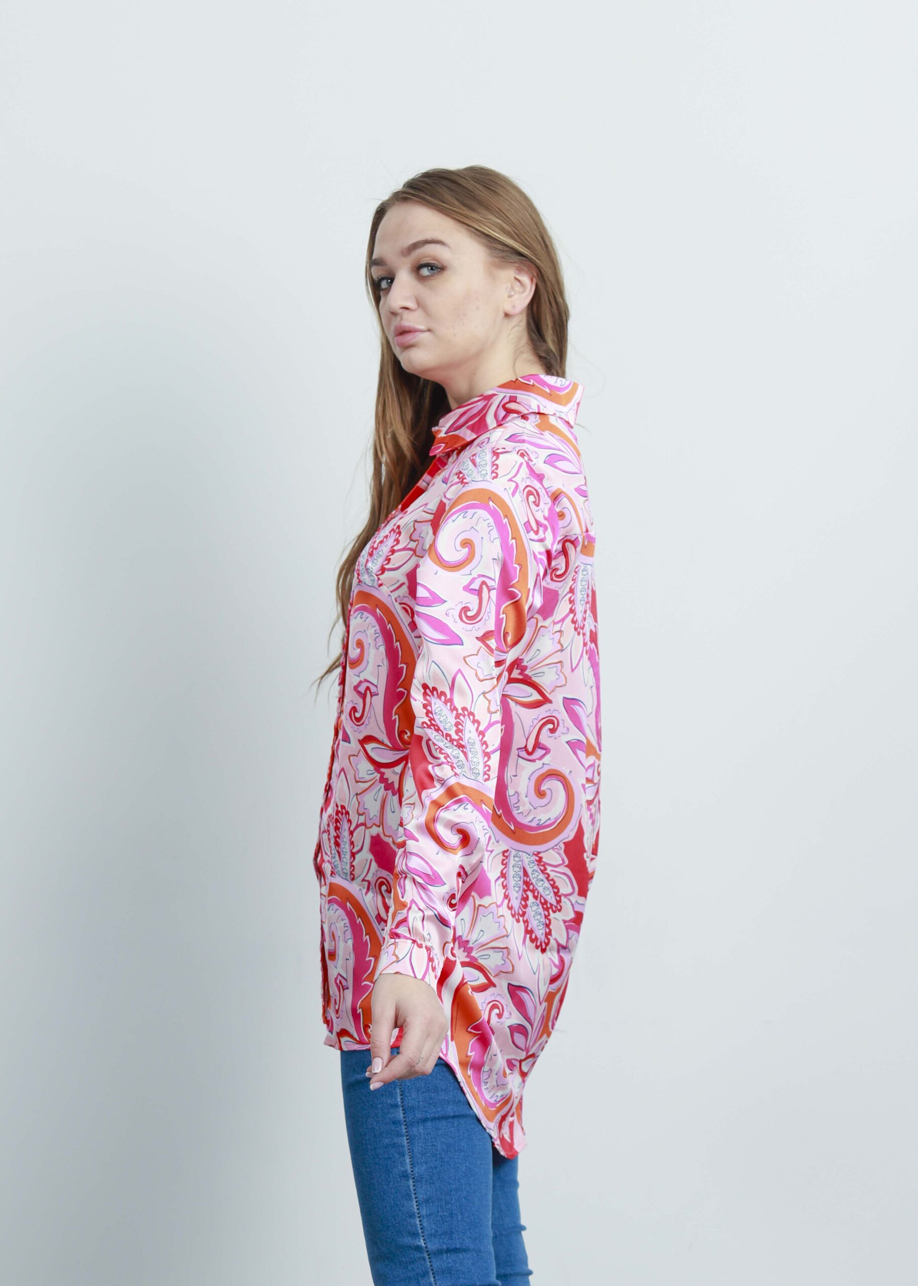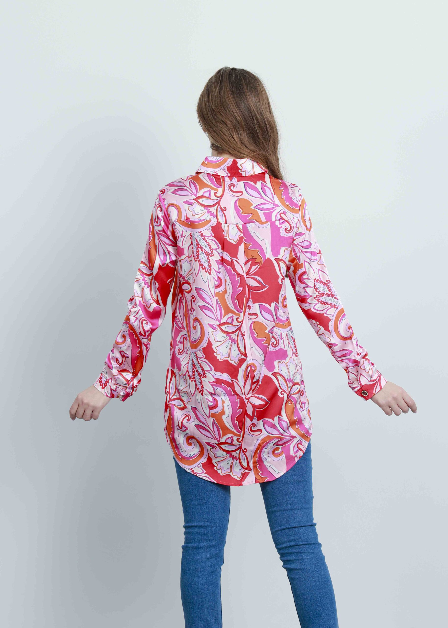 قميص نسائي, معرق, ساتان, اكمام طويلة مع معصم ضيق وزر للاغلاق, ازرار امامية للاغلاق, ياقة مثنية, من الخلف اطول من الامام, انيق بالوان زاهية, 100% بوليستر