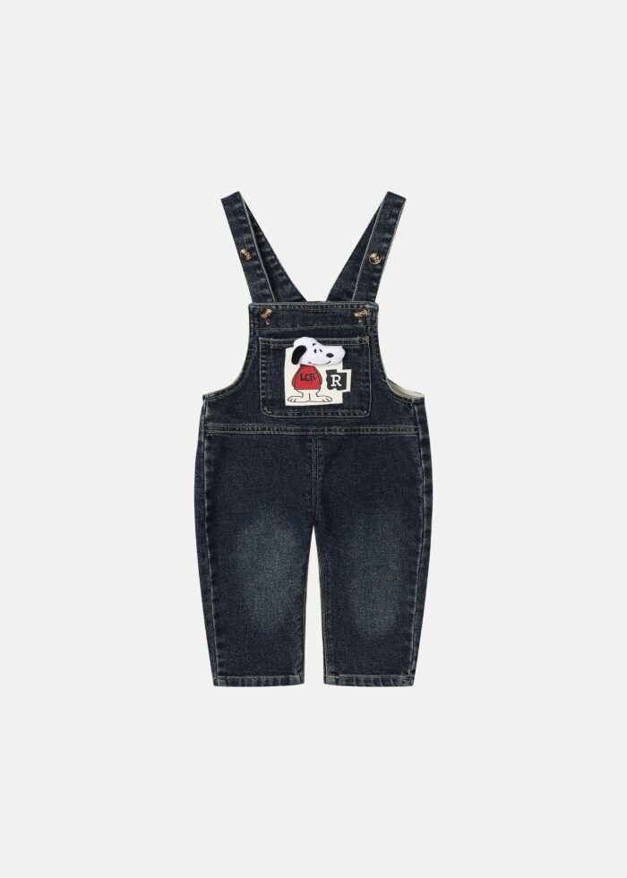 Baby boy overall, jeans, straight neckline and straps with buttons to close, back pocket, patch pocket on the chest with snoopy printed decor, unique and modern