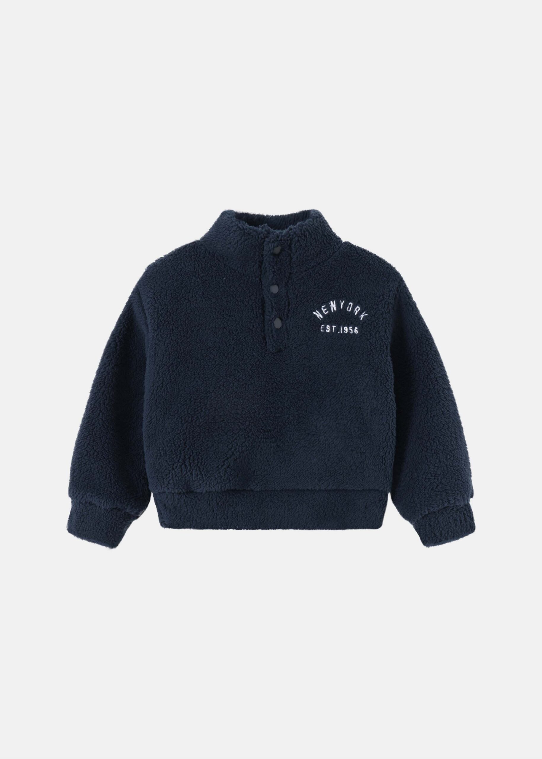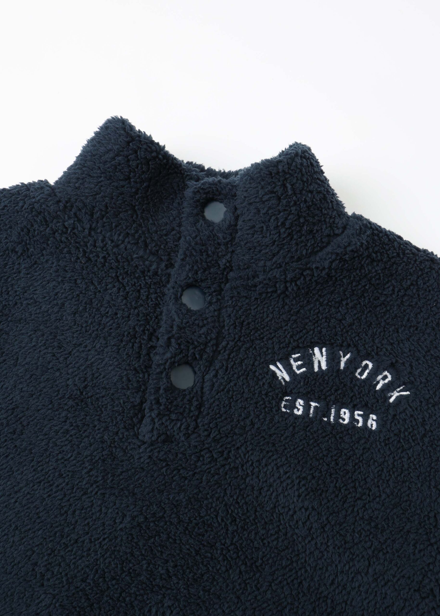 Baby boy pajama, two-pieces, “New York” printed, blouse, high neck with front buttons, long sleeves, trouser, plain, elastic waist, elastic ankle, practical and comfortable