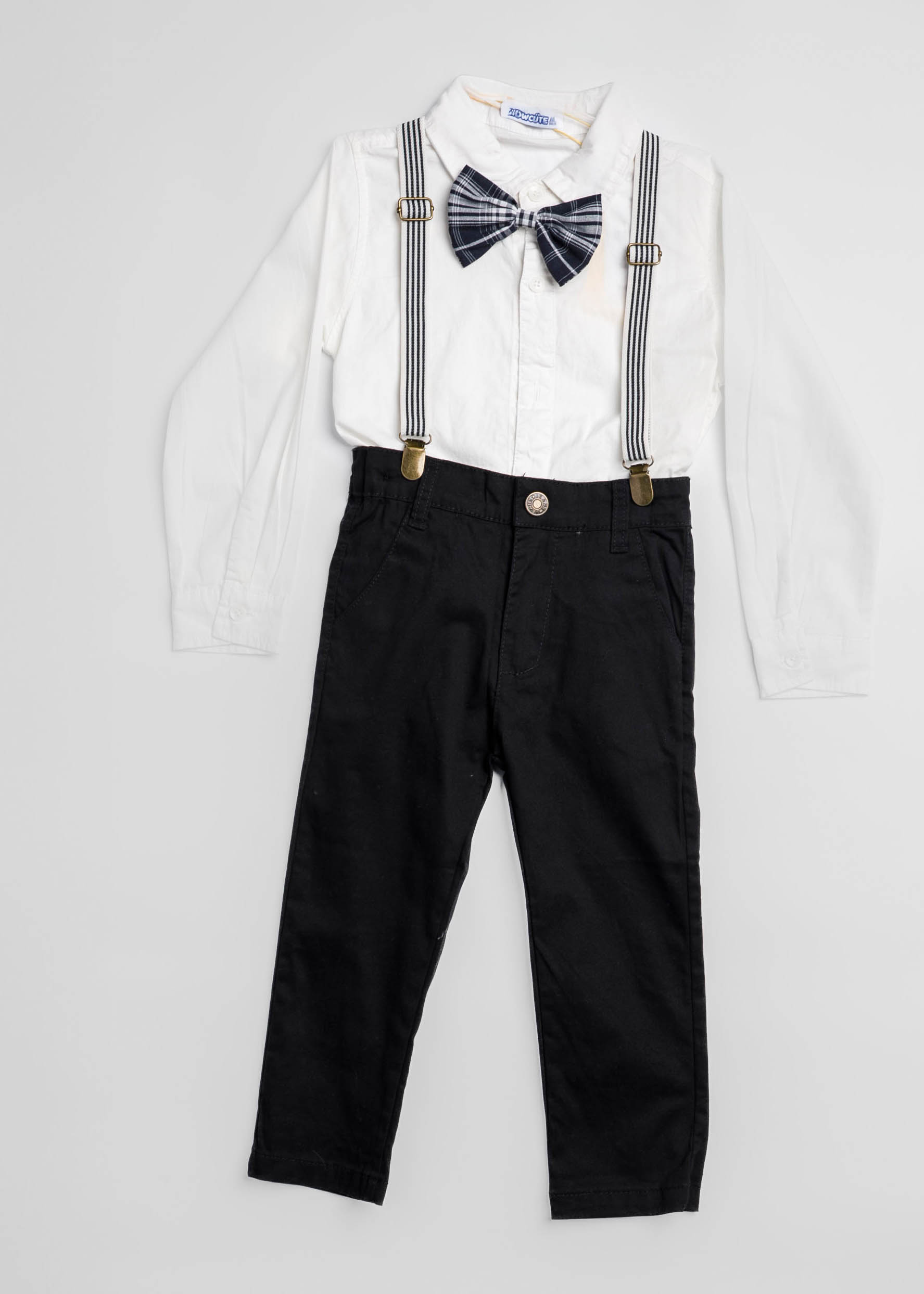 Baby boy suit, two-pieces, shirt, plain, rolled collar with front bow, front buttons to close, long sleeves with tight cuff, suspenders, trouser, plain, front button and zipper closure, front and back pockets, unique and modern