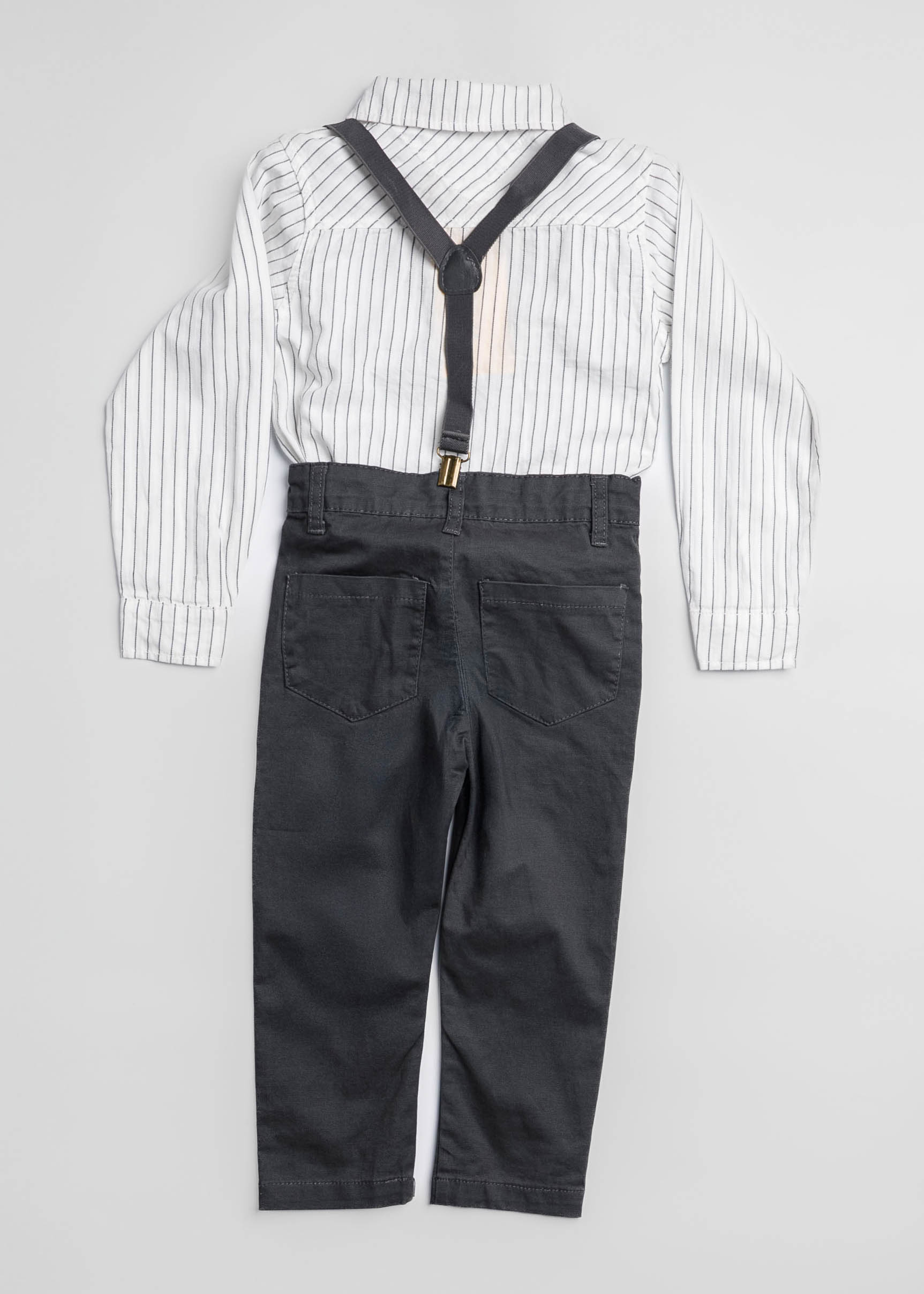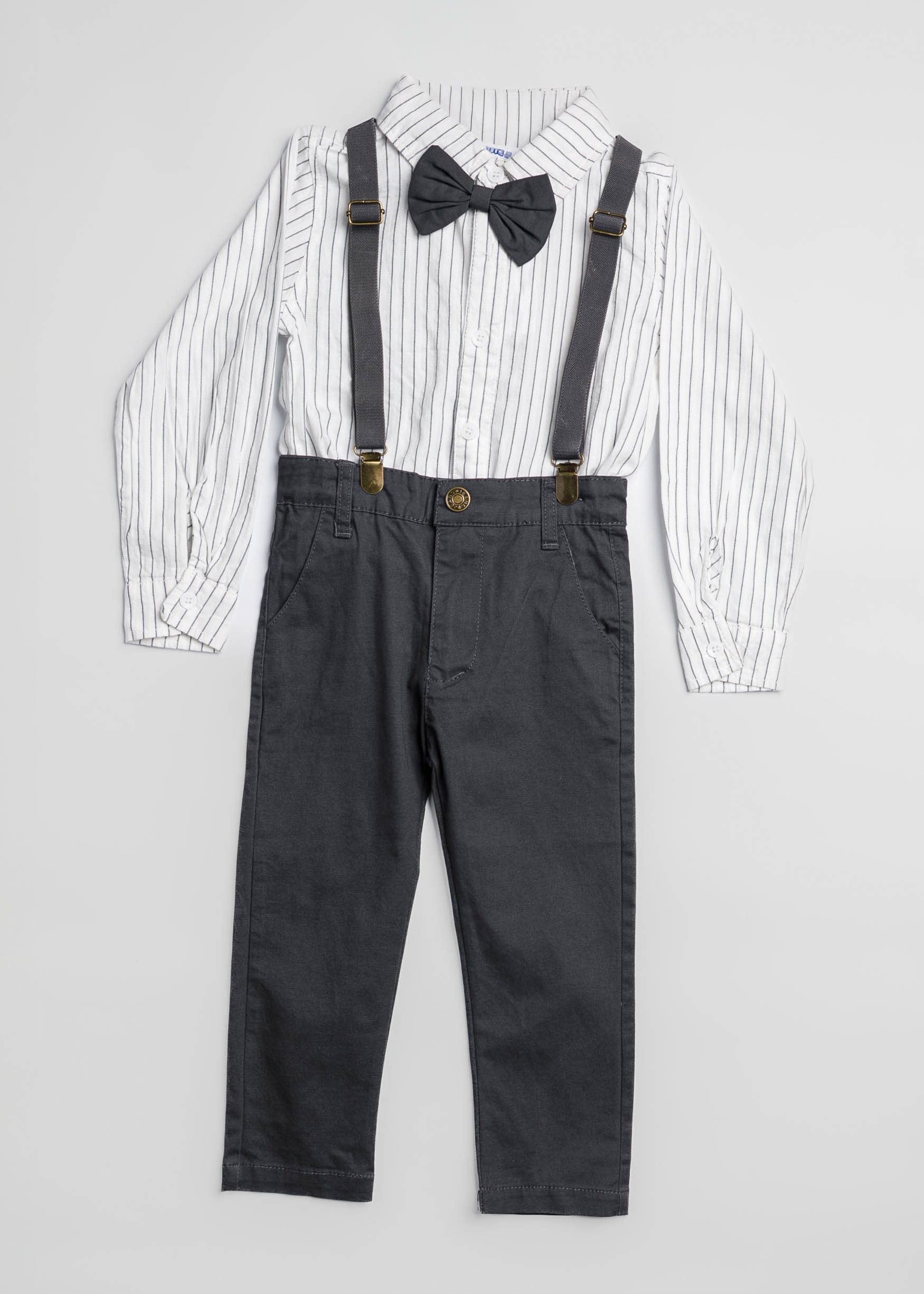 Baby boy suit, two-pieces, shirt, striped, rolled collar with front bow, front buttons to close, long sleeves with tight cuff, suspenders, trouser, plain, front button and zipper closure, front and back pockets, unique and modern