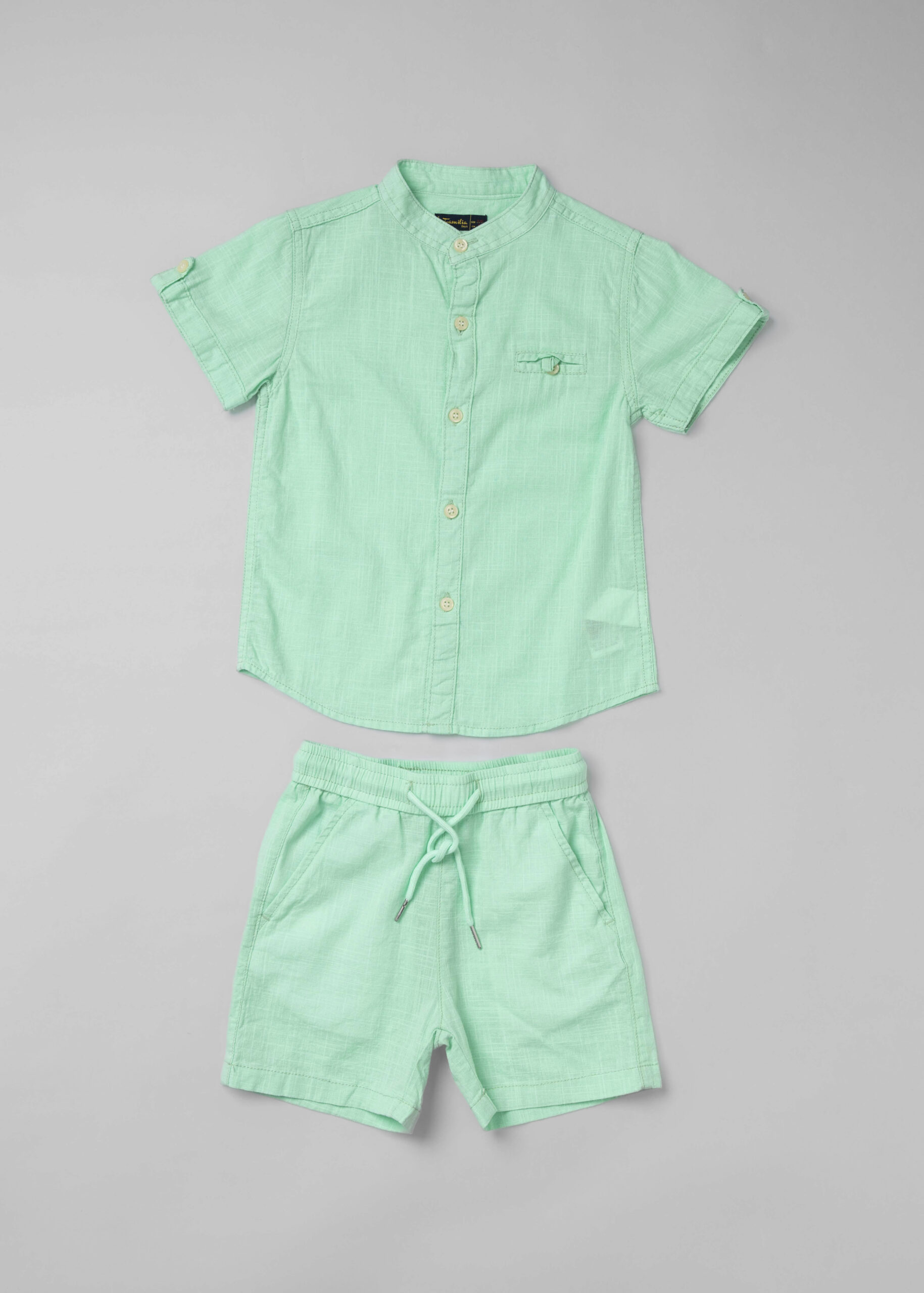 Baby boy suit, two-pieces, shirt, plain, round neck, short sleeves, front buttons to close, short, elastic waist with front tie, front pockets, unique and modern