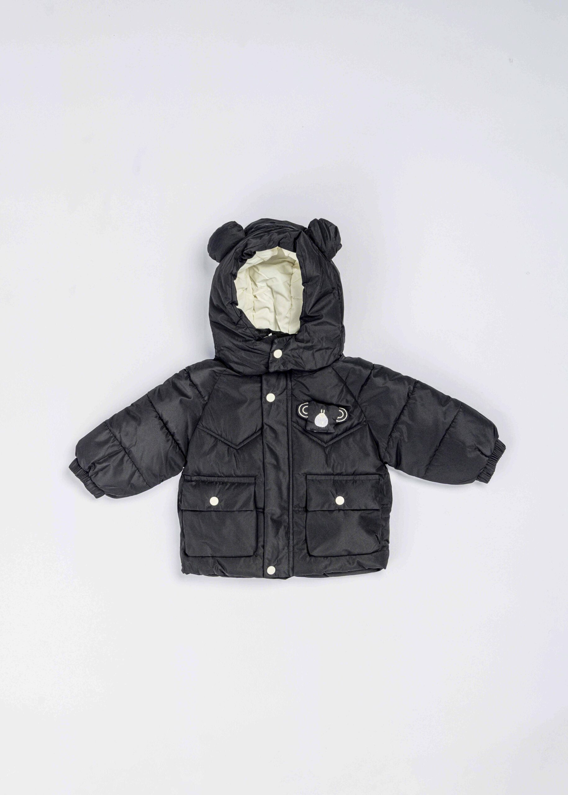 Baby boy jacket, waterproof, striped fabric, bear design hood with front buttons, front button and zipper closure, long sleeves with tight cuff, front pockets, ,back teddy bear decor, unique and practical