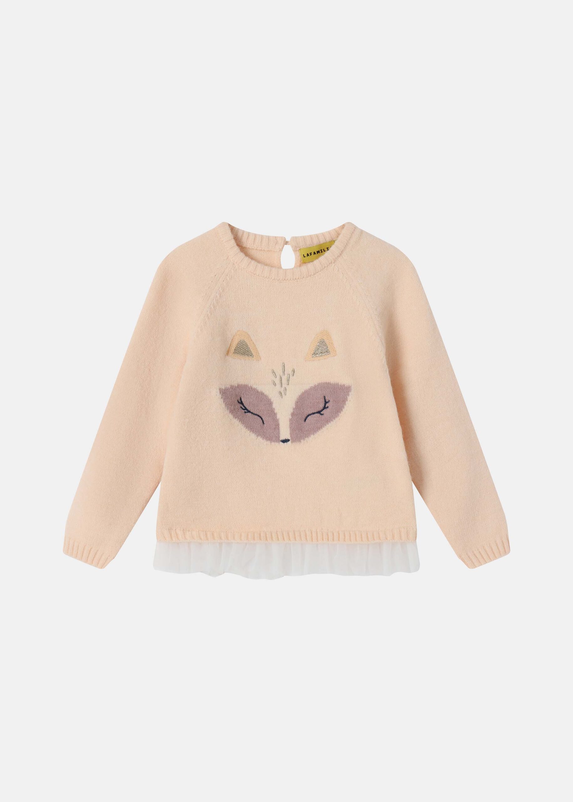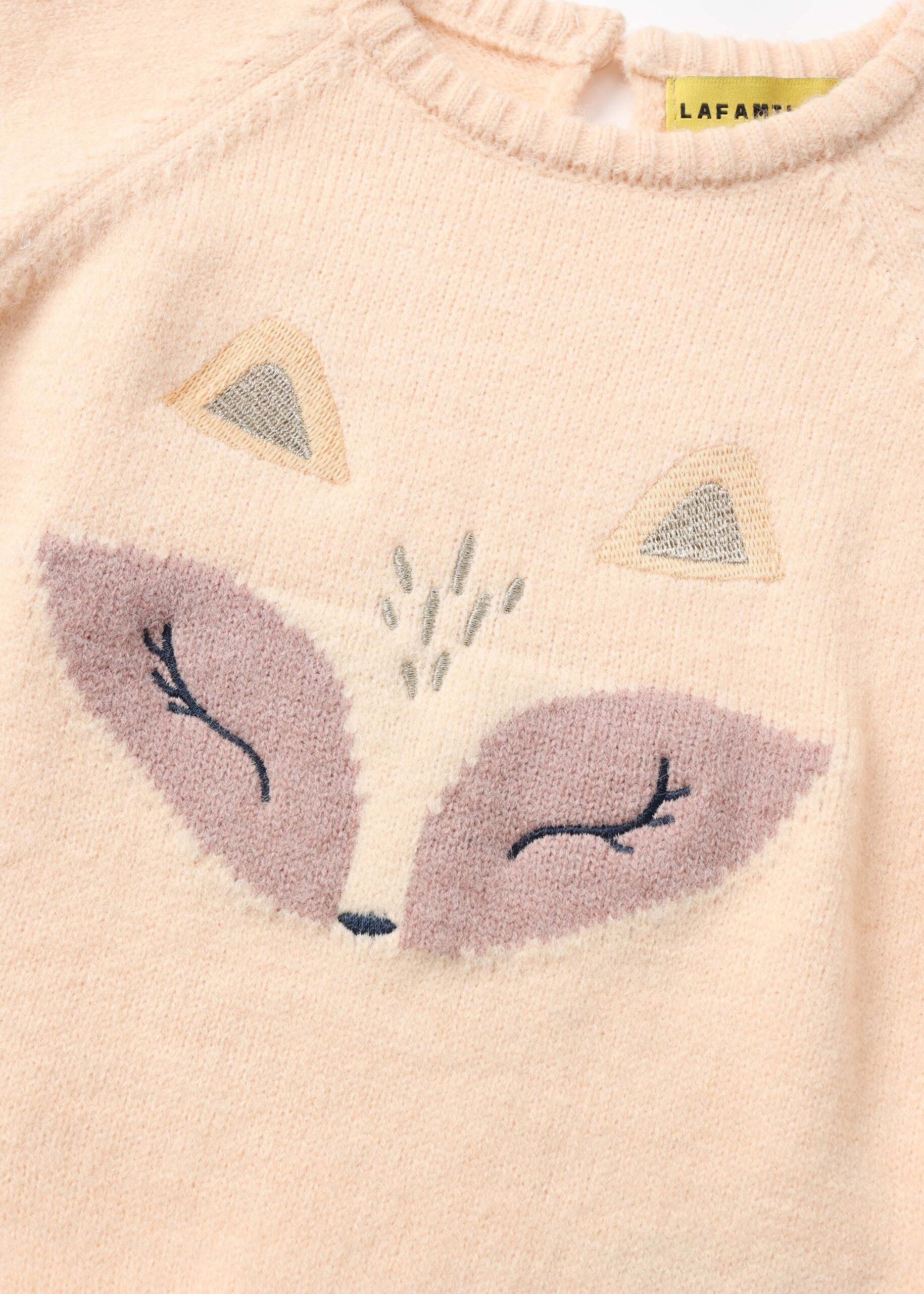 Baby blouse, knitted fabric, deer embroidery design from the front, round neck with back button to close, long sleeves, ruffled layer, unique and modern