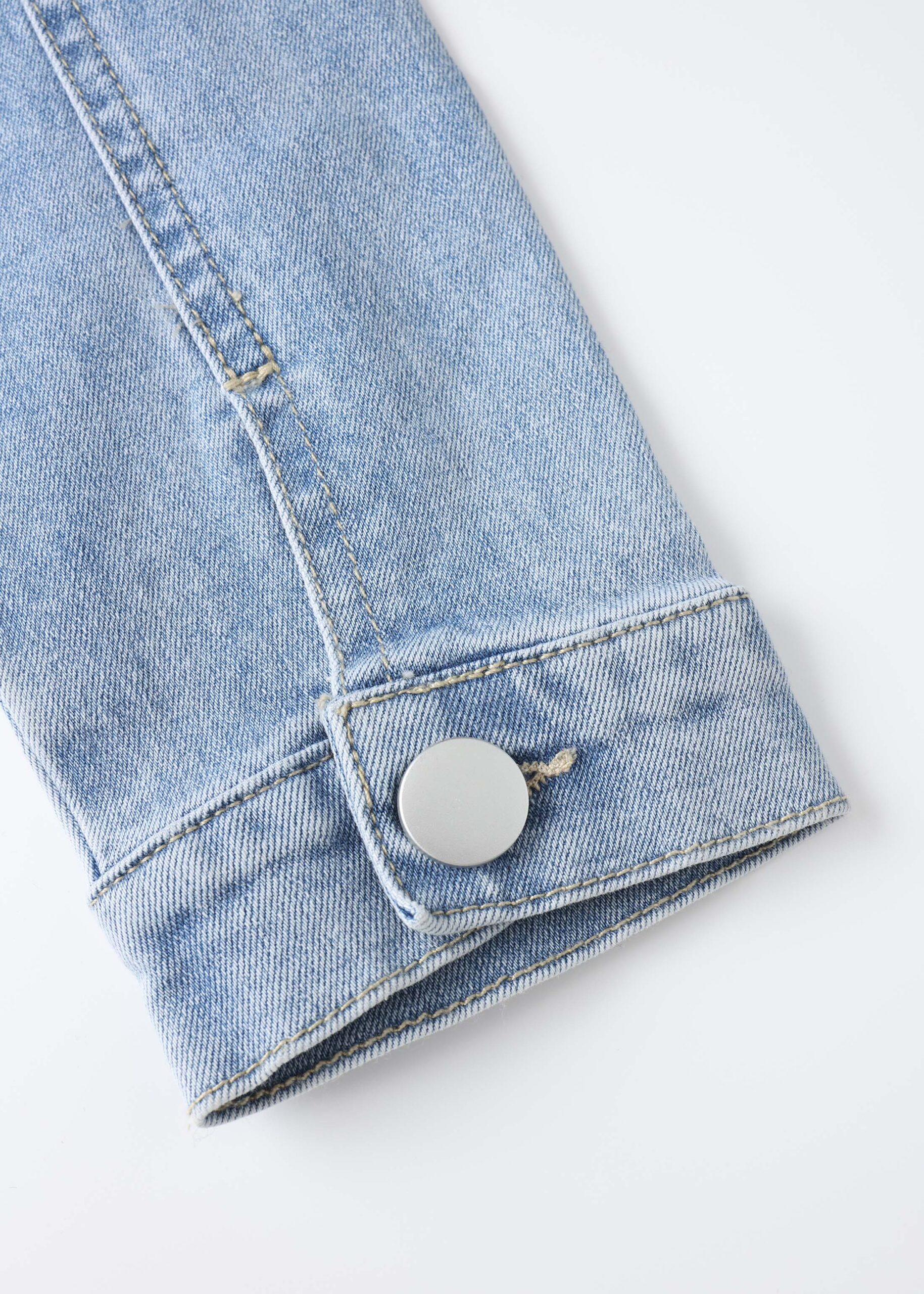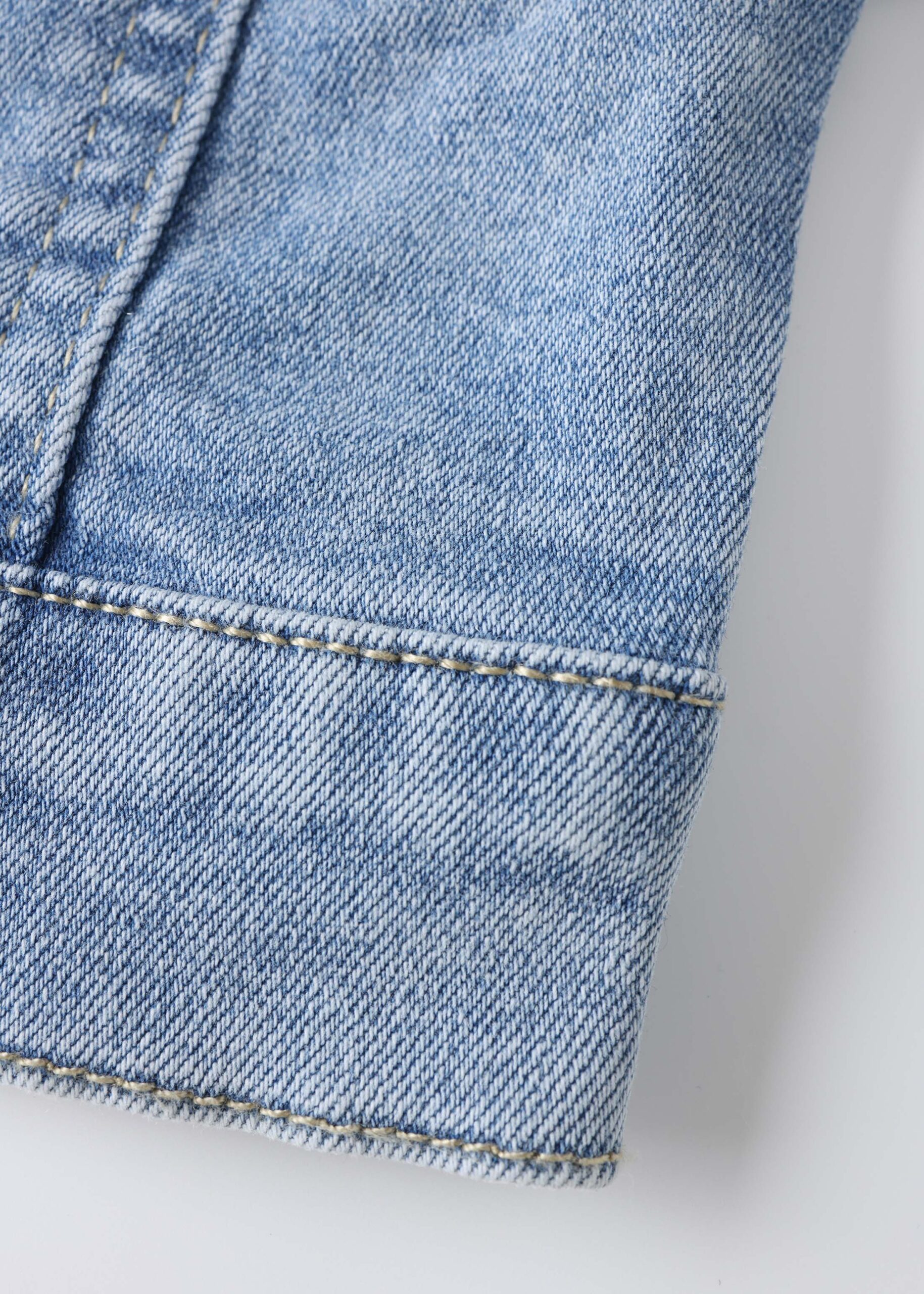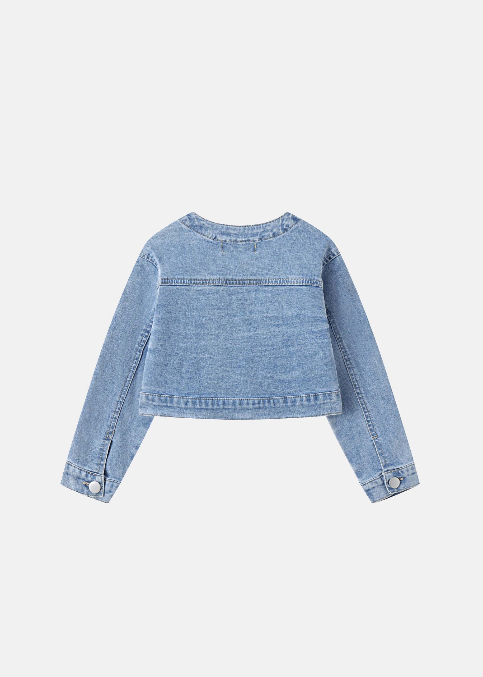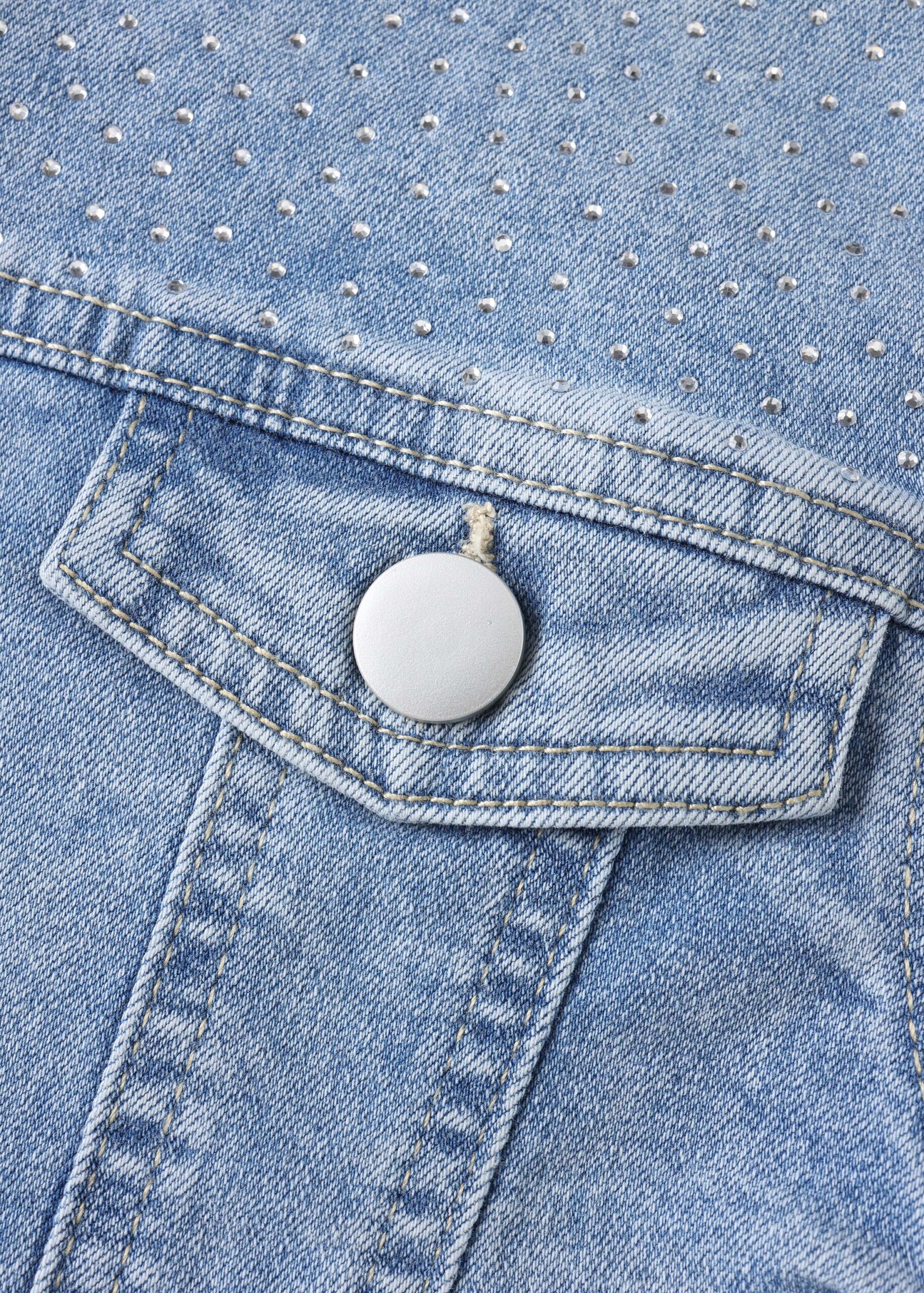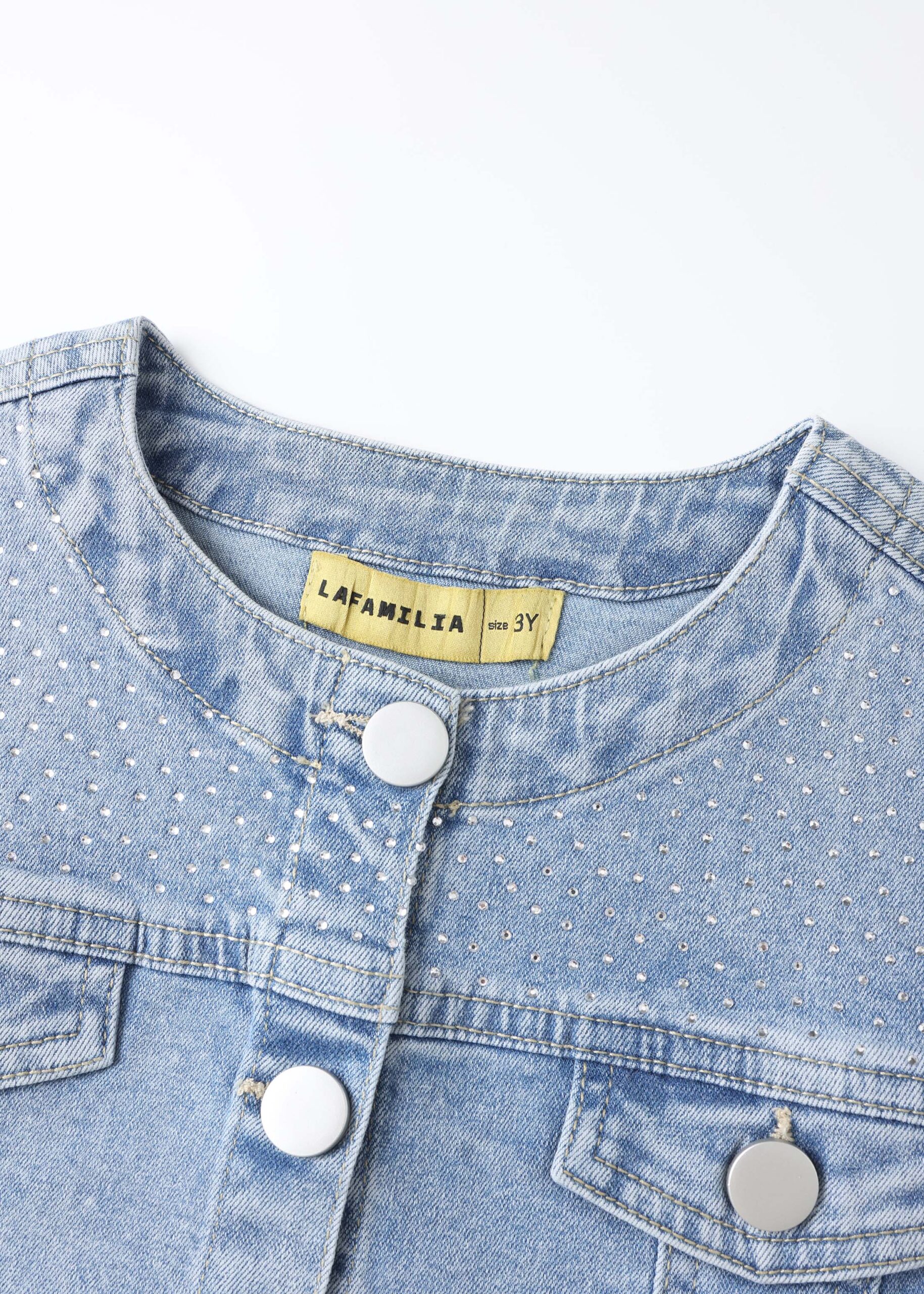 Baby girl jacket, denim, strass decor, round neck, front buttons to close, long sleeves with tight cuff, unique and modern