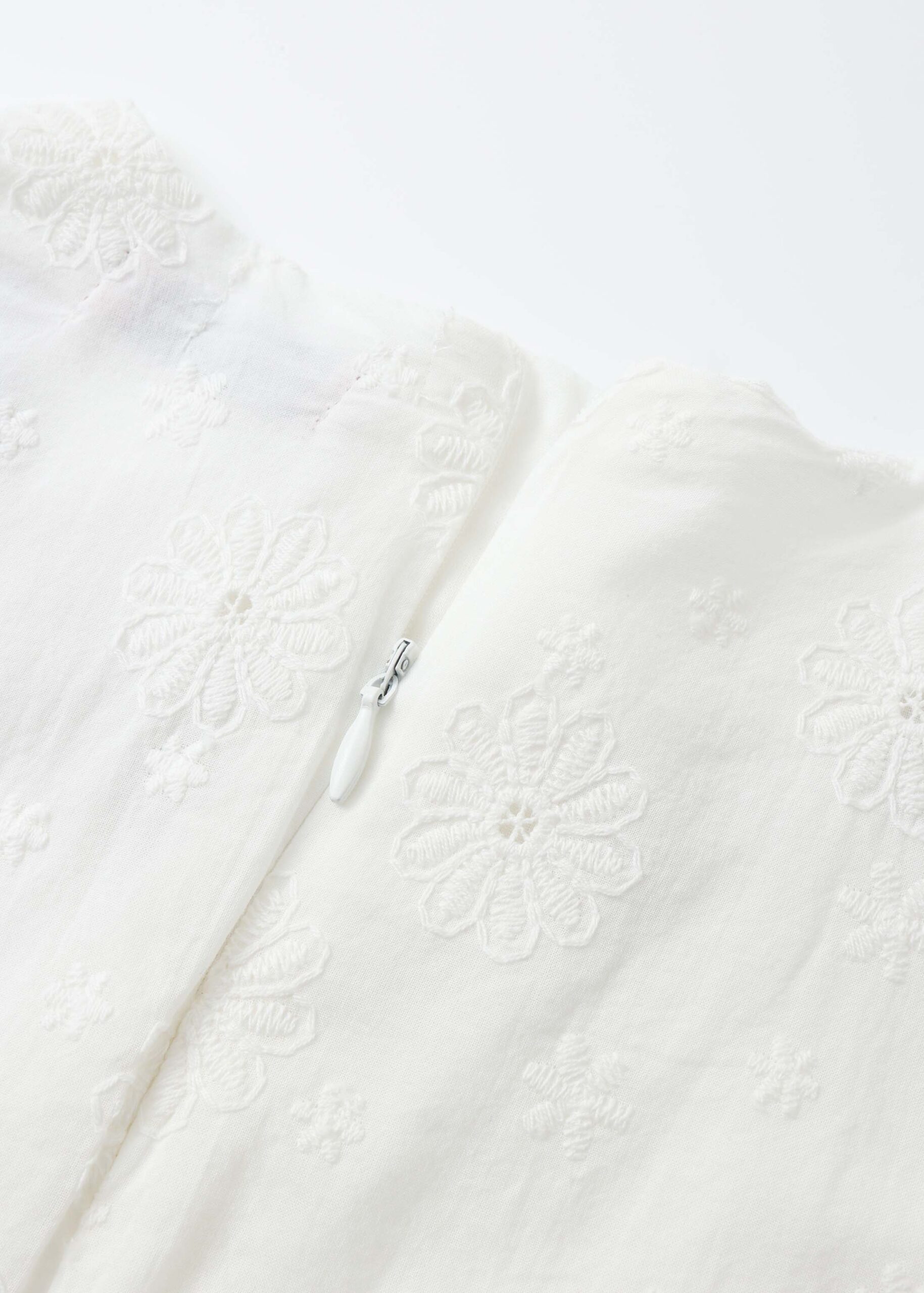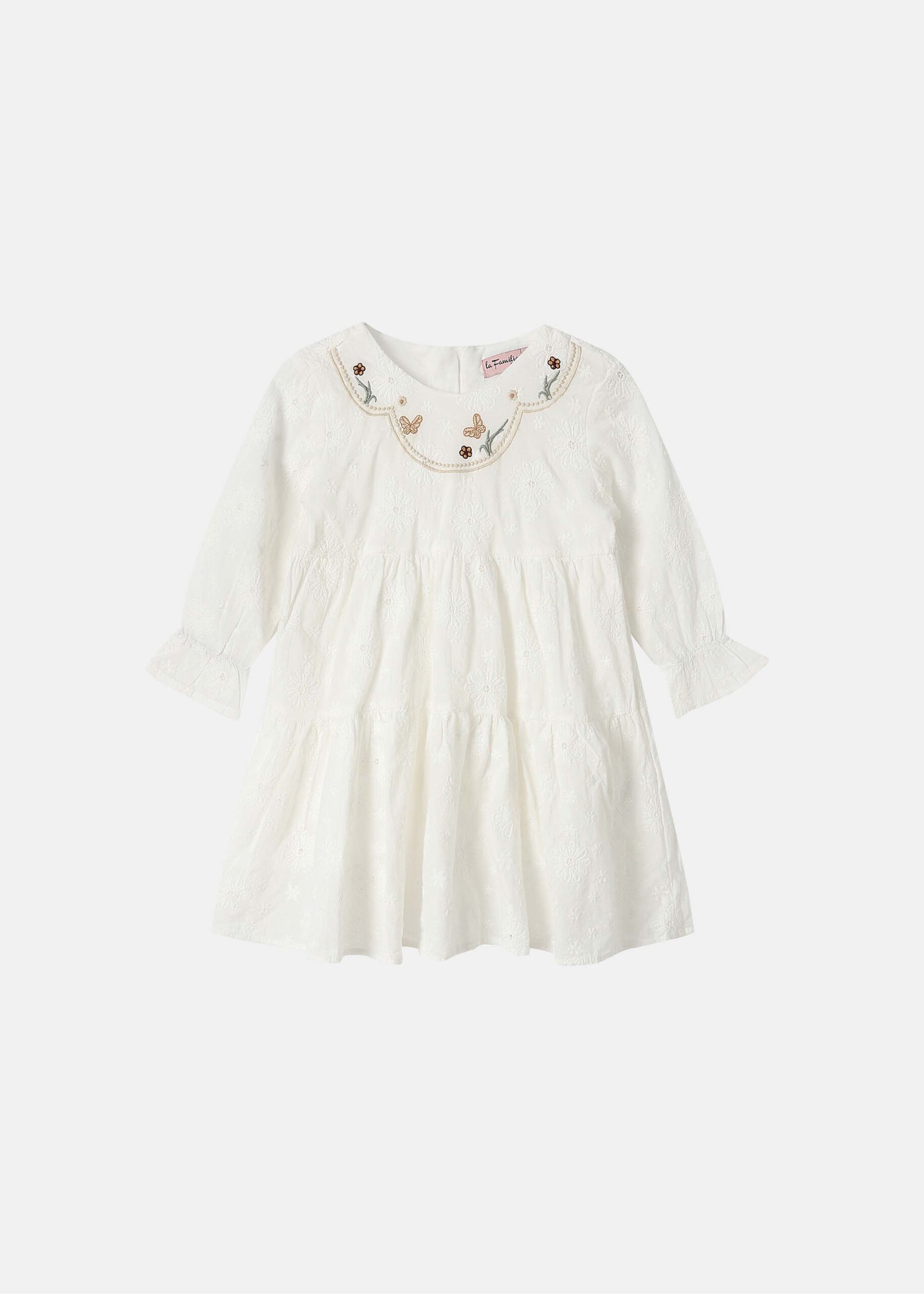 Baby girl dress, short, embroidered, layers, long sleeves with ruffled cuffs, round neck with back zip clousre, unique and modern