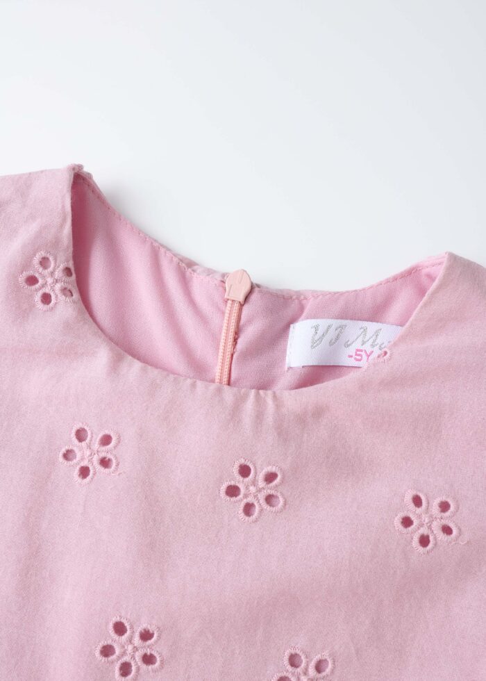 Baby girl dress, eyelet embroidery, round neck, back zipper closure, ruffled short sleeves, pleated waist with flowers decor from the front, unique and modern