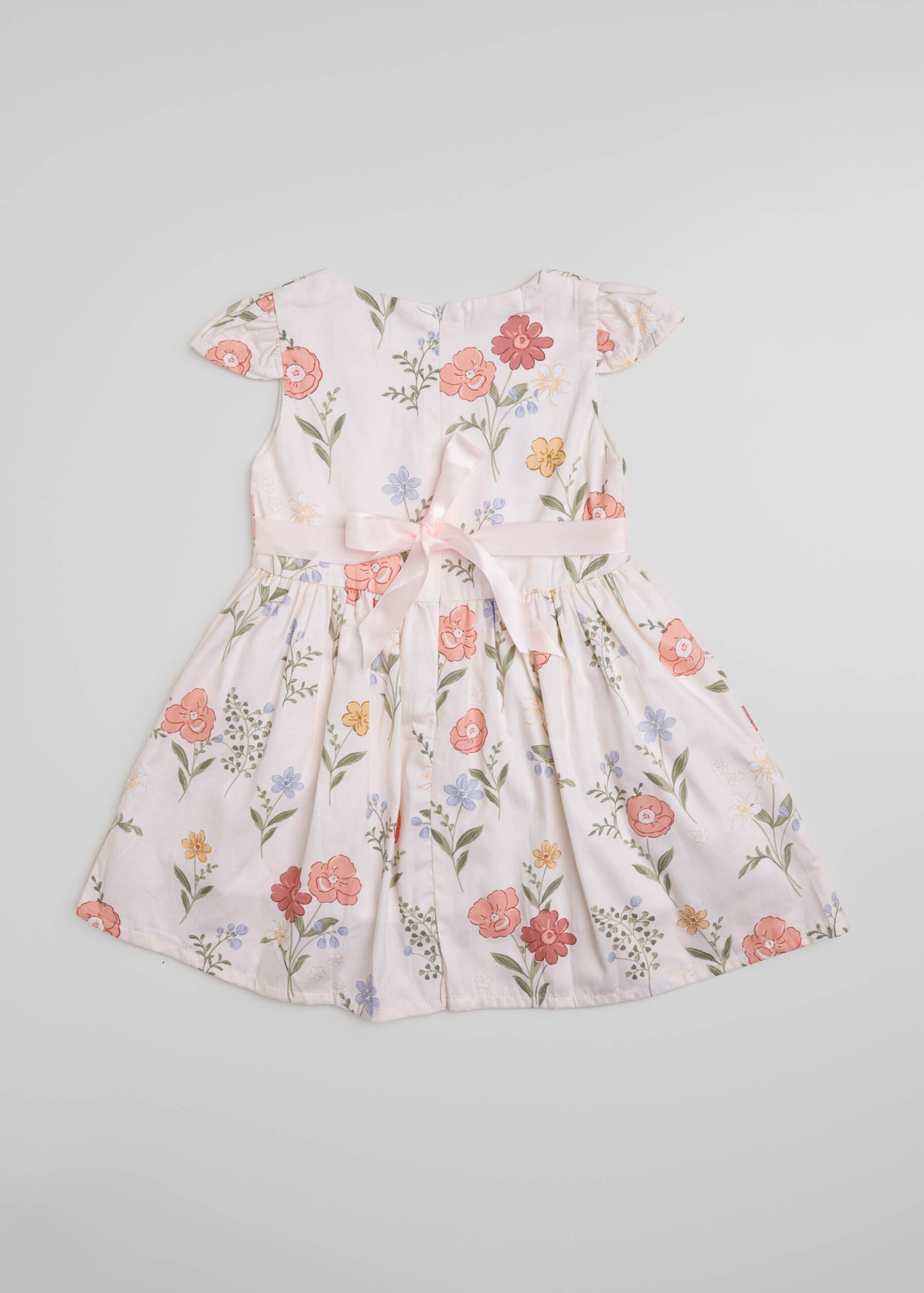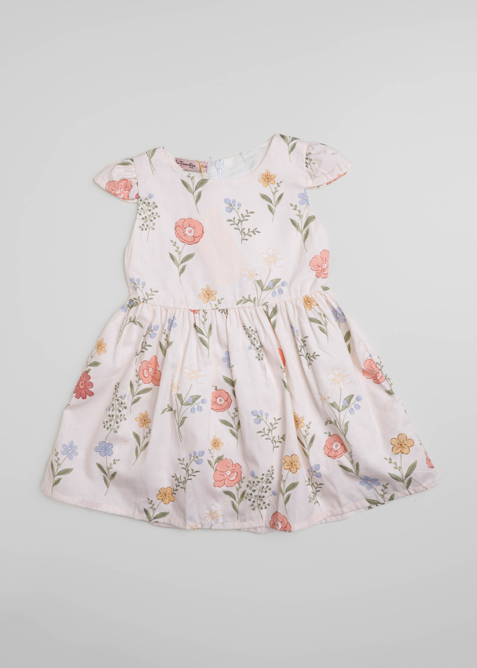 Baby girl dress, short, floral, round neck, back zipper closure, short sleeves, pleated waist, back tie, unique and modern