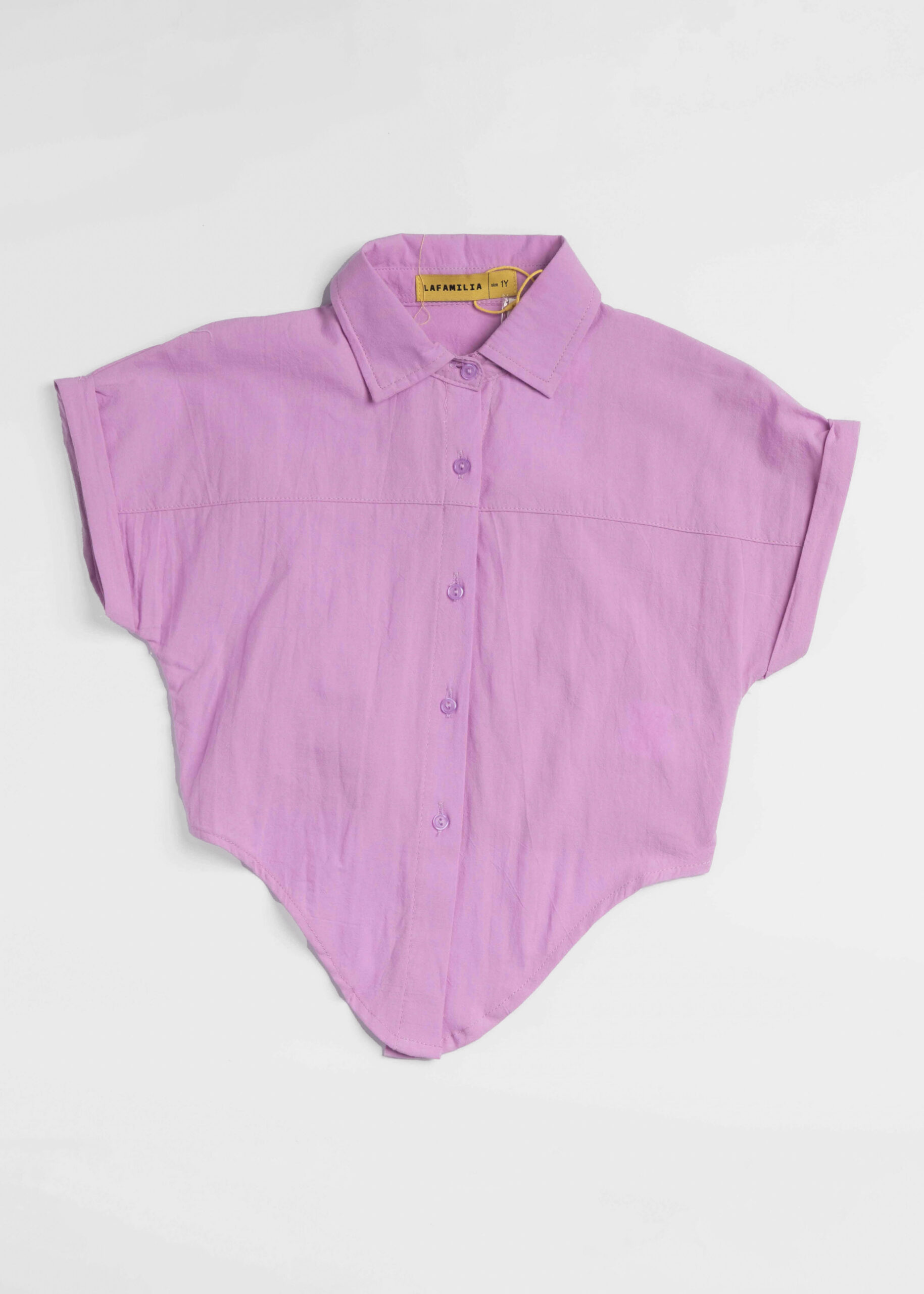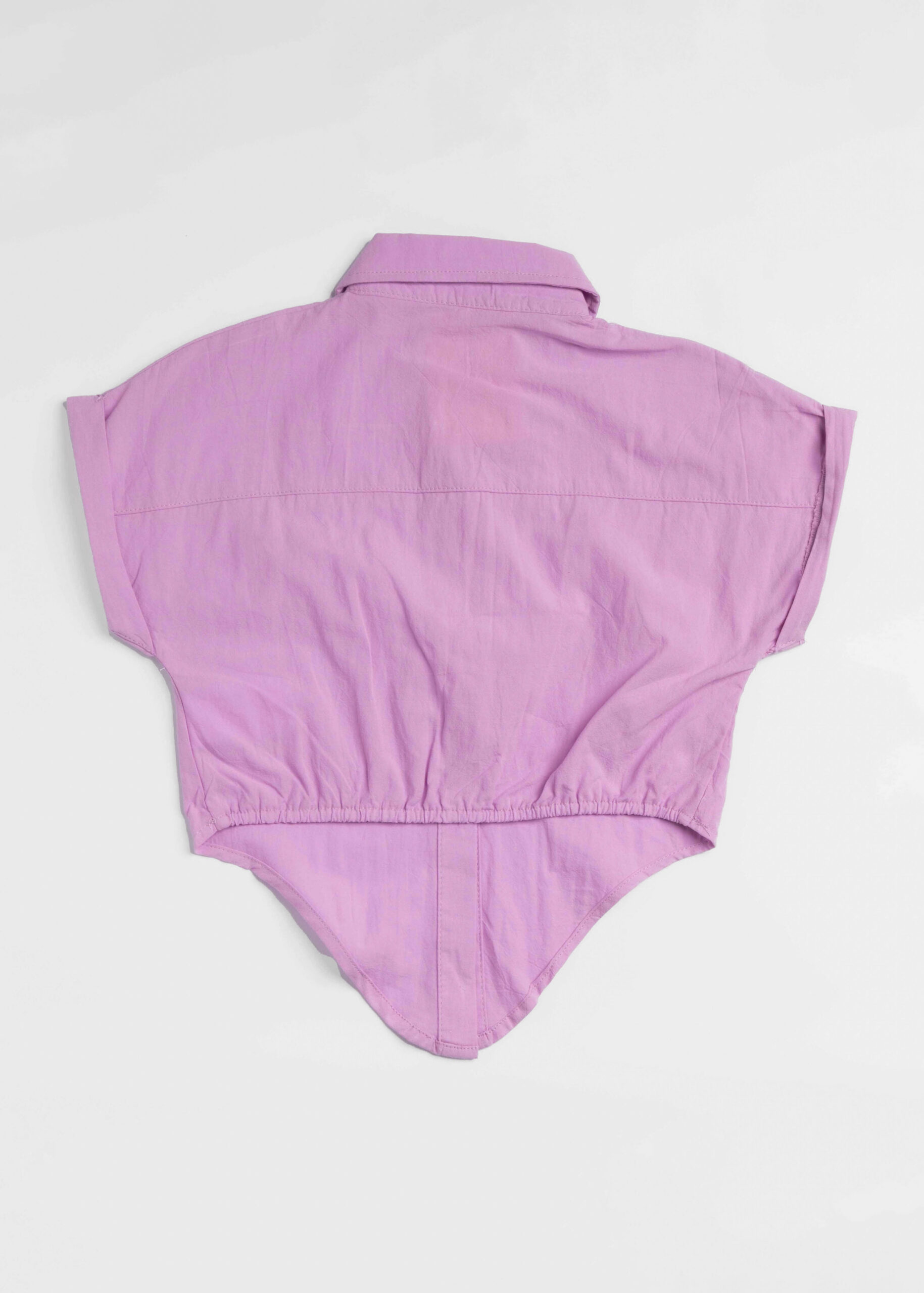 Baby girl shirt, plain, cropped, rolled collar, front buttons to close with bottom tie, short sleeves, unique and modern