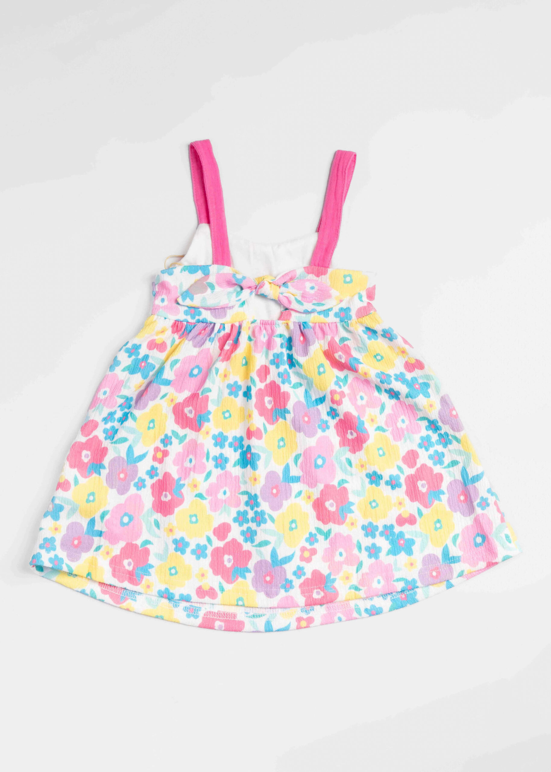 Baby girl dress, short, printed, sleeveless, pleated waist, bow decor from the back, unique and modern