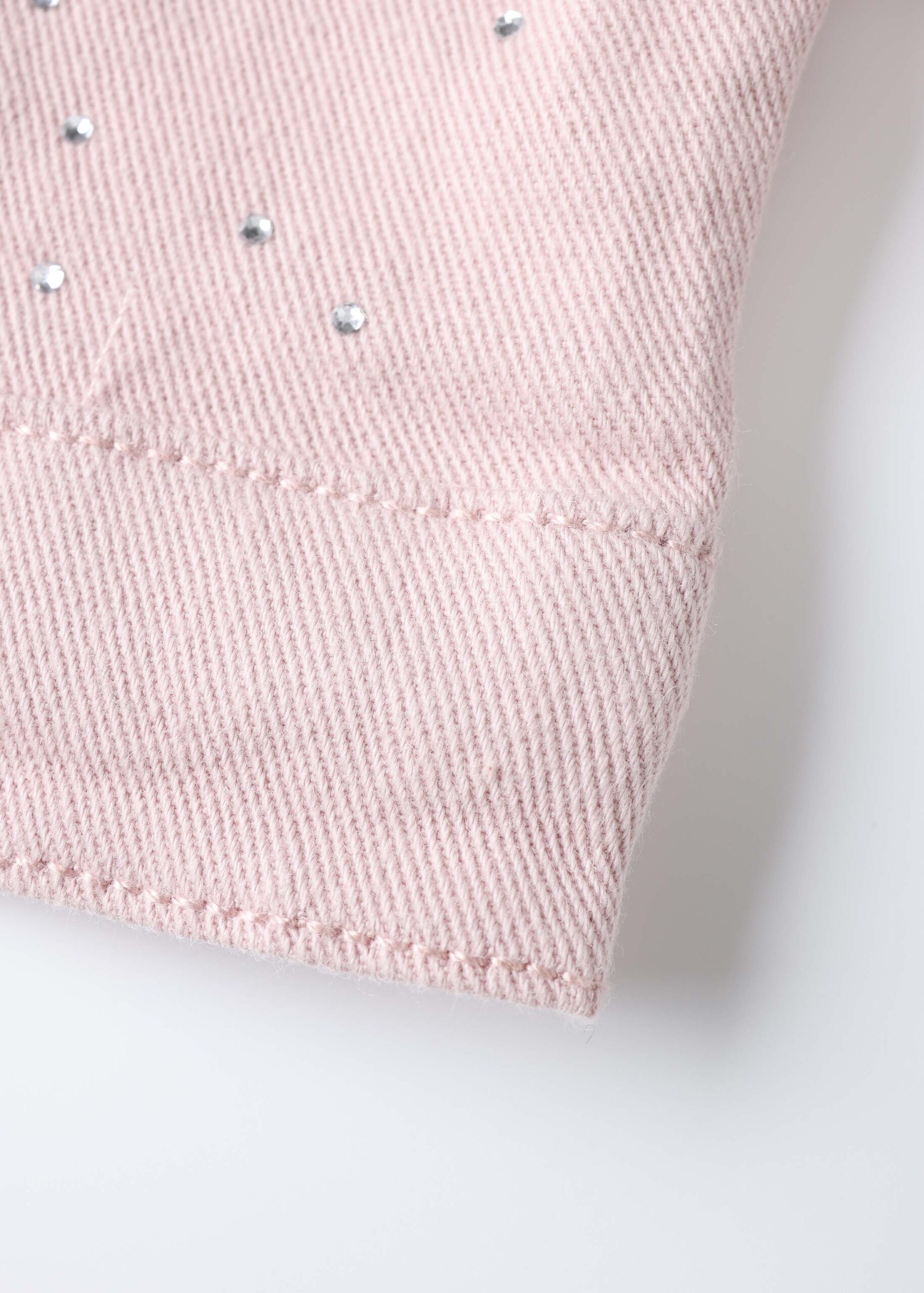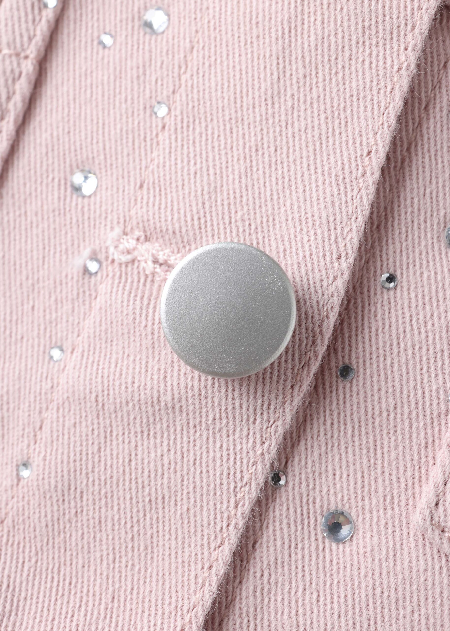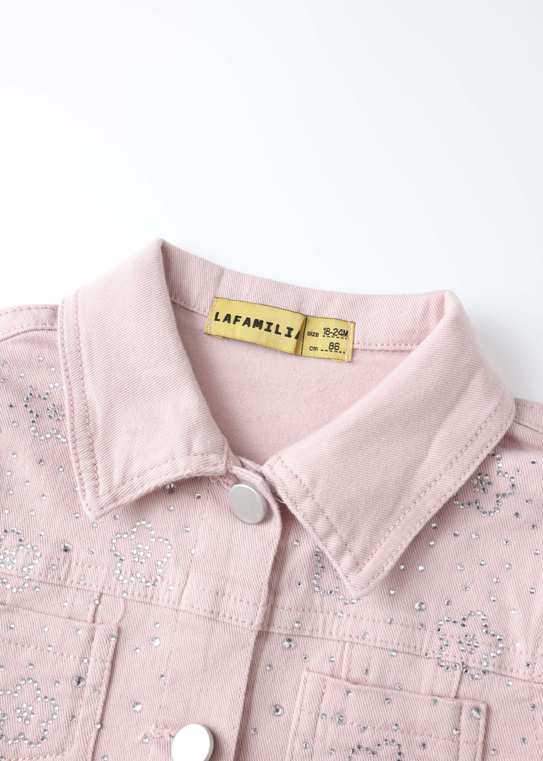 Baby girl jacket, denim, strass decor, rolled collar, front buttons to close, long sleeves with ruffled shoulders decor, fornt pockets, unique and practical