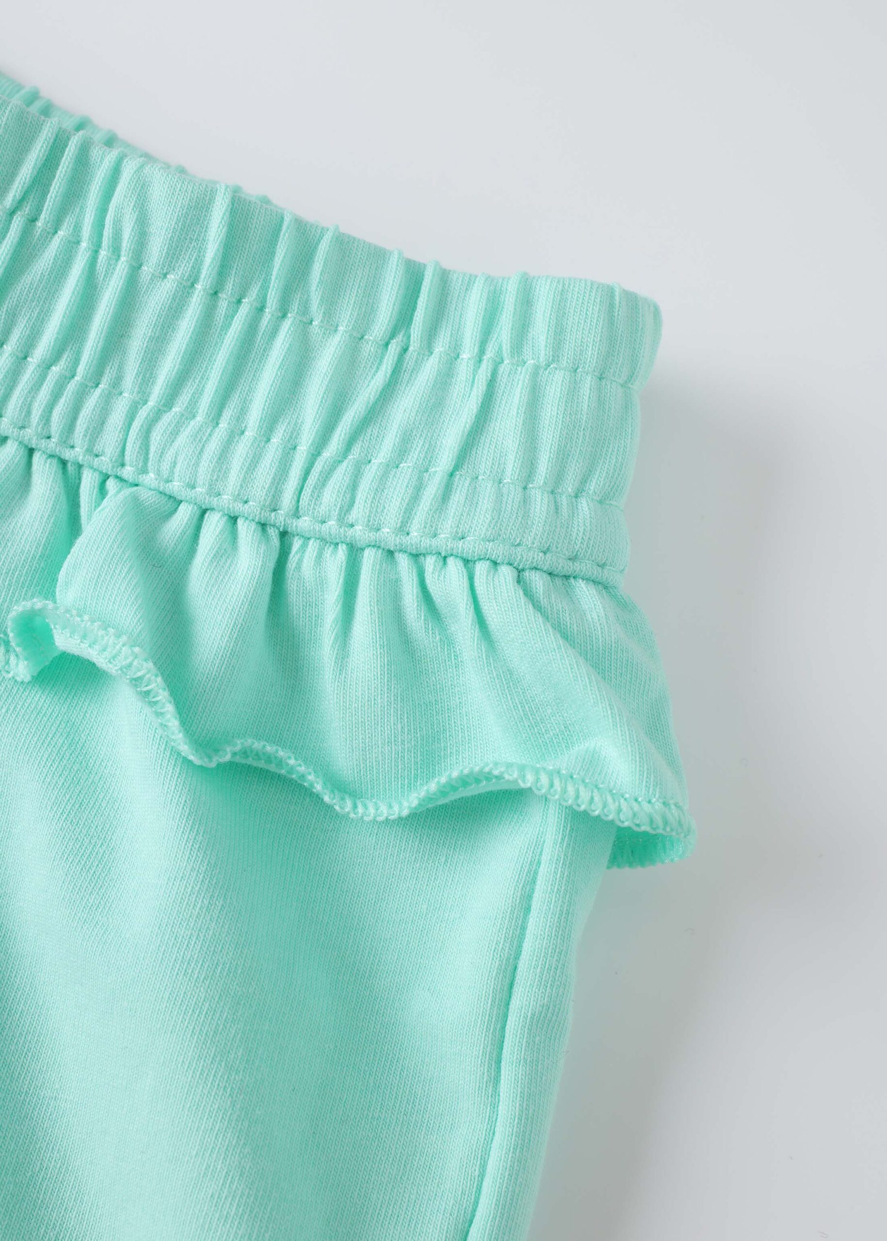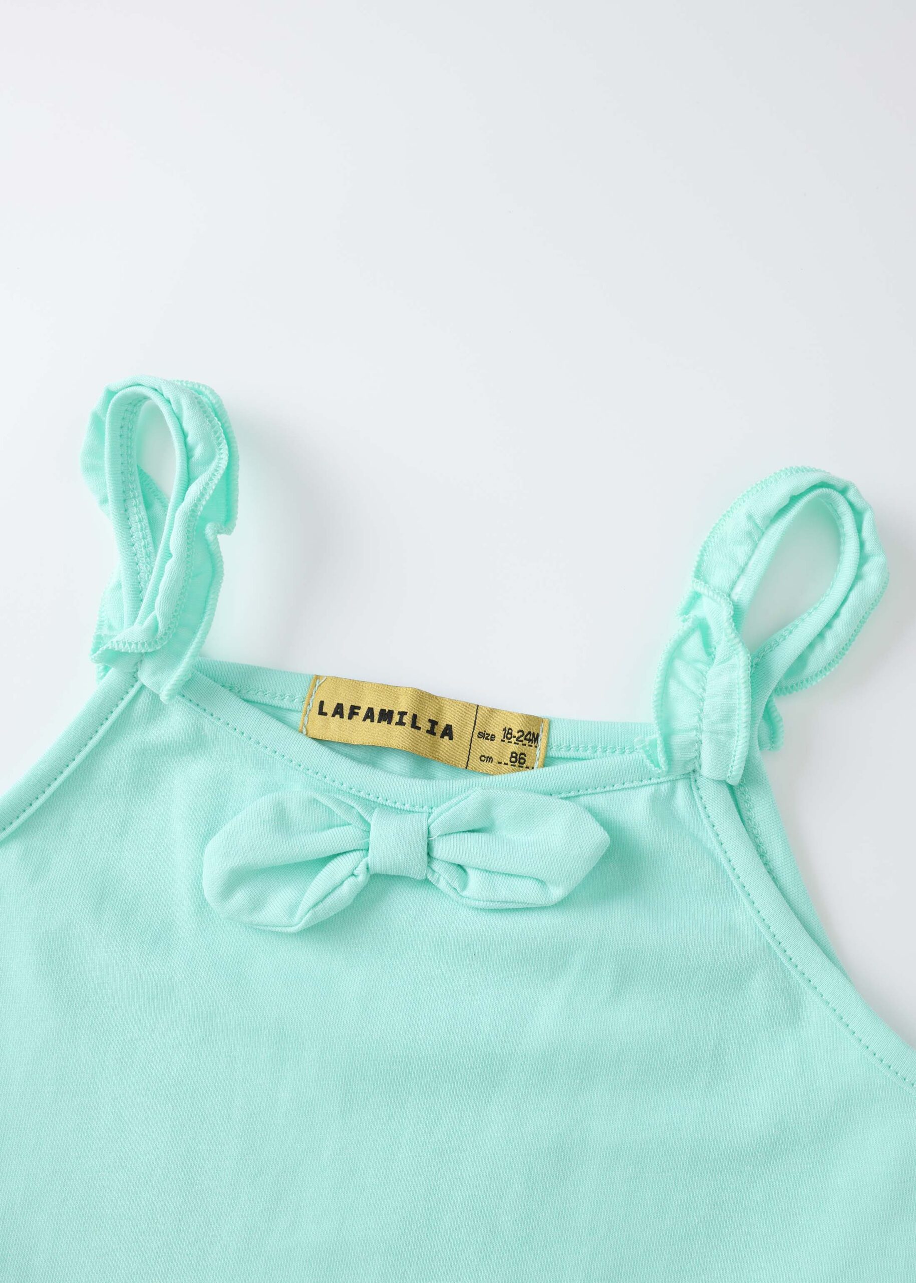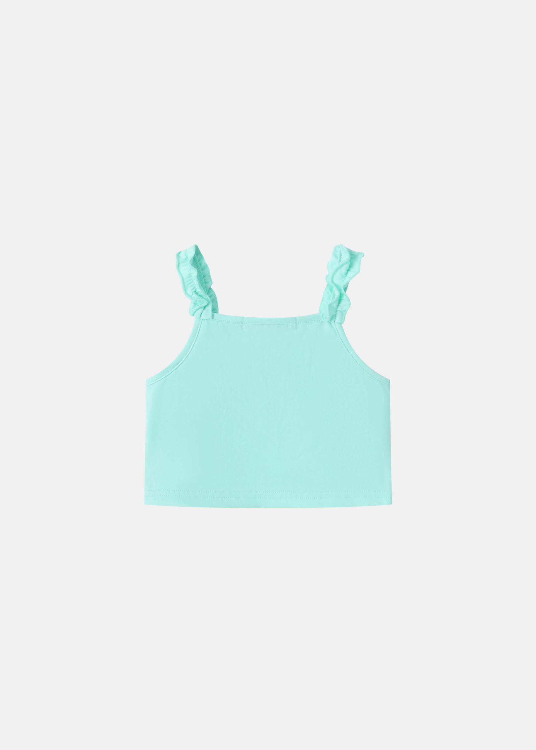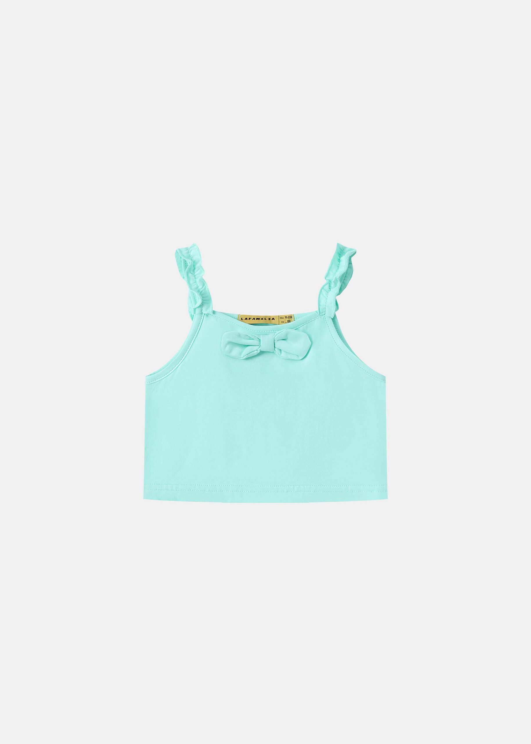 Baby girl pajama, two-pieces, top, cropped, sleeveless with ruffled shoulders strap, square neck, front bow decor, short, elastic waisth with side ruffled decor, practical and comfortable