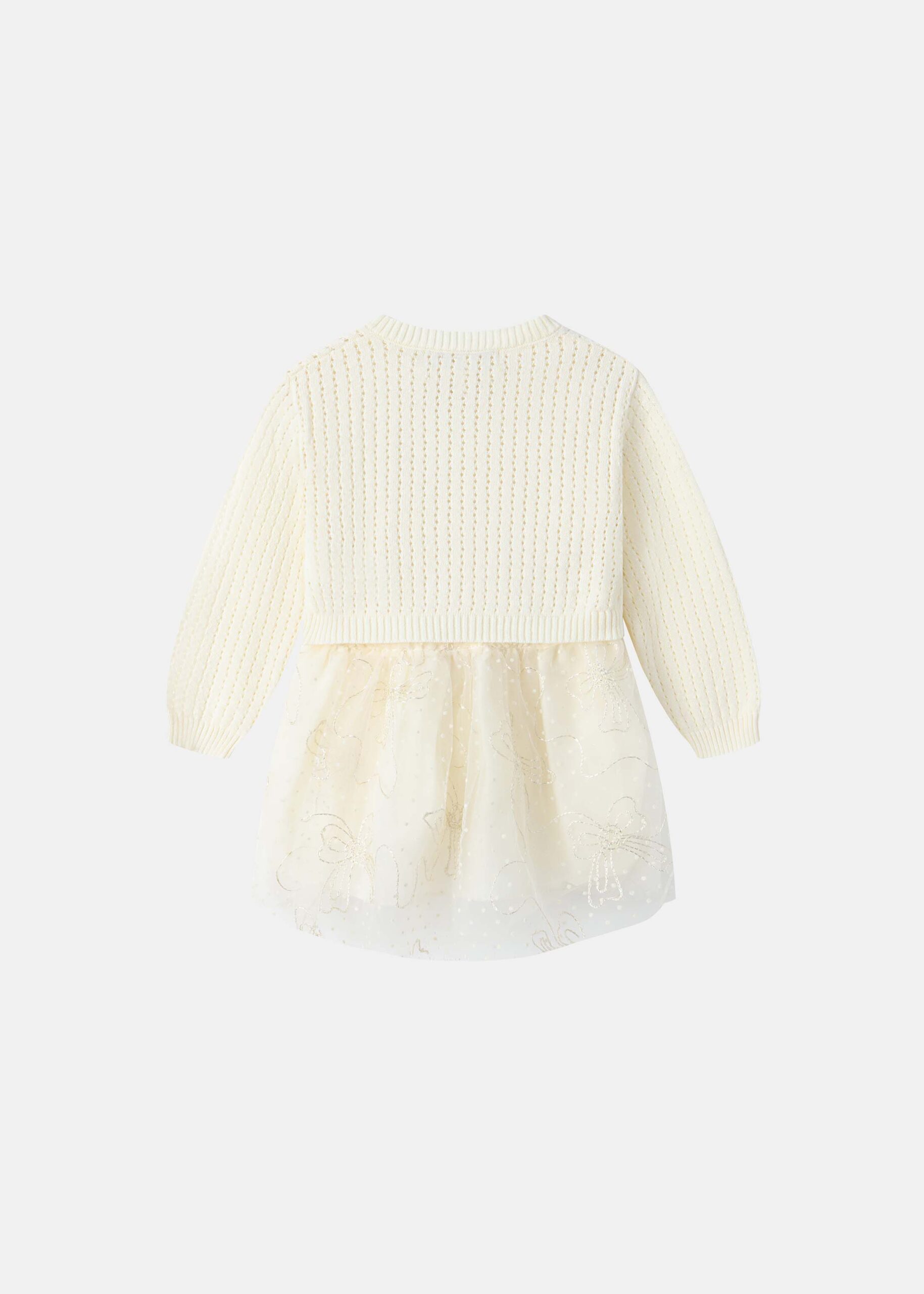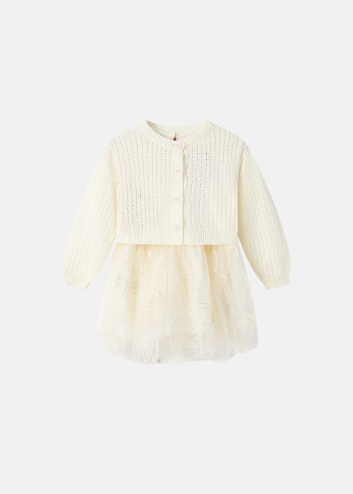 Baby girl set, two-pieces, dress, round neck with back button, short sleeves, flowers embroidered from the front, tulle skirt with embroidered and sequin decor, jacket, knitted, round neck, front buttons, long sleeves, unique and practical
