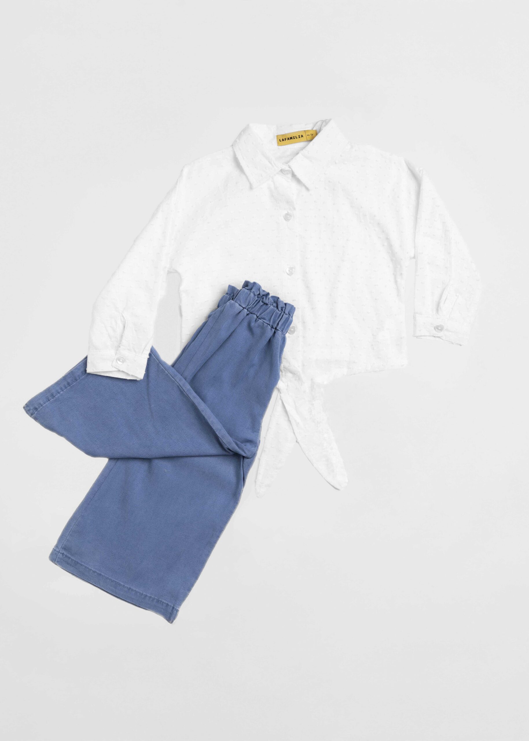 Baby girl suit, two-pieces, shirt, dotted, rolled collar, front buttons to close, long sleeves with tight cuff, front tie, trouser, flow, elastic waist, unique and modern