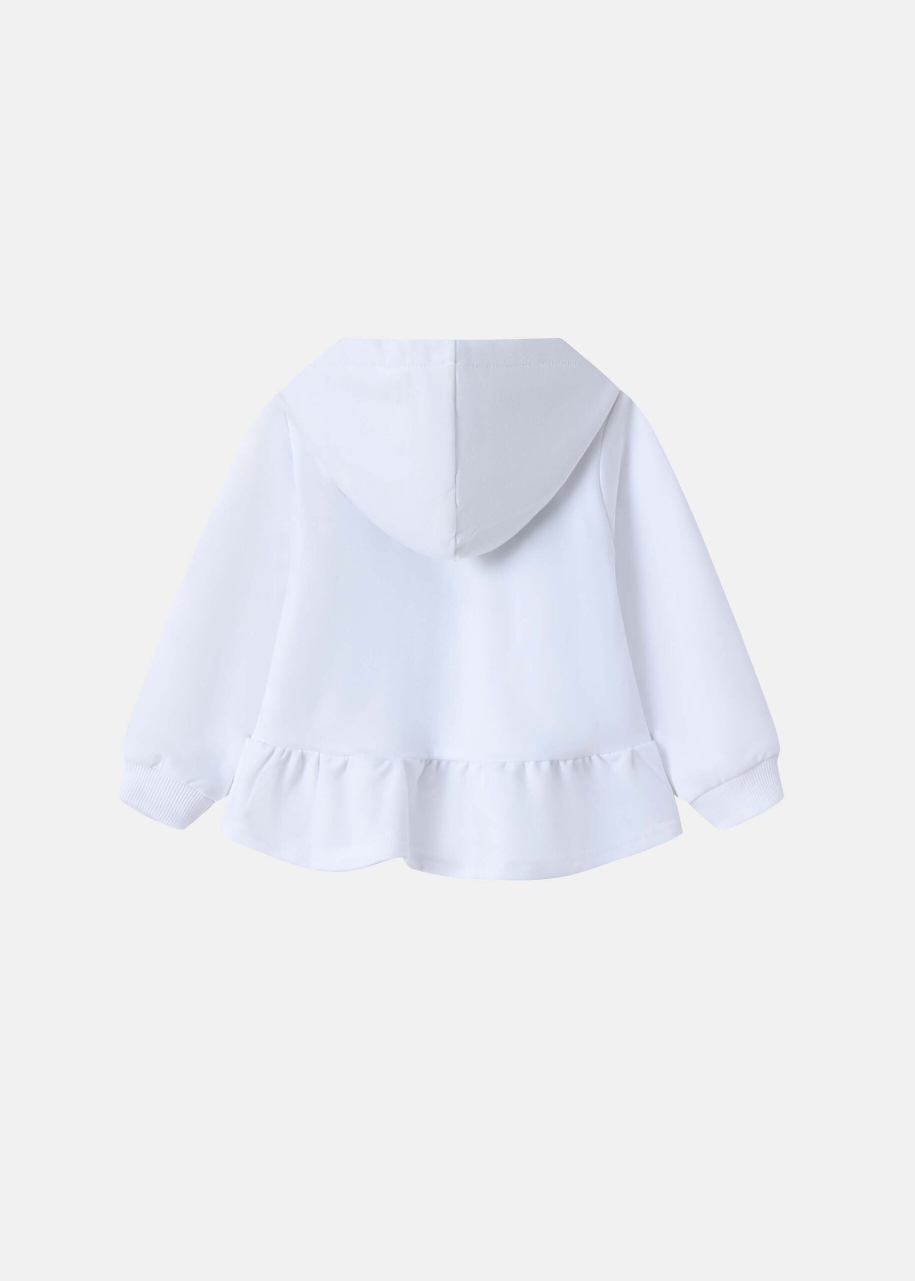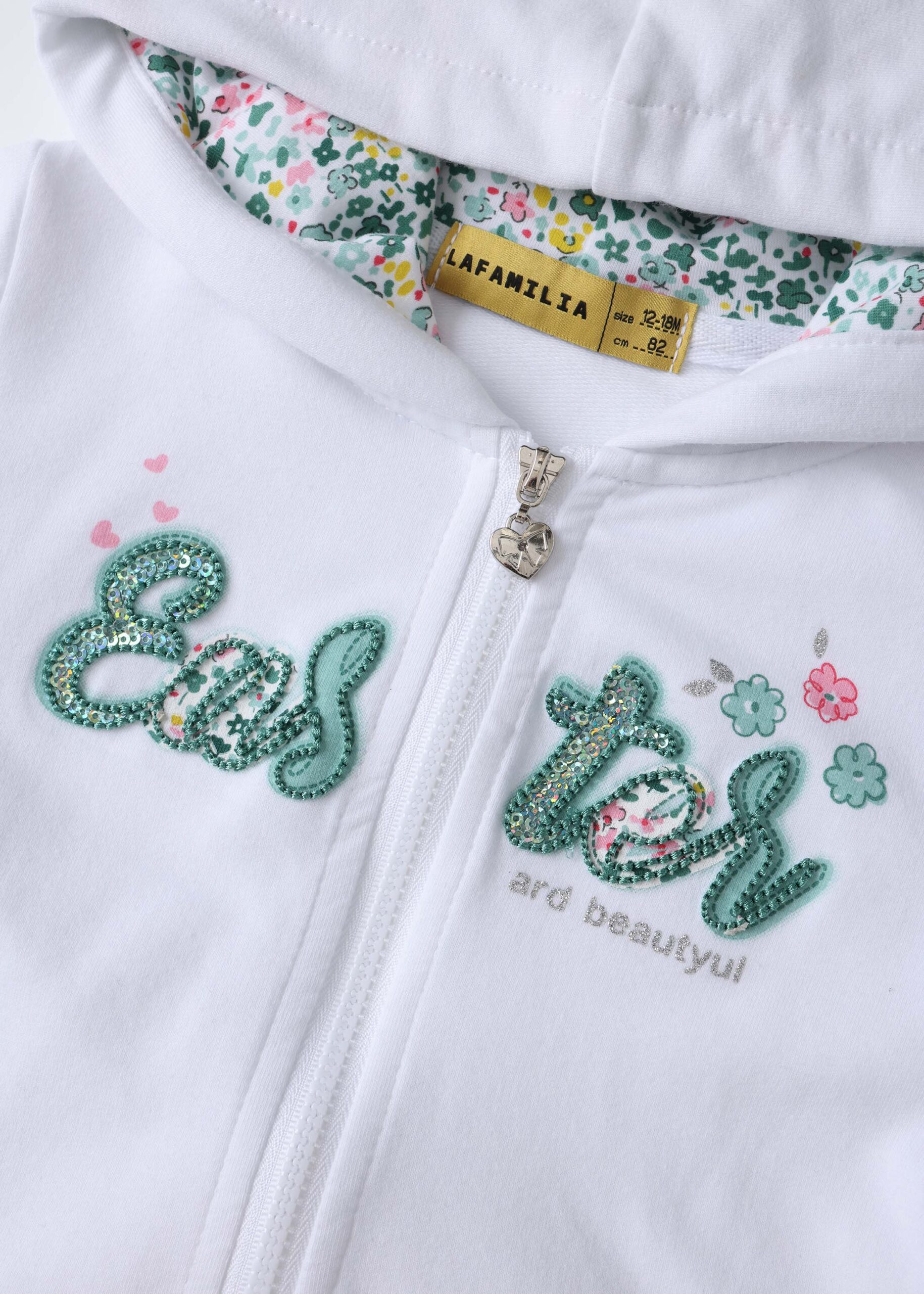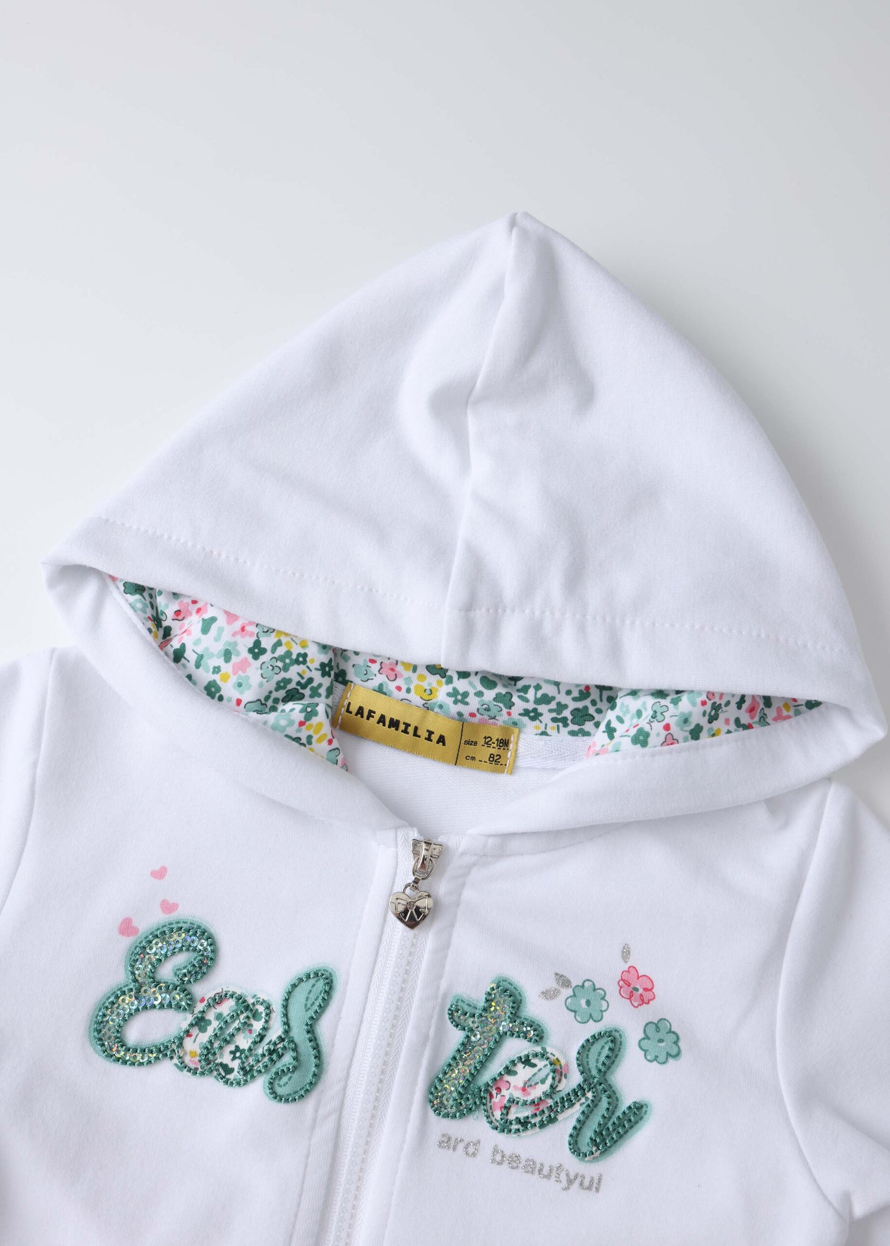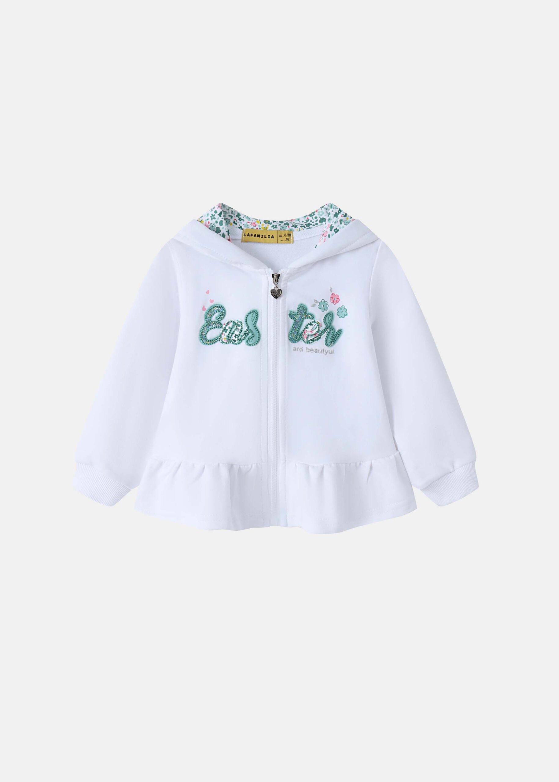 Baby girl suit, two-pieces, jacket, “Easter” printed from the front, floral hood, front zipper closure, long sleeves with tight cuff, ruffled layer, floral leggings, elastic waist, comfortable and practical